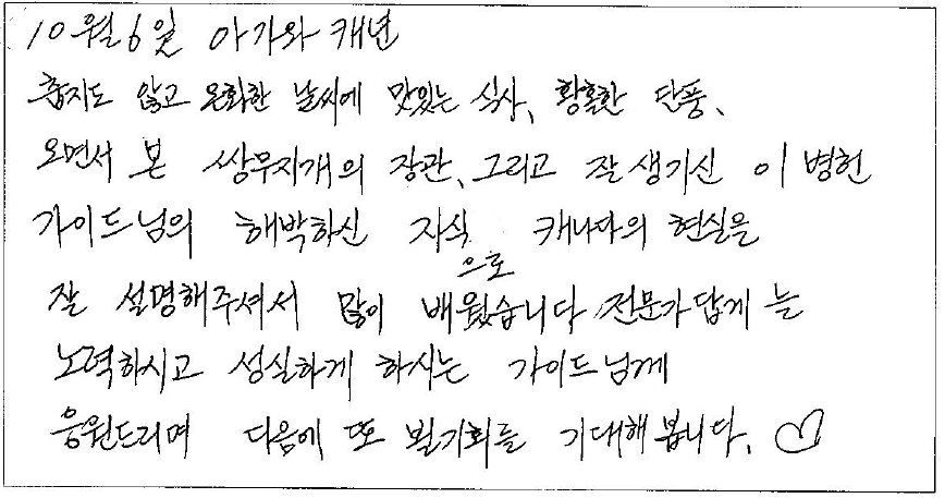 10월 6일 아가와 캐년, 춥지도 않고 온화한 날씨에 맛있는 식사, 황홀한 단풍, 오면서 본 쌍무지개의 장관, 그리고 잘생기신 가이드님의 해박하신 지식으로 캐나다의 현실을 잘 설명해 주셔서 많이 배웠습니다. 전문가답게 늘 노력하시고 성실하게 하시는 가이드님께 응원드리며 다음에 또 볼 기회를 기대해 봅니다. ♡