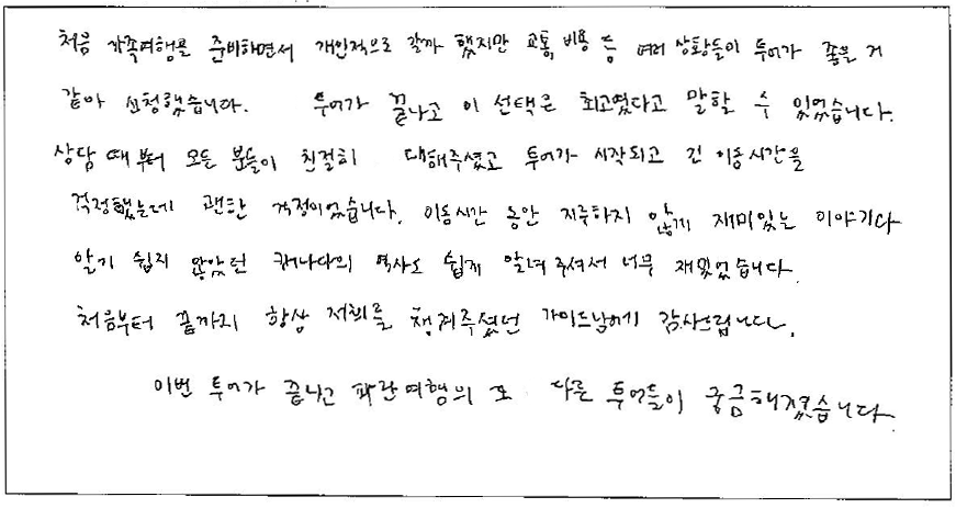 처음 가족여행을 준비하면서 개인적으로 갈까 했지만 교통, 비용 등 여러 상황들이 투어가 좋을 것 같아 신청했습니다. 이 선택은 최고였습니다. 모든 분들이 친절하셨고 이동 시간 동안 지루하지 않고 재밌었습니다.