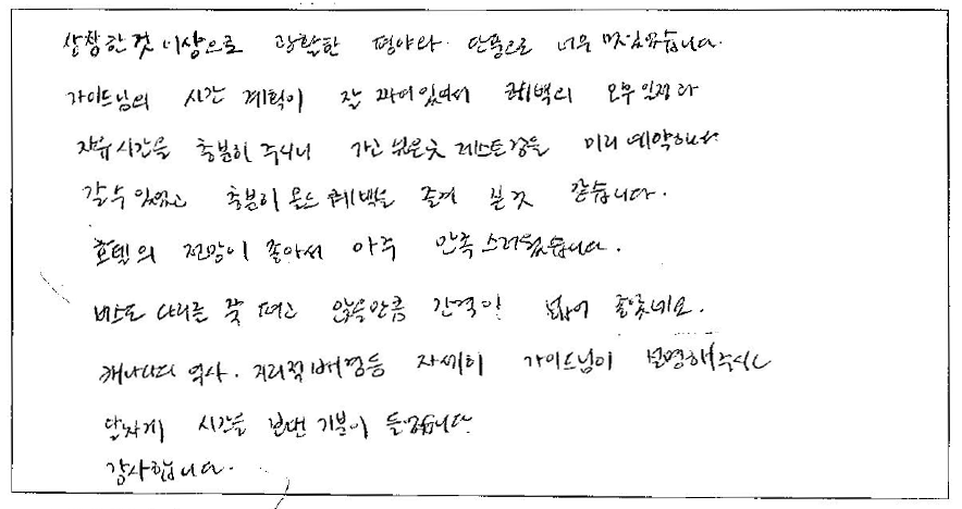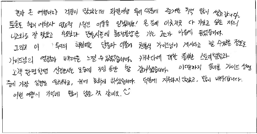 혼자 온 여행이라 걱정이 많았는데 '파란여행' 투어 덕분에 즐거운 추억 많이 쌓고 갑니다. 토론토 현지 여행사 압도적 1위인 이유를 알겠네요! 온 김에 이곳저곳 다 가보고 싶은 저의 니즈와도 잘 맞았고, 무엇보다 단풍 시즌에 몽트랑블랑을 가는 코스가 마음에 들었습니다. 그리고 이 투어의 핵심에는 단풍과 더불어 가이드님이 계시다고 할 수 있을 정도로 가이드님의 열정과 배려를 느낄 수 있었습니다. 캐나다에 대한 풍부한 스토리텔링과 고객 한 명 한 명 신경 쓰시는 모습에 3일 동안 잘 감사했습니다. 이때까지 들어본 가이드 설명 중에 가장 유쾌하고 귀에 꽂히게 하셨습니다. 덕분에 지루하지 않았고, 많이 배워갑니다. 이번 여행이 기억에 많이 남을 것 같네요.