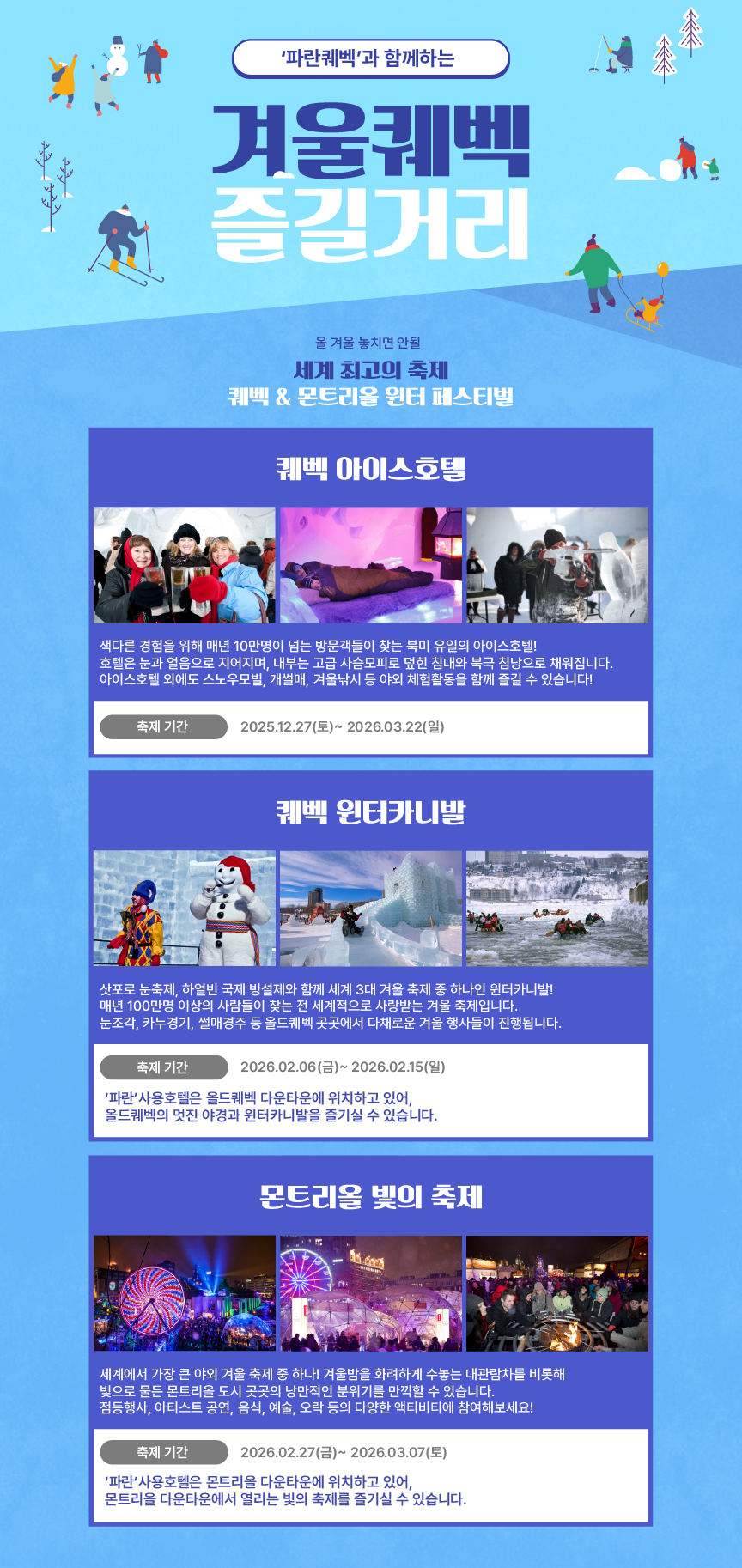퀘벡과 몬트리올 각각 다운타운 숙박으로 저녁시간 100% 활용 가능! ‘파란’에서만 가능!