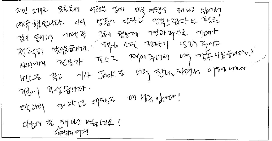지인 소개를 매개로 토론토에 여행 온 김에 미국 여행도 해보고 싶어서 예약했습니다. 이미 상품이 알차고 만족스럽다는 평은 많이 들어서 기대를 많이 했는데 결과적으로 기대가 정확히 맞았습니다. 행사 스팟 정확히 알려주시고 사진까지 전문가 포스로 찍어주셔서 너무 감동이었습니다.