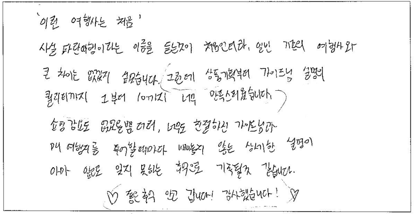 1부터 10까지 너무 만족스러웠습니다. 쇼핑 강요도 없었을뿐더러, 너무도 친절하신 가이드님의 상세한 설명이 아마 앞으로 잊지 못할 추억으로 기억될 것 같습니다. 좋은 추억 안고 갑니다! 감사했습니다!