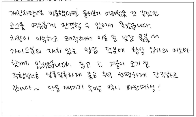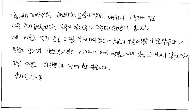 "너무 예쁘고 멋진 단풍, 그리고 날씨까지 도와 최고의 가을여행을 하고 왔습니다. 일정도 알차며 헌츠빌 지역의 아기자기 마을 탐방도 너무 힐링 그 자체였습니다. 다음 여행도 '파란여행'과 함께 하고 싶습니다. 감사합니다."