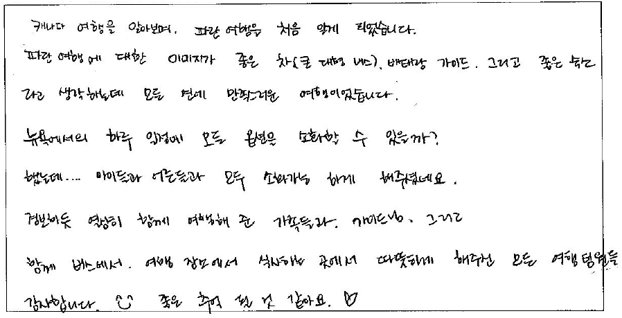 캐나다 여행을 알아보며 ‘파란여행’을 처음 알게 되었습니다. ‘파란여행’에 대한 이미지는 큰 대형 버스, 베테랑 가이드, 그리고 좋은 숙소라고 생각하는데 모든 면에서 만족스러운 여행이었습니다. 뉴욕에서의 하루 일정에 모든 옵션을 소화할 수 있을까 했는데, 아이들과 어른들 모두 소화 가능하게 해주셨네요.
