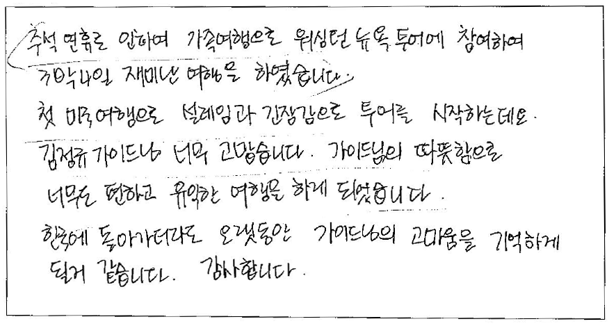 추석 연휴 가족여행으로 워싱턴, 뉴욕 투어에 참여하여 3박 4일 재미난 여행을 하였습니다. 첫 미국 여행이었는데요. 가이드님의 따뜻함으로 너무도 편하고 유익한 여행을 하게 되었습니다. 오랫동안 가이드님의 고마움을 기억하게 될 것 같습니다. 감사합니다.