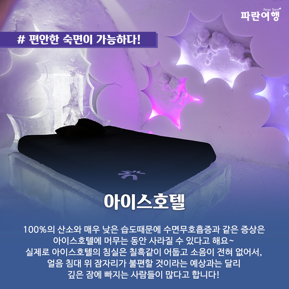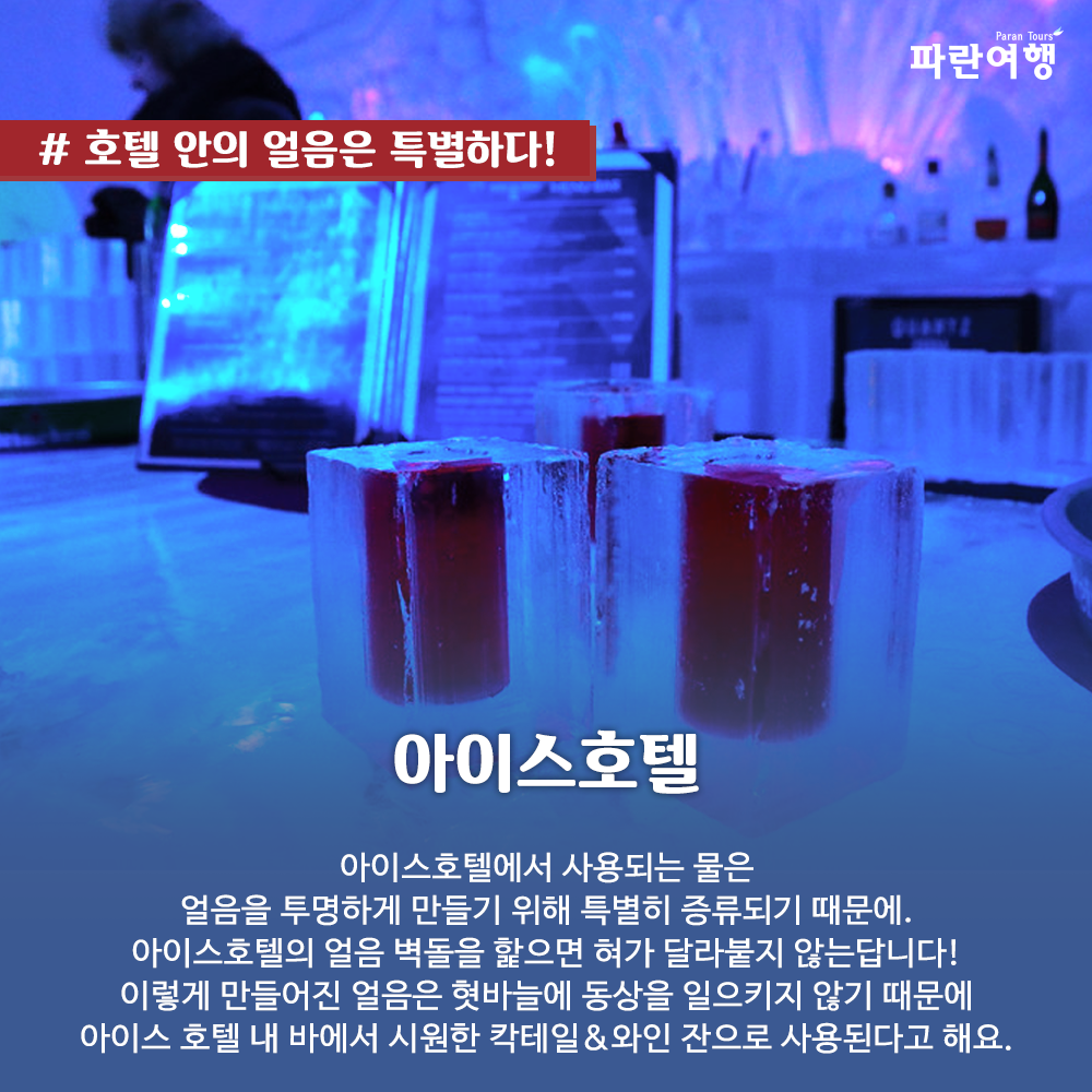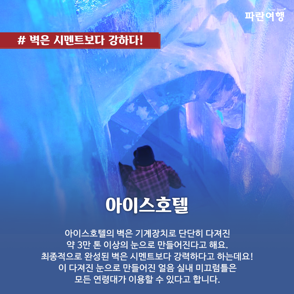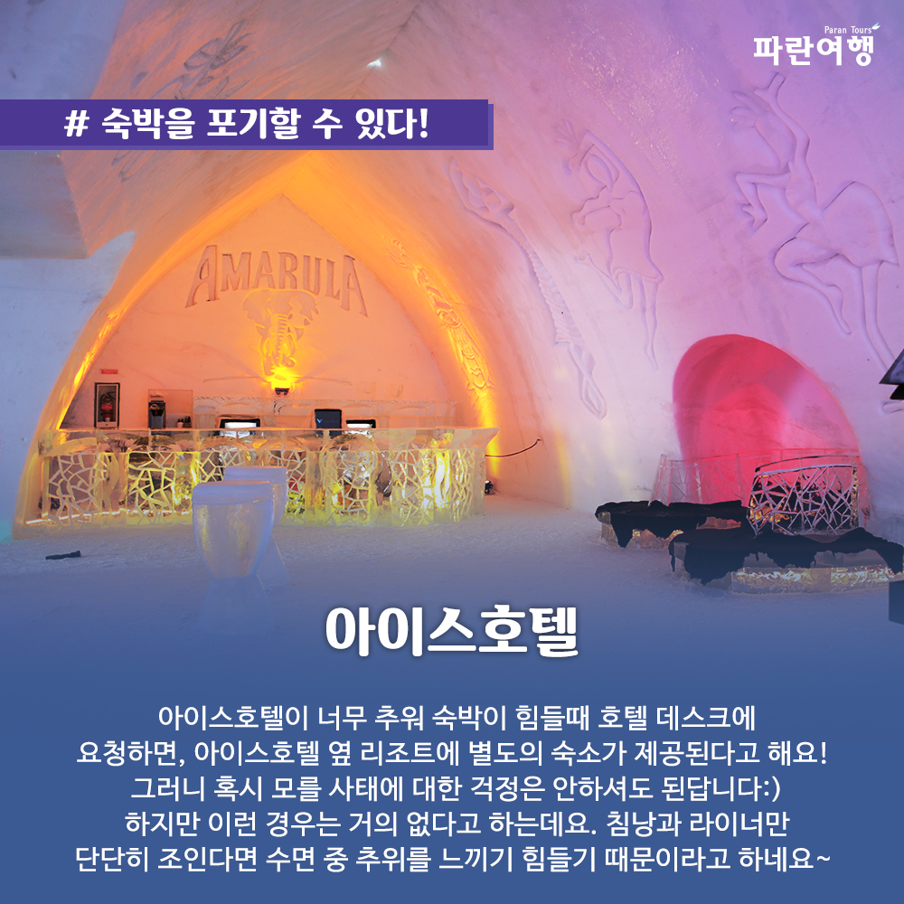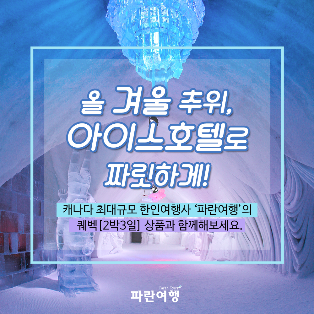 ![]() QUEBEC 퀘벡, 아이스호텔 ![]() 퀘벡에 위치한 북미 유일의 아이스호텔, Hotel de Glace! ![]() # 벽은 시멘트보다 강하다! 아이스호텔의 벽은 기계장치로 단단히 다져진 ![]() # 호텔 안의 얼음은 특별하다! 아이스호텔에서 사용되는 물은 ![]() # 편안한 숙면이 가능하다! 100%의 산소와 매우 낮은 습도때문에 ![]() # 숙박을 포기할 수 있다! 아이스호텔이 너무 추워 숙박이 힘들때 호텔 데스크에 요청하면, ![]() 올 겨울 추위, 캐나다 최대규모 한인여행사 '파란여행'의 퀘벡[2박3일] 상품과 함께해보세요. |