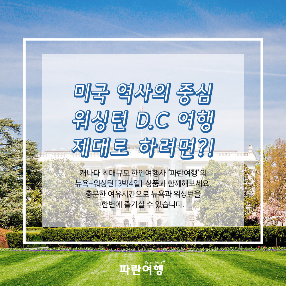 캐나다 최대규모 한인여행사 ‘파란여행’의 뉴욕+워싱턴[3박4일] 상품과 함께해보세요.