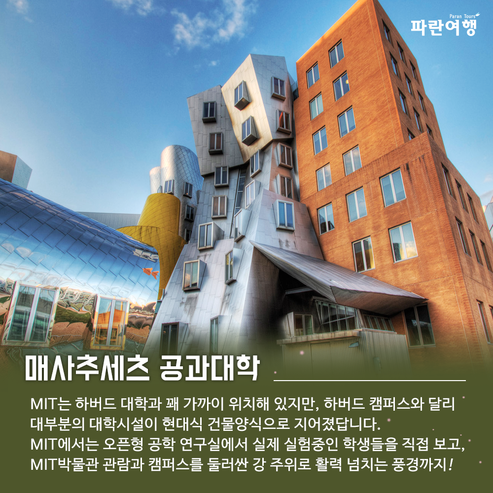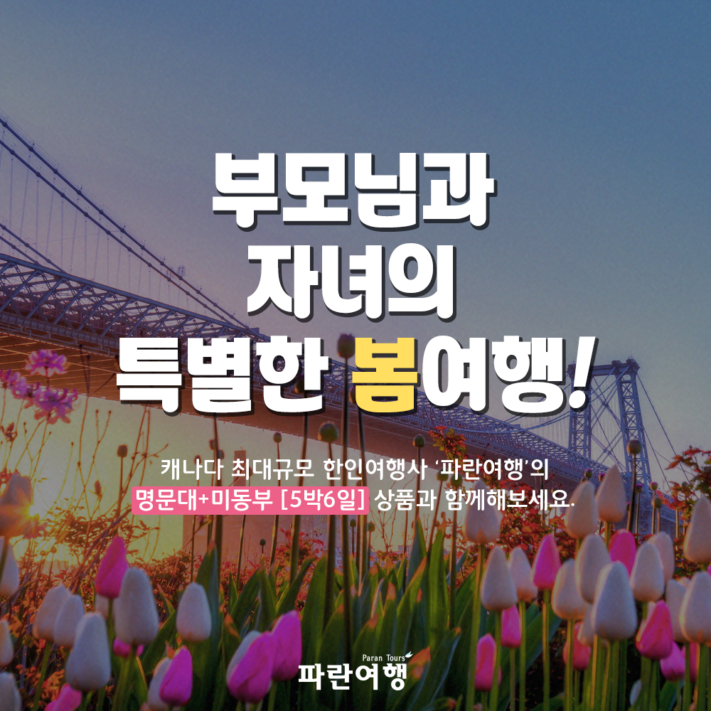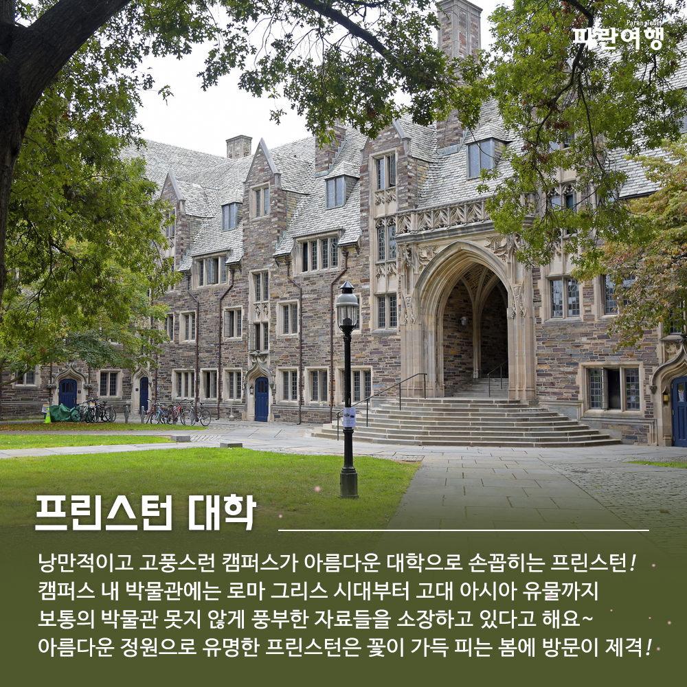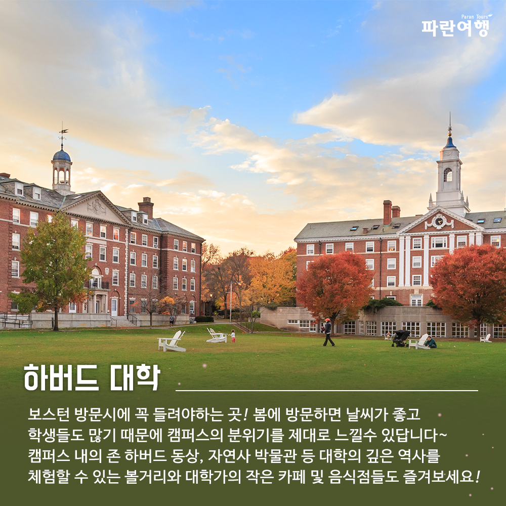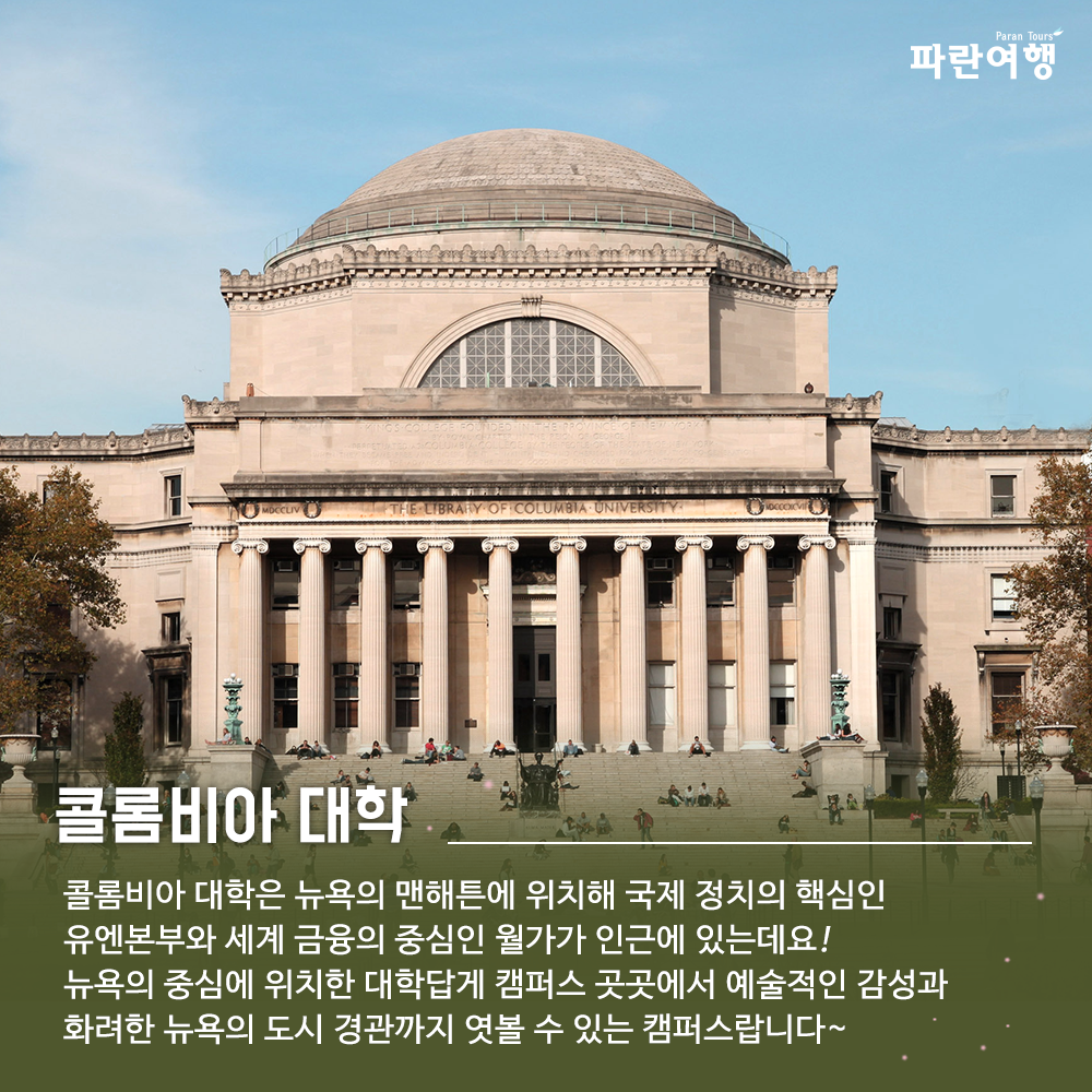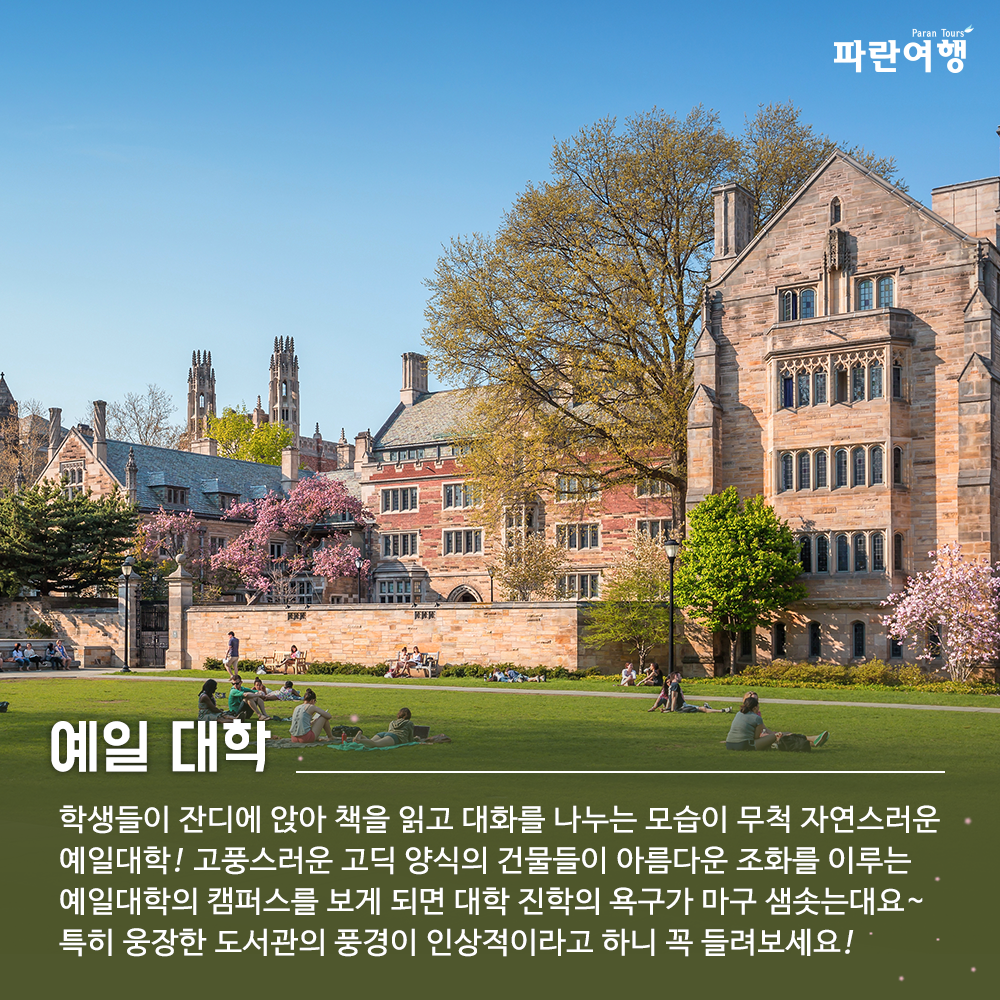 ![]() 아이비리그로 떠나는 미동부여행 ![]() # 하버드 대학 보스턴 방문시에 꼭 들려야하는 곳! 봄에 방문하면 날씨가 좋고 ![]() # 예일 대학 학생들이 잔디에 앉아 책을 읽고 대화를 나누는 모습이 무척 자연스러운 ![]() #매사추세츠 공과대학 ![]() #프린스턴 대학 낭만적이고 고풍스런 캠퍼스가 아름다운 대학으로 손꼽히는 프린스턴! ![]() #콜롬비아 대학 ![]() 부모님과 자녀의 특별한 봄여행! 캐나다 최대규모 한인여행사 ‘파란여행’의 명문대+미동부 [5박6일] 상품과 함께해보세요. 파란여행 홈페이지: www.parantours.com |
