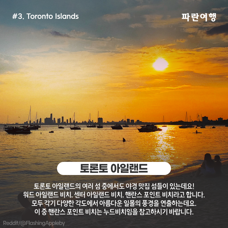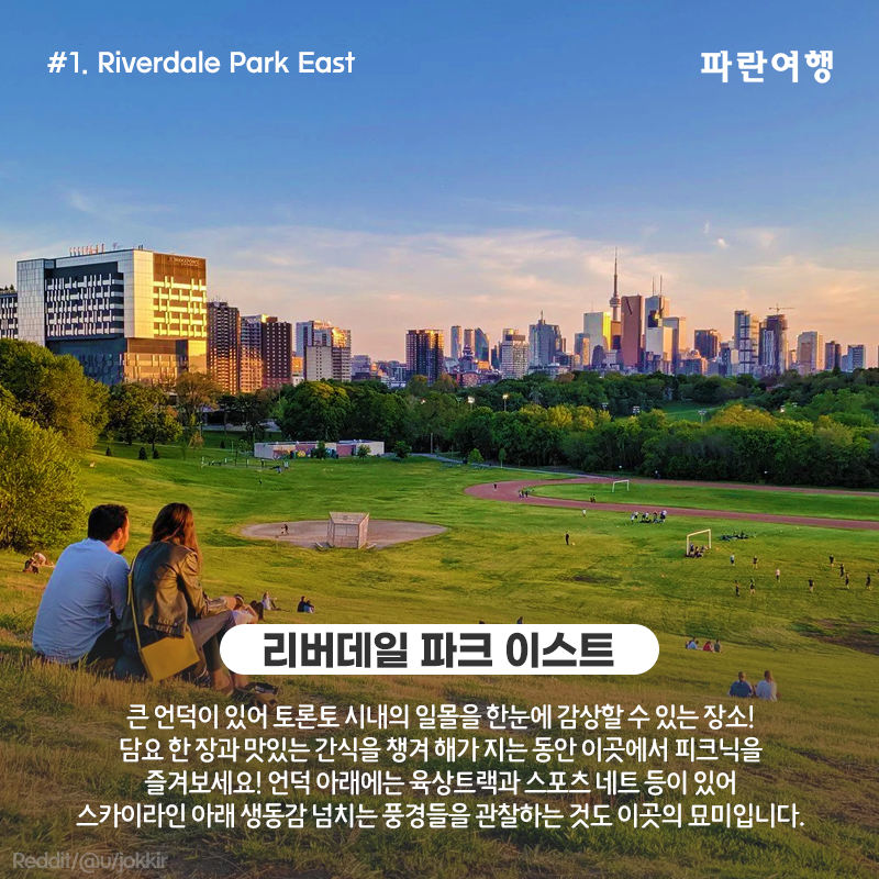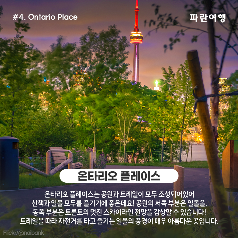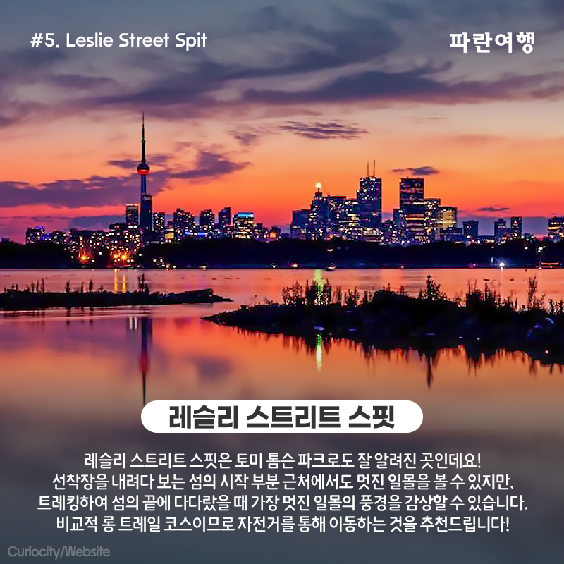 ![]() 낭만이 가득한 밤★ 토론토 야경명소 BEST5 ![]() #1. 리버데일 파크 이스트 큰 언덕이 있어 토론토 시내의 일몰을 한눈에 감상할 수 있는 장소! ![]() #2. 폴슨 피어 폴슨 피어는 토론토의 수많은 사진 작가들이 사랑하는 포토 스팟인데요. ![]() #3. 토론토 아일랜드 토론토 아일랜드의 여러 섬 중에서도 야경 맛집 섬들이 있는데요! ![]() #4. 온타리오 플레이스 온타리오 플레이스는 공원과 트레일이 모두 조성되어있어 ![]() #5. 레슬리 스트리트 스핏 레슬리 스트리트 스핏은 토미 톰슨 파크로도 잘 알려진 곳인데요! ![]() |