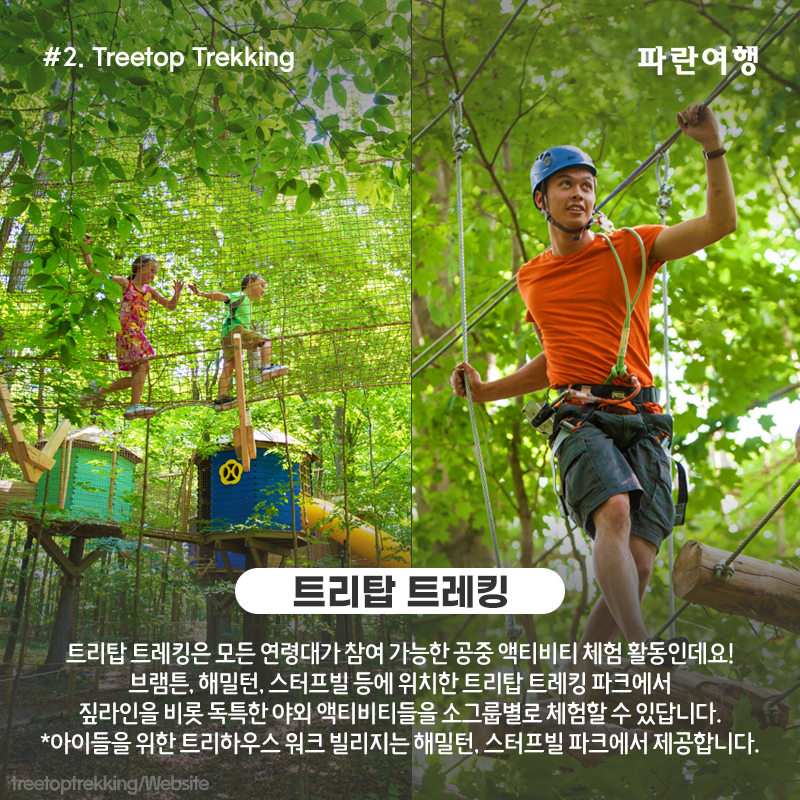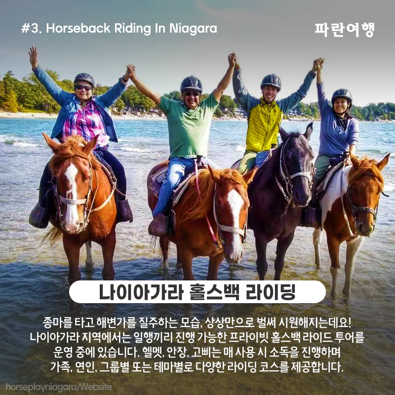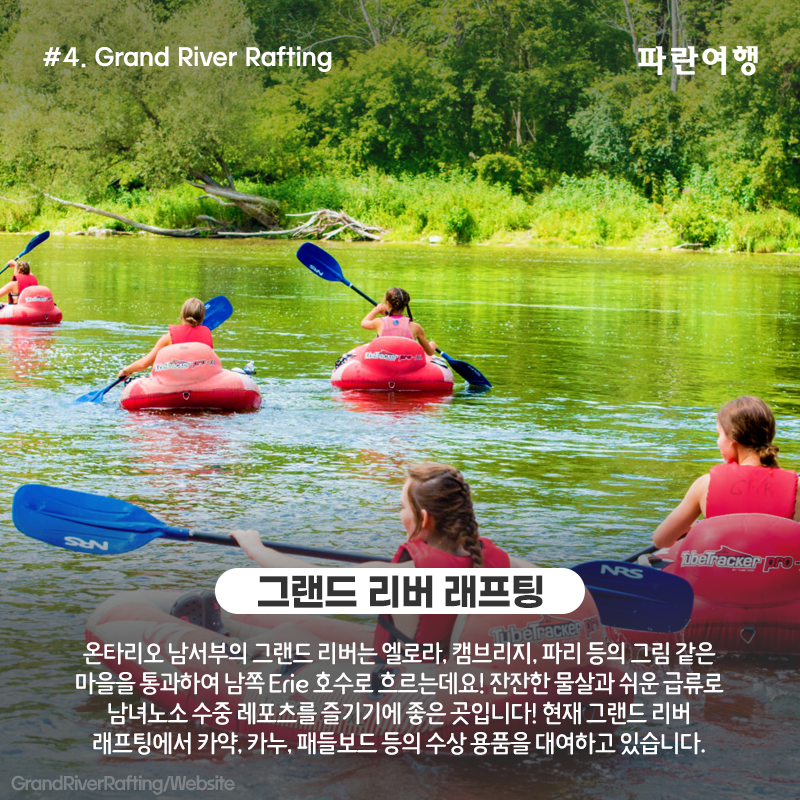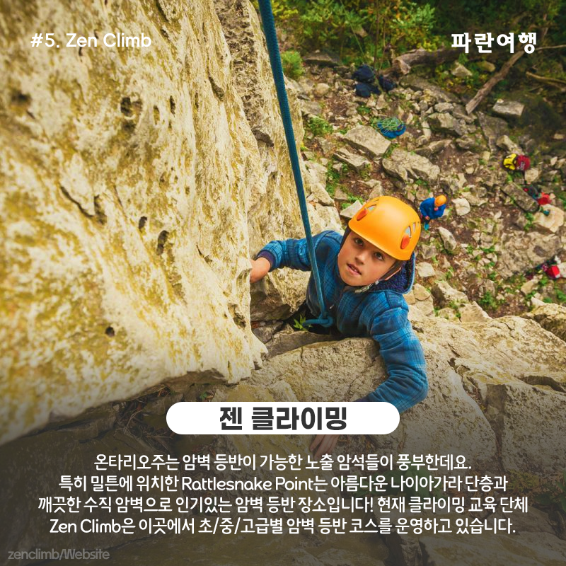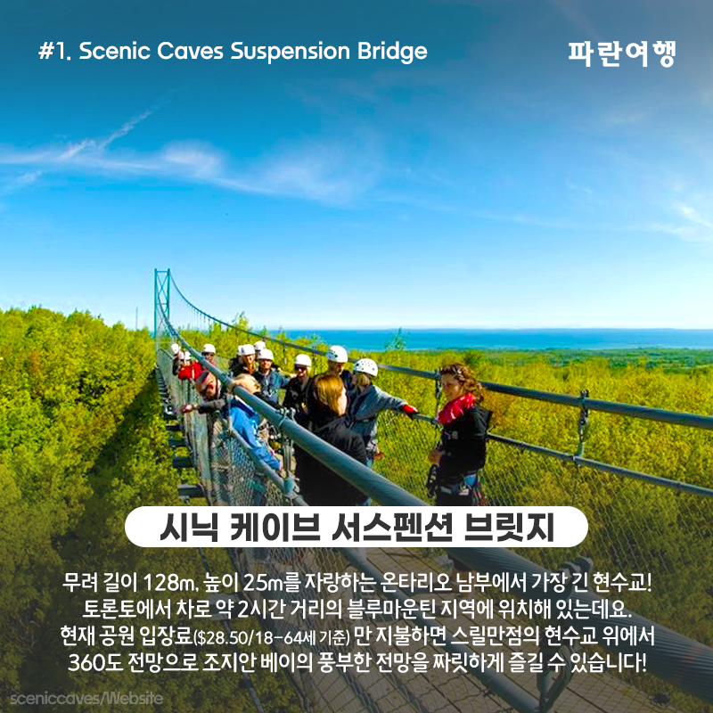 ![]() 답답함을 시원~ 하게 날려줄 ![]() #1. Scenic Caves Suspension Bridge 웹사이트: https://sceniccaves.com/ 무려 길이 128m, 높이 25m를 자랑하는 온타리오 남부에서 가장 긴 현수교! ![]() #2. Treetop Trekking 웹사이트: https://treetoptrekking.com/ 트리탑 트레킹은 모든 연령대가 참여 가능한 공중 액티비티 체험 활동인데요! ![]() #3. Horseback Riding In Niagara 웹사이트: https://www.horseplayniagara.com/ 종마를 타고 해변가를 질주하는 모습, 상상만으로 벌써 시원해지는데요! ![]() #4. Grand River Rafting 웹사이트: https://grandriverrafting.ca/ 온타리오 남서부의 그랜드 리버는 엘로라, 캠브리지, 파리 등의 그림 같은 마을을 통과하여 ![]() #5. Zen Climb 웹사이트: http://www.zenclimb.com/ 온타리오주는 암벽 등반이 가능한 노출 암석들이 풍부한데요. ![]() |
