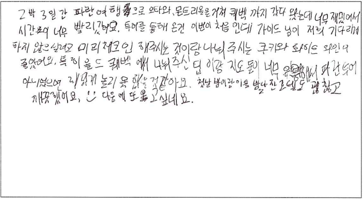 제목 | 2022년03월15일 출발한 퀘벡 2박3일 자필후기 | ||