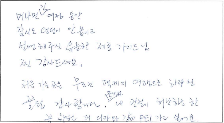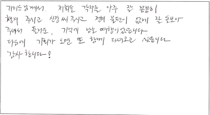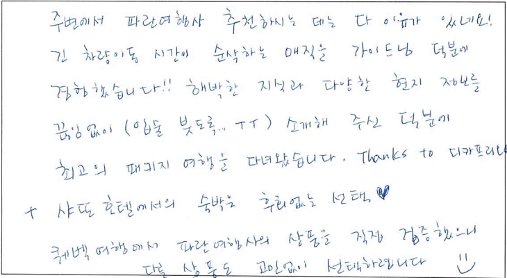 ![]() 주변에서 파란여행 추천하시는 데는 다 이유가 있네요! 차량이동 시간이 순삭하는 매직을 가이드님 덕분에 경험했습니다ㅣ!! 해박한 지식과 당댱한 현지 정보를 끊임최고의 패키지여행을 다녀왔습니다. 퀘벡여행에서 파란여행의 상품을 직접 검증했으니 다른 상품도 고민없이 선택하렵니다'-' ![]()