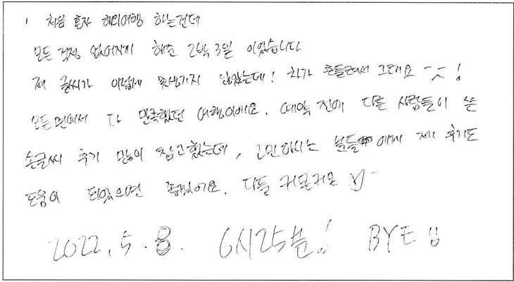 제목 | 2022년05월06일 출발한 퀘벡 2박3일 자필후기 | ||