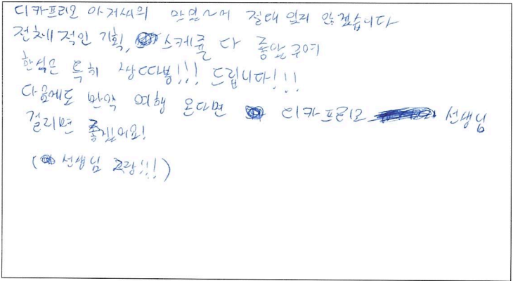 ![]() 머나먼 긴 여정동언 잠시도 엉덩이 안 붙이고 설명해주신유능한 제롬 가이드님 찐 감사드려요. 처음 가는 곳은 무조건 패키지 여행으로 하라신 꿀팁 감사합니다. 죽기전 내 관절이 허락하는 한 꼭 한번 더 디카와 같이 PEI 가고 싶어요. ![]() 디가프리오 아저씨의 맛있~어 절대 잊지 않겠습니다. 전체적인 기획, 스케줄 다 좋았구여 ![]() 가이드님께서 저희들 각자를 아주 잘 꼼꼼히 챙겨 주시고 신경써 주시고 전혀 불편이 없게 잘 돌보아 주셔서 ![]() 버스 기사의 운전실력이 훌륭함. 가이드의 가이드 실력과 설명이 훌륭함. ![]() 가이드님의 소개가 가장 인상 깊었답니다. 역사를 좋아하는 제겐 참 뜻깊은 시간이었어요. ![]() 매우 만족스러운 여행이었습니다, |