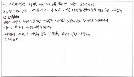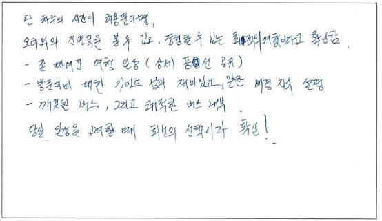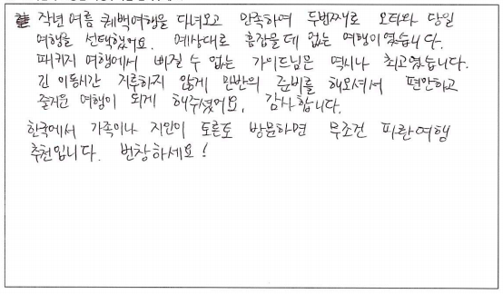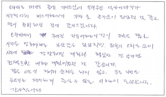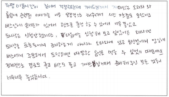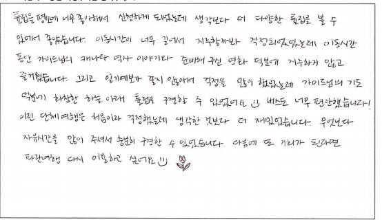 ![]() 단 하루의 시간이 허용된다면, 오타와의 진면목을 볼 수 있고, 경험할 수 있는 최적의 여행이었다고 확신함. -잘 짜여진 여행 일정(상세 동선 공유) -방문지에 대한 가이드 님의 재미있고 알찬 배경지식 설명 -깨끗한 버스, 그리고 쾌적한 버스 내부 당일 일정을 고려할 때 최선의 선택이라 확신! ![]() 튤립을 평소에 너무 좋아해서 신청하게 되었는데 생각보다 더 다양한 튤립을 볼 수 있어서 좋았습니다. 이동시간이 너무 길어서 지루할까봐 걱정되었었는데 이동시간 동안 가이드님의 캐나다 역사 이야기와 준비해 주신 영화 덕분에 지루하지 않고 즐거웠습니다. 그리고 일기예보가 좋지 않아서 걱정을 많이 했는데 가이드님의 기도 덕분에 화창한 하늘 아래 튤립을 구경할 수 있었어요 :) 버스도 너무 편안했습니다.! 이런 단체 여행은 처음이라 걱정했는데 생각한 것보다 더 재미있었습니다. 무엇보다 자유시간을 많이 주셔서 충분히 구경할 수 있었습니다. 다음에 또 기회가 된다면 파란여행 다시 이용하고 싶어요 :) ![]() 차량이동시간이 길어서 걱정했는데 가이드님께서 재미있는 오타와와 튤립에 관련된 이야기를 너무 열정적으로 해주셔서 시간 가는 줄도 몰랐어요. 버스안에 콘센트가 있어서 핸드폰 충전 할 수 있어서 너무 좋았고 도시락은 신청 안했지만, 다음에는 신청해 보고 싶었어요. 왜냐면 도시락을 토론토에서 준비하는게 아니라 오타와에 있는 음식점에서 당일에 버스에서 주문해서 도착하면 따뜻한 음식을 먹을 수 있었기 때문에요. 전체적으로 경로도 좋고 버스도 좋고 가이드님께서 준비해주신 모든 것들이 너무너무 좋았습니다. ![]() 큰 불편함없이 이동하였고 날씨 때문에 걱정했는데 날씨도 좋아서 너무 좋았습니다. 도시락을 구매하지 않았지만 먹어볼걸 후회가 되네요, 전날에 도시락 준비하느라 시간이.. 그냥 편히 여행다녀오려면 도시락도 괜찮은 듯 해요,. 사진 스팟도 잘 알려주시고 좋은 추억거리 많이 만들고 돌아갑니다. 가이드님 너무 재미있고 친절해서 모든것이 좋았습니다. ![]() 긴 이동시간동안 재미를 주신 가이드분 덕분에 힘들지 않았습니다. 튤립축제 행사장은 가이드분 설명을 듣고 큰 기대를 내려놓고 봐서인지 적은 꽃도 아름답게 잘 보았습니다. 연방의사당은 보수중이였지만 그 위엄을 잘 느낄 수 있었고 운하와 전정기념기까지 재미난 볼거리고 즐거운 시간이었습니다. 가이드분의 설명으로 여행의 질을 더 높혀서 즐거운 여행을 했습니다. 감사합니다. ![]() 안녕하세요, 오늘 처음으로 오타와 튤립 여행을 왔어요. 날씨가 비, 천둥이 있다고 해서 걱정을 많이 했는데 가이드 본드씨가 비를 안오게 해서 좋은 날 기분좋게 오타와 튤립축제를 보고 갑니다. 본드씨의 해박한 캐나다의 역사와 전설을 자세히 설명해 줌으로 역사를 좀 더 알고가는 기회가 됐구요, 캐나다 지폐에 나오는 인물들을 소개하고 지폐에 나오는 그림들을 자세히 설명해줌으로 새로운 지식을 터득하고 즐거운 하루가 되었습니다. 감사합니다. ![]() 2022. 5. 21 오타와 여행, 좋은 시간이었습니다. 가이드님이 캐나다의 돈의대해 설명해서 많이 배웠습니다. 똑똑한 가이드님의 설명에 국회의사당을 다시 배우고 공부했습니다. 튤립 구경의 아름다움, 멋진하루가 되었씁니다. 좋은 차에다 차분한 기사양반, 감사했습니다. 고맙습니다. ![]() 작년 여름 퀘벡여행을 다녀오고 만족하여 두번째로 오타와 당일 여행을 선택했어요. 예상대로 흠잡을데 없는 여행이었습니다. 패키지 여행에서 빠질 수 없는 가이드님은 역시나 최고였습니다. 긴 이동시간 지루하지 않게 만반의 준비를 해오셔서 편안하고 즐거운 여행이 되게 해주셨어요. 감사합니다. 한국에서 가족이나 지인이 토론토 방문하면 무조건 파란여행 추천입니다. 번창하세요! ![]() 오타와로 떠나는 중에 가이드님이 들려주신 역사 이야기가 지루할만한 버스여행에서 가장 큰 즐거움이 되었던것 같고 많이 준비하신 것에 감사드립니다. 오타와에서 주어진 자유여행 시간이 조금은 짧고 시간을 맞춰여 하는 부담감은 있었지만 한치의 오차도 없이 시간에 잘 맞추어진 계획과 핵심만 잘 골라낸 컴팩트한 여행 계획이었던것 같습니다. 짧은 시간에 장거리 운전을 하지 않고 푸른지면을 눈요기로 편안하게 즐길 수 있는 여행이 되었습니다. 감사합니다. |