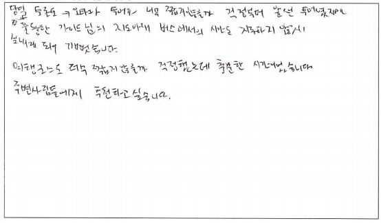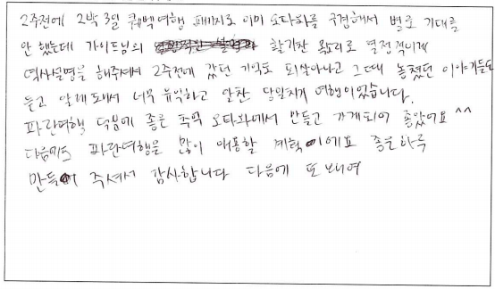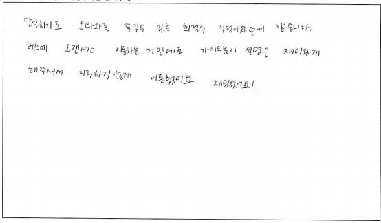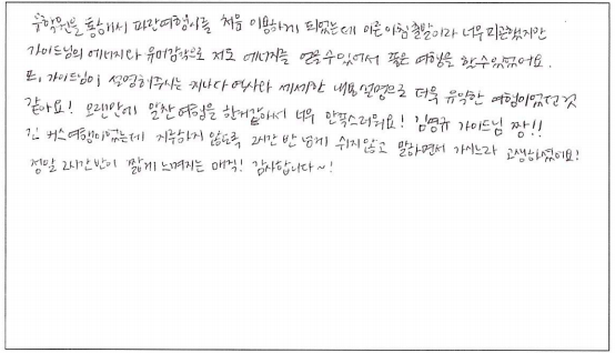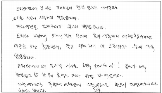 ![]() 첫 파란여행 너무 재밌었어요. 가이드가 있는 여행은 항상 지루하고 바쁘기만 한 여행이라고 생각이 많이 들어서 이용하지 않았었는데 이번을 계기로 파란여행을 믿고 이용할것 같아요, 가이드분이 굉장히 재밌는 맨트들과 이야기들로 오고가는 시간이 지루하지 않게 해주셔서 더 만족스러웠어요! 궁금했던 역사들의 이야기도 많이많이 들려주셔서 지식도 쌓아가는 좋은 여행이었어요. 다음 파란여행이 기다려지네요 :) ![]() 가이드님의 열정이 여행을 더 알차게 만들어서 좋았아요:) 파란하늘 아래, 난 지금 파란여행과 여행중이라서 너무 행복합니다. ![]() 2주전에 2박3일 퀘벡여행 패키지로 이미 오타와를 구경해서 별로 기대를 안했는데 가이드님의 활기찬 목소리로 열정적이게 역사설명을 해주셔서 2주전에 갔던 기억도 되살아나고 그때 놓쳤던 이야기들도 듣고 알게되서 너무 유익하고 알찬 당일치기 여행이었습니다. 파란여행 덕분에 좋은 추억 오타와에서 만들고 가게되어 좋았어요^^ 다음에도 파란여행을 많이 애용할 계획이에요. 좋은 하루 만들어 주셔서 감사합니다. 다음에 또 뵈요. ![]() 당일치기로 오타와를 즐길 수 있는 최적의 일정이었던 것 같습니다. 버스에 오랜시간 이동하는 것인데요 가이드 분이 설명을 재미있게 해주셔서 지루하지 않게 이동했어요. 재밌었어요! ![]() 당일 토론토-> 오타와 투어가 너무 짧지 않을까 걱정부터 앞선 투어였지만 휼륭한 가이드님의 지도아래 버스에서의 시간도 지루하지 않게 보내게 되어 기뻤습니다. 여행코스도 너무 짧지 않을까 걱정했는데 충분한 시간이었습니다. 주변사람들에게 추천하고 싶습니다. ![]() 왕복이동시간 (토론토 출발) 9~10시간의 장거리 당일 여행이었음에도 이동시 지루함을 느낄틈을 주지 않는 가이드님의 재미있는 캐나다 역사 이야기와 지폐 이야기는 이번 여행에서 튤립보다 더 오래 기억에 남을 것 같습니다. 앞으로 더 좋은 여행 기대하겠습니다. ![]() 가이드 분 덕에 긴 이동시간 동안 웃으면서 갔어요. 차량도 편했어요! 휴일에 오타와 구경 잘 하면서 마무리 했어요. 감사합니다. :) ![]() 당일치기 여행이라 버스에서 보내는 시간이 많았지만, 가이드님의 재미있는 설명 덕분에 지루하지 않게 보낼 수 있었습니다. 가이드님 덕분에 캐나다의 역사와 지폐 상식들까지. 파란을 통해 가지 않았으면 몰랐을 사실들을 많이 알게 되었어요, 자칫하면 지루할 뻔한 여행에 생기를 불어넣어 주신 가이드님, 다음여행도 함께 갈 수 있으면 좋겠습니다!! ![]() 오타와까지의 긴 시간 가이드님의 텐션 넘치는 가이딩으로 오가는 시간이 지루하지 않았습니다. 파란여행은 강제구매가 없어서 편했습니다. 오타와 history 전해 들으며 혼자, 가족끼리 여행했더라면 이만큼 모르고 했을텐데, 알고 여행하니 더 오타와가 눈에 가득 담겼습니다. 오타와에서의 도시락 식사는 너무 Perfect! 김치가 너무 맛있었고 밥 한공기 못 먹는 제가 밥을 다 먹었어요. 파란여행으로 두번째 여행인데 다음 뉴욕여행도 반드시 파란여행으로 하려고 합니다. ![]() 유학원을 통해서 파란여행을 처음 이용하게 되었는데 이른 아침 출발이라 너무 피곤했지만 가이드님의 에너지와 유머감각으로 저도 에너지를 얻을 수 있어서 좋은 여행을 할 수 있었어요. 또 가이드님이 설명해주시는 캐나다 역사와 세세한 내용설명으로 더욱 유익한 여행이었건 것 같아요! 오랜만에 알찬여행을 한거 같아서 너무 만족스러워요! 가이드님 짱!! 긴 버스 여행이었는데 지루하지 않도록 2시간 반 넘게 쉬지않고 말하면서 가시느라 고생하셨어요! 정말 2시간 반이 짧게 느껴지는 매직! 감사합니다~! ![]() 멀미가 심해 길게 적지 못합니다만, 가이드 분께서 정말 열정적이였고 유머스러워서 긴 버스 탑승시간에도 지루하지 않게 올 수 있었습니다. 처음 가보는 오타와였지만 이모저모 가이드분께서 알려주셔서 알차게 보고갑니다. 다녀온 북미여행중에서 자강 지루할 틈이 없었던 여행이었습니다. 감사합니다.^^ |