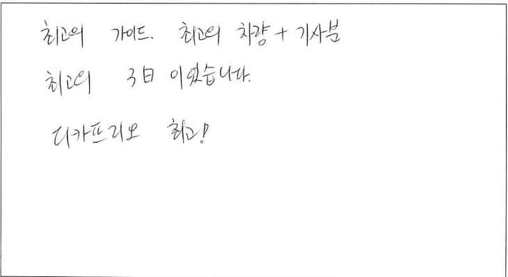 ![]() 여름이 시작하는 6월 아름다운 퀘벡으로 여행을 떠났어요. 파란여행은 탁월한 선택 이었답니다. 처음 상담부터 친절했고 중간중간 안내도 선명했습니다. 도시는 아름다웠고 가이드님도 재미있으시고 열정적 이셨어요. 가이드님의 특유의 억양은 계속 생각날 것 같아요. 여행 내내 즐겁고 행복했습니다. 밥은 맛있어~ 가이드님은 멋있어~ 따라하는 우리 때문에 울 가이드님 미치겠어~ 아시는 분들은 아시겠죠? 너무나 즐거운 여행 감사했습니다. 덕분에 아들과 좋은 기억 담아갑니다. ![]() 스케줄, 시간분배, 모든것이 완벽했던 여정이었습니다. 아무것도 안 알아보고 왔던 제가 안알아봤던걸 후회 할 만큼, 너무도 즐겁고 유익했습니다! 아무래도 다음에 또 이곳을 방문하게 된다면 좀거 많은 날을 함께하길 계획할것 같습니다. 2빅3일간 좋은 정보, 즐거운 시간으로 가득채워 주셔서 감사드리고 또 감사드립니다. -! ![]() 패키지 여행은 처음이라 일정대로 움직여야 하는 부분이 저에게 조금은 불편하지 않을까 생각도 들었었지만 돌아가는 버스안에서 매우 만족스럽다는 생각을 했습니다. 이동시간이 길어도 가이드님께서 해주시는 역사이야기, 방문하는 관광지에 관련된 일화 등 재미있게 진행해주셔서 전혀 지루하지 않았습니다. 가이드님의 역할이 저의 첫 패키지 여행에 가장 큰 도움이 된것 같아 감사합니다. 피곤하실텐데도 불구하고 저희 자유시간에 더 효율적으로 놀 수 있도록 계속해서 케어를 해주신 점도 특이 잊지 못할 것 같습니다. 함께 한 여러 가족 분들과 이제는 친구가 된 동생들 덕분에 혼자 갔지만 전혀 외로울 틈이 없는 즐거운 여행이었습니다. ![]() 최고의 가성비 여행이었습니다. 교통, 숙박, 투어까지 다 포함된다고 생각하면 결코 비싸지 않아요 ㅎㅎ 호텔 룸 컨디션도 좋았고 투어도 알찼습니다. 좋은 추억과 사진, 그리고 좋은 사람들... 2박3일 너무 짧은 듯. 2,3초 만에 흘러갔어요 ㅠㅠ 2박3일 꽉채운 일정동안 함께 해주셔서 감사합니다~~ ![]() 좋은 분들과 함께 여행하게 되어 즐거웠습니다. 우리 디카프리오 가이드님 정말 감사합니다. 여행지도 호텔도 음식도 버스고 전부 GOOD~ 잊지 못할꺼에요~ 소중한 인연도 만들고~ 한국가서도 '못살~겠어' ' 맛있~어' 입에 붙을거 같아요 가이드님 정말 멋있~어^^b ![]() 감사합니다; 최고였습니다. 내년에도 봅시다. ![]() 최고의 가이드. 최고의 차량 + 기사분 최고의 3일 이었습니다. 가이드 최고! ![]() 처음 상다무터 모두 너무 친절하셔서 기분좋게 예약하였습니다. 여행 내내 즐겁고 편안하였고 다음에 또 동부 기회가 된다면 무조건 파란으로 할께요. Thank you! ![]() 모든면에서 성실하신 가이드님 덕분에 즐거움과 자식이 가득한 여행이 되었습니다. 많이 배우고 느낀 행복한 여행. 감사합니다!! ![]() 상담사님도 친절하시고 가이드님 기사님 다 너무 좋으셨어요! 숙소와 구성이 가성비 갑입니다! 감사합니다! 좋은 추억 쌓고 갑니다. |