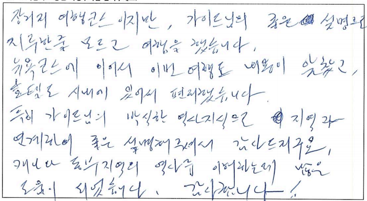 ![]() 기대이상으로 만족스러운 여행이었어요. 가이드님의 상세하고 친절한 안내와 좋은 호텔과 식사가 어우러져서 아주 즐거운 여행이었어요. 조카와 좋은 추억을 만들게 해주셔서 감사해요. 항상 행복하고 건강하세요! ![]() 가이드님이 설명을 잘해주셔서 좋았어요. 풍경도 예뻐서 다음에 또 오고 싶어요, 식당도 엄청 맛있고 호텔도 엄청 좋아요. ![]() 아름다운 시간여행이였네요. 좋은 추억으로 또 남겠네요. 가이드님께서 최선을 다하시는 모습이 인상깊었습니다. 감사합니다. ![]() 토론토 공항에 도착했을 때 부터 오늘까지 긴 이동의 여행이었으나 가이드님의 재밌는 역사 소개와 유머러스한 멘트로 캐나다의 역사와 지역의 특성에 대해서 많이 알게 되었습니다. 긴 이동시간이었으나 지루하지 않고 즐겁고 유익한 시간이었습니다. 가이드님의 노고에 감사드립니다. 그리고 앞으로 좋은 여행사가 되길 바랍니다. ![]() 알찬일정이었어요. 특히 가이드님! 세심하게 한분한분 특성에 맞게 자상하게 신경 써 주셔서 불편함이 전혀 없었어요. 역사 정보, 일상 정보 등등 아주 재미있게 지루하지 않게 해 주셨습니다. 다음에 또 이용해도 파란여행입니다. 여행 내용도 아주 만족합니다. ![]() 장거리 여행코스 이지만, 가이드님의 좋은 설명으로 지루한 줄 모르고 여행을 했습니다. 뉴욕코스에 이어서 이번 여행도 내용이 알찼고 호텔도 시내에 있어서 편리했습니다. 특히 가이드님의 박식한 역사 지식으로 지역과 연계하여 좋은 설명해 주셔서 감사드리구요, 캐나다 동부 지역의 역사를 이해하는데 많은 도움이 되었습니다. 감사합니다. ![]() 가이드님께서 여행 중 친절하고 재밌게 설명해 주셔서 몰랐던 것들을 많이 알고 배우고 갑니다. 이동 시간이 길어서 힘들것 같았는데 시간이 빨리 지나간듯 합니다. 그만큼 지루하지 않고 재밌었습니다. 다음번에 기회를 만들어서 또 파란여행을 통해서 여행을 하고 싶어요. 감사합니다. ![]() 첫 퀘벡여행으로 좋은 추억을 남기고 캐나다의 역사나 지역 이름의 유래등 많은 것들을 배웠다. ![]() 너무 좋은 잊지못할 여행 감사합니다. |