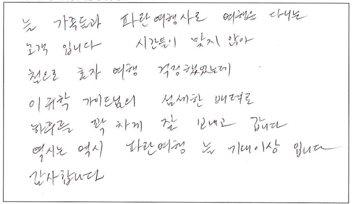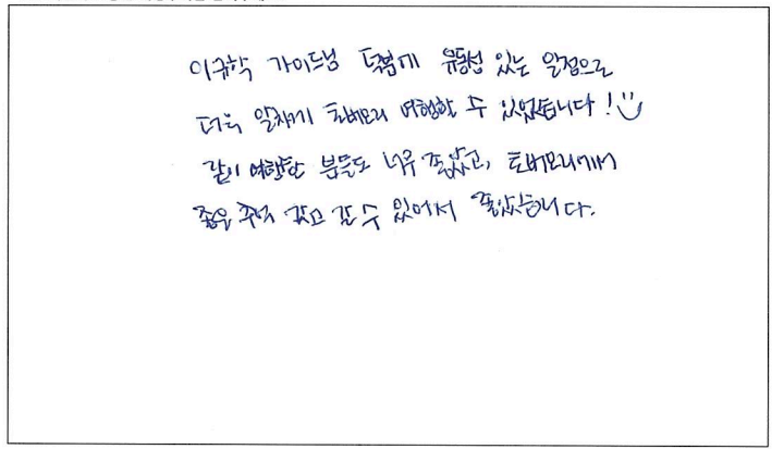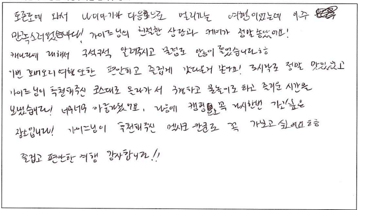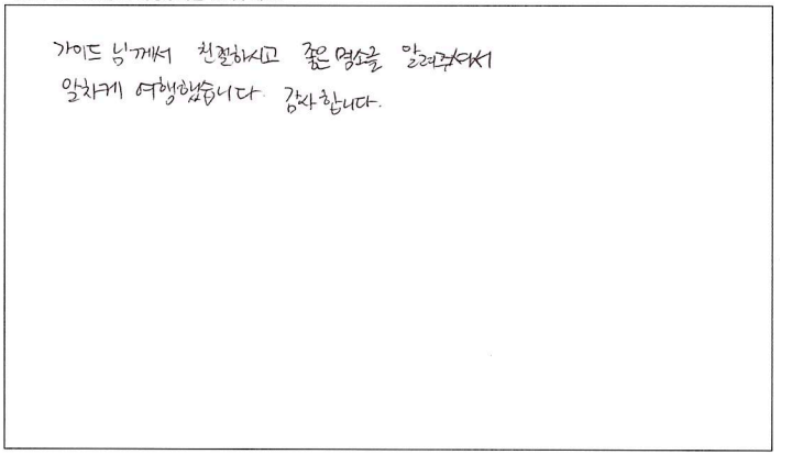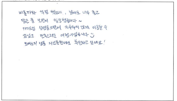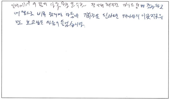 ![]() 이번 파란여행 토버모리 여행은 너무나도 만족스러웠습니다. 우선 날씨도 너무 좋아 맑은 휴런호수를 볼 수 있었고 가이드님이 여유럽게 저희들을 이끌어 주셔서 너무 만족스럽게 여행을 마친 것 같습니다. 토버모리의 꽃병섬들과 유람선 투어는 잊지못할 추억이 될 것 같습니다. 파란여행 감사해요~ ![]() 토버모리가 유명한 이유가 있네요! 토론토 오시거나 사시는 분들께 꼭 한번쯤 가보시라고 권하고 싶습니다. 출발이 조금 이르지만 일정자체는 너무 힘들지 않고, 하루 기분좋게 바람 쐬고 갑니다. ^^ 가이드님 오늘 하루 고생 많으셨습니다! ![]() 왕복 약 7시간이 순식간에 지나갈 정도로 즐거웠습니다. 당일치기 코스로 부담없어서 너무 괜찮고 유람선을 안 탔으면 후회했을 정도로 꽃병섬이 너무 이뻤습니다. 다음엔 다른 코스로 또 여행사 이용하고 싶네요. 가이드님 감사드립니다. ![]() 늘 가족들과 파란여행으로 여행을 다니는 고객입니다. 시간들이 맞지 않아 첨으로 혼자하는 여행이라 걱정했었는데 가이드님의 섬세한 배려로 하루를 꽉 차게 잘 보내고 갑니다. 역시는 역시. 파란여행 늘 기대이상 입니다. 감사합니다. ![]() 주위에서 많이 들었던 토버모리를 직접 가보니 물도 정말 깨끗하고 한번 더 가고 싶다는 생각이 들었고 가이드님의 설명대로 간 코스는 정말 최고였습니다. 날씨도 너무 맑고 화창한 덕분에 힐링을 제대로 한것 같습니다. 다음번에 가게 된다면 9월 말고 8월에 가서 더 신나게 즐기고 싶습니다. ![]() 인생에서 이렇게 아름다운 호수를 잘 안내 해주신 가이드님께 감사하고 여행으로 비록 왔지만 다음에 기회가 또 된다면 캐나다의 이곳저곳을 또 보고 싶은 마음이 들었습니다. ![]() 비올까봐 걱정했는데, 날씨도 너무 좋고 맑은 물 보면서 힐링했습니다~ 가이드님 설명들으면서 지루하지 않게 이동할 수 있었고 만족스러운 여행이었습니다. ^^ 토버모리 상품 지인들한테도 추천하고 싶네요! ![]() 가이드님 덕분에 유통성 있는 일정으로 더욱 알차게 토버모리 여행할 수 있었습니다! ^^ 같이 여행한 분들도 너무 좋았고, 토버모리에서 좋은 추억 갖고 갈 수 있어서 좋았습니다. ![]() 동생들과 함께하는 첫 패키지 여행이었는데 좋은 추억 많이 남기고 갑니다. 친절하신 가이드님의 설명과 그 외 다른 꿀팁들도 많이 알려주셔서 도움이 되었어요. 토버모리 너무 아름답고 힐링되는 곳이었습니다. 담엔 꼭 캠핑하러 가고 싶네요! ![]() 토론토에 와서 나이아가라 다음으로 멀리가는 여행이었는데 아주 만족스러웠습니다! 가이드님의 친절한 상담과 케어가 정말 좋았어요! 캐나다에 대헤서 구석구석 알려주시고 꿀팁도 많이 들었습니다. ㅎㅎ 이번 토버모리 여행 또한 편안하고 즐겁게 갖다온 것 같아요! 도시락도 정말 맛있었고 가이드님이 추천해주신 코스대로 올라가서 구경하고 물놀이도 하고 즐거운 시간을 보냈습니다.! 너무너무 아름다웠어요. 다음에 캠핌으로 꼭 다시한번 가고 싶은 장소입니다! 가이드님이 추천해주신 멕시코 칸쿤도 꼭 가보고 싶어요 ㅎㅎ 즐겁고 편안한 여행 감사합니다!! ![]() 가이드님께서 친절하시고 좋은 명소를 알려주서서 알차게 여행했습니다. 감사합니다. |