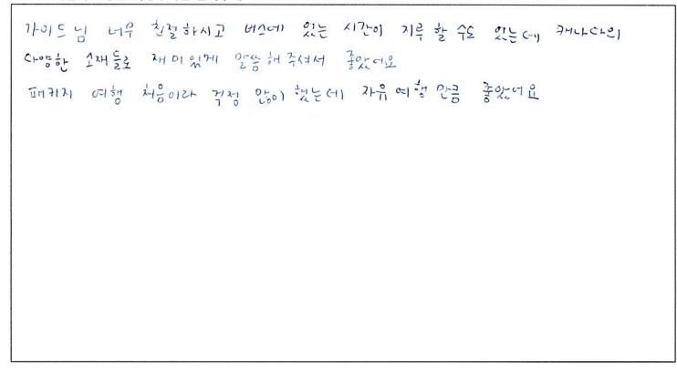 ![]() 현지 사정을 제일 잘 아는 여행사 입니다. 여행 특성상 장거리 여행을 하게 되는데 숙소위치가 관광지 인근으로 잡혀 있어서 휴식과 여행하기에 너무 좋았습니다. 여행 구성 자체도 너무 좋았고 자유시간 많이 주셔서 원없이 잘 보았어요! 저희는 태양의 아들 가이드님 이셨는데, 퀘벡과 관련된 역사와 인물들 이야기가 다채로워서 더 같이 여행을 즐기게 되었어요. 저희는 부모님 칠순 여행이었는데 식사 때문에 고민이 많았어요. 연로하신 부모님이 현지식에 힘들어 하실까봐 걱정이었는데 다행히 한식이 포함되어 있는데다 맛까지 있어서 여행내내 든든했습니다!! 선물로 주신 아이스와인 잘 마시겠습니다! 부모님이 너무 기뻐하셨어요! 아! 개인적으로 패키지라면 빠지지 않는 쇼핑이 없어서 너무 좋아요. 그 시간도 여행에 쓸 수 있어서 여러모로 알찬여행 이었습니다. ^^ ![]() 천섬 오타와 몬트리올 퀘벡 등 2박3일 정말 편하고 즐겁게 다녀갑니다!!! 아이를 데리고 함께하는 여행히라 호텔 위치도 중요하고 식사도 중요한데, 저녁에 가까이 아이와 나가서 둘러보고 오기도 좋고, 한식 식사도 좋고, 정말 다 하나하나 편했어요!! 가이드님은 친절하고 설명도 잘해주셔서 아이와 설명도 듣고 즐겁고 알차게 다녀갑니다.^^ 지인들 캐나다 간다면 추천할거예요!!! 또오게 된다면 파란여행으로 올게요! 감사합니다. ^^ ![]() 지인소개로 왔는데 2박3일 동안 편안하고 즐거웠습니다. 특히 퀘벡이 너무 좋았어요. 4시간의 자유일정, 밤에도 자유시간이 있어서 함께 왔지만 개인적 시간을 보장받을 수 있어 좋았습니다. 호텔 컨디션이 좋아서 자는 데 무리가 없었고 아이스와인 선물은 정말 기뻤습니다. 덕분에 퀘벡과 이 여행사에 대한 긍정적인 인상을 받고 갑니다. 혼자와서 지루하지 않을까 걱정했던 것이 무색할 만큼 감사하고 행복했습니다. ![]() 가이드님 안내도 좋고 이동 때 휴게소 자주 들려서 좋았다. 자유시간 많은게 진짜 좋고 아이스와인 선물도 좋았습니다. 재밌는 설명 많이 해줘서 좋았어요!! ![]() 사촌동생과 처음으로 캐나다 여행와서 파란여행 만나서 좋았고 가이드분도 편안하고 잘해주시고 좋았습니다! 2박3일 동안 천섬, 몬트리올, 퀘벡(도깨비 촬영지) 너무너무 좋았습니다. 좋은 추억과 좋은 풍경 많이 보고 마지막까지 편안하고 좋았습니다. ![]() 퀘벡, 긴거리, 좋은 이야기 풍성 선물은 Good! 쇼핑! 없는 거 좋아요! ![]() 가이드님 너무 친절하시고 버스에 있는 시간이 지루할 수도 있는데 캐나다의 다양한 소개들로 재미있게 말씀해 주셔서 좋았어요. 패키지 여행 처음이라 걱정 많이 했는데 자유여행만큼 좋았어요. ![]() 캐나다의 장거리 여행에 액기스만 선택하여 가이드해 주셔서 여행사에 감사함을 드립니다. 유머러스한 진행으로 여행지의 소개를 명쾌하게 해주셔서 지루함을 느낄 수 없었습니다. 여행지도 아름다워 즐거운 여행 이었습니다. 앞으로 북미지역 여행 계획은 파란여행과 동행 하고자 합니다. ![]() 참 재밌었어요. 차안에서 멀미나면서 써서 글씨체가 이상하지만 최선을 다해서 쓰는거에요. 오랜만에 한국말로 설명들으니 다 알아들어서 좋았어요. 강제쇼핑도 없고 가이드 아저씨 너무 재밌었어요. 태양의 아들님. 내일 나이아가라는 아저씨가 같이 안가서 비가오면 어떡하죠? 어학원 여러 패키지여행 해봤는데 여기가 제일 친절했어요. 이걸 읽으 실 미래의 손님분들 여기 퀘벡 투어 하면 아이스와인 공짜로 하나 줍니다. 당장하세요. 설명이 너무 많아서 내가 여행하러 온건지 캐나다 역사공부하러 온건지 헷갈렸지만 그 설명하는 가이드님 그걸 어떻게 다 외우세요. 대단. 지나다니가 핀치역에서 간판은 봐서 알고 있었는데 좋네요. 아직 캐나다에 좀 더 남아있을 거니까 또 어디 가고 싶으면 찾아올께요. 그때까지 잘 기다리세요, 태앙의 아들님. 안녕! ![]() 토론토에 오래 살고 계신 고모님의 추천으로 파란여행을 선택했고 탁월한 선택이었다고 생각합니다. 우선 가장 좋은 것은 가이드님의 해박한 설명과 위트로 편안한 여행을 만들어 주신 점입니다. 총 2,000km가 넘는 버스 이동이 지루할 틈이 없었습니다. 물론 관광지에서는 알차게 이해할 수 있도록 설명을 너무 잘 해주셔서 감사합니다. 호텔도 위치, 룸 컨디션등 너무 좋았습니다. 다음에도 캐나다 동부 투어를 한다면 파란여행을 선택할 것 같습니다. 매일 주시는 깨알 같은 선물도 기분을 좋게 했습니다. 선택 관광도 1개뿐 모두 포함되어 좋았습니다. 쇼핑의무가 없는 것도 좋았습니다. ![]() 너무너무너무 즐거운 여행이었습니다. 여행 : 먹는 것, 보는 것, 듣는 것 중 가이드님의 재미있는 이야기는 잠을 못자게 했습니다. 먹는 재미-일품입니다. 한국음식은 한국보다 맛있습니다. 멋있는 풍광들과 70 나이에 아주 멋있었습니다. 다시한번 멋진 여행을 푸른하늘을 타고 또 하고 싶습니다. 감사했습니다. ![]() 가이드님이 전문적이다. 호텔이 다운타운에 있어서 시내 밤 구경도 좋았다. 운전자가 운전을 잘했고 가는 곳마다 캐나다를 맘껏 느낄 수 있어서 좋았다. 두번의 한국음식도 최고에요^^ ![]() 부모님을 모시고 다녀온 여행이 너무도 