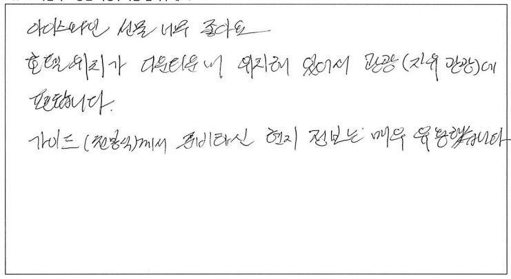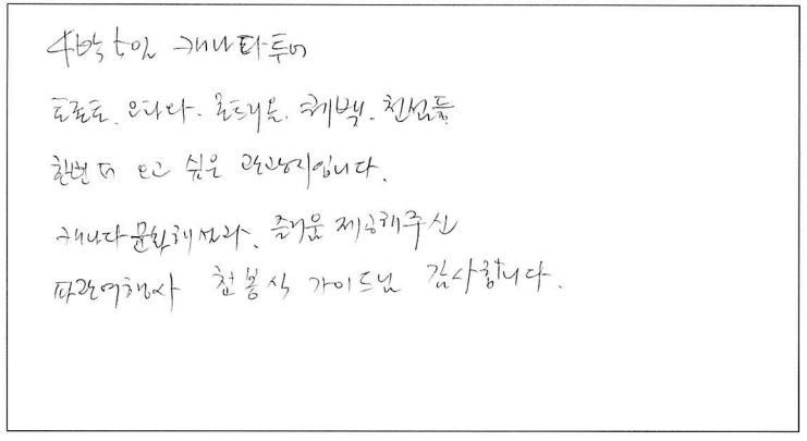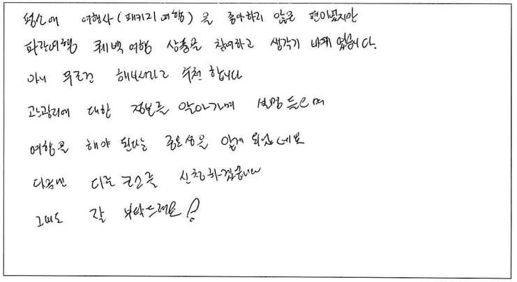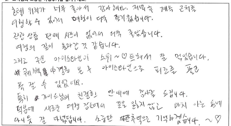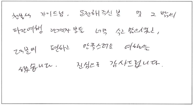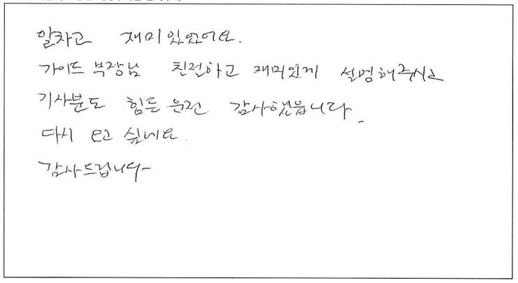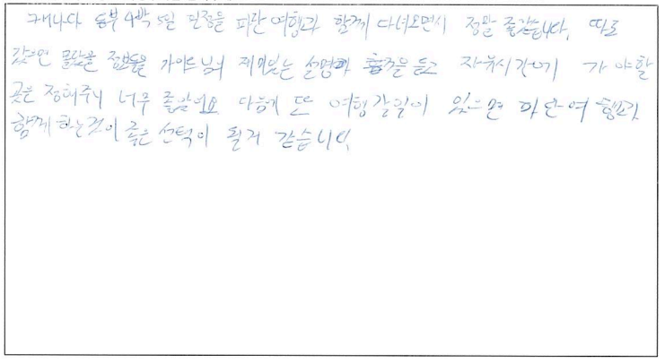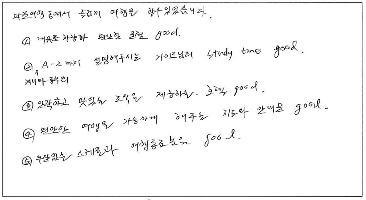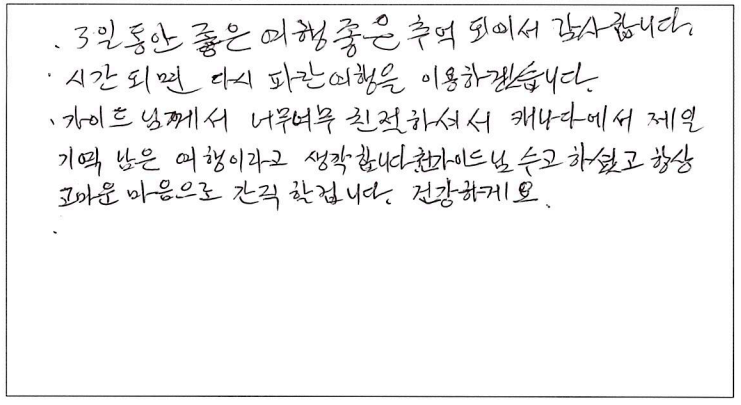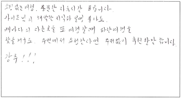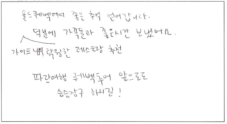 ![]() 퀘벡 2박3일 첫 캐나다 여행이라 긴장하며 고민의 고민을 거듭하다 파란여행 상품을 선택하게 되었습니다. 캐나다 현지 한인여행사 중에서 유명하다 해서 지인 추천 받았는데 정말 추천할 만 한 것 같습니다. 친절하고 세심함 가이드님, 쇼핑 스트레스 없는 것. 나이스하고 깔끔한 운전 솜씨, 충분한 자유시간 모두모두 좋았습니다. 특히 호텔 잠자리 진짜 좋았어요. 여행일정 내내 호텔위치와 편안한 잠자리 덕분에 더욱 여행에 집중할 수 있었습니다. 파란여행 덕분에 캐나다 동부 퀘벡을 아주 즐겁고 유익하게 알차게 다녀올 수 있었어요. 담번에 미국여행을 한다면 파란여행 투어상품 이용하고 싶어요~ ![]() 호텔위치가 너무 좋아서 감사해요. 저녁 후 계속 근처를 여행 할 수 있어서 여행이 더욱 즐거웠습니다. 관광상품 판매 시간이 없어서 더욱 좋았습니다. 여행의 질이 올라간 것 같습니다. 그리고 주신 아이스와인이 스위~트해서 잘 먹었습니다. 퀘벡 야경을 본 후 아이스와인으로 피로를 풀고 푹 잘 수 있었어요. 특히 가이드님의 친절한 안내에 감사를 드립니다. 덕분에 새로운 여행 장소여서 길을 잃지 않고 마치 아는 동네 다니듯 잘 다녔답니다. 소중한 추억으로 기억하겠습니다.~ ![]() ![]() 캐나다동부 4박5일 일정을 파란여행과 함께 다녀오면서 정말 즐거웠습니다. 따로 갔으면 몰랐을 정보들을 가이드님의 재미있는 설명을 듣고 자유시간에 가야할 곳은 정해주니 너무 좋았어요. 다음에 또 여행 갈일이 있으면 파란여행과 함께 하는 것이 좋은 선택이 될것 같습니다. ![]() 가이드님, 운전해주신 분 및 그밖의 파란여행 관계자분들 너무 수고 많으셨고, 덕분에 편하고 만족스러운 여행을 했습니다. 진심으로 감사드립니다. ![]() 4박5일 캐나다투어 토론토, 오타와, 몬트리올, 퀘벡, 천섬들 한번 더 오고 싶은 관광지 입니다. 캐나다 문화 해설과 즐거움 제공해주신 파란여행 가이드님 감사합니다. ![]() 알차고 재미있었어요. 가이드 부장님 친절하시고 재미있게 설명해주시고 기사분도 힘든 운전 감사했습니다. 다시오고 싶네요. 감사드립니다. ![]() 3일 동안 좋은 여행, 좋은 추억 되어서 감사합니다. 시간되면 다시 파란여행을 이용하겠습니다. 가이드님께서 너무너무 친절하셔서 캐나다에서 제일 기억에 남은 여행이라고 생각합니다. 가이드님 수고하셨고 항상 고마운 마음으로 간직할겁니다. 건강하세요. ![]() 올드퀘벡에서 좋은 추억 얻어갑니다. 가이드님의 탁월한 레스토랑 추천 덕분에 가족들과 좋은 시간 보냈어요. 파란여행 퀘벡투어 앞으로도 승승장구 하시길!! ![]() 아이스와인 선물 너무 좋아요. 호텔위치가 다운타운내 위치해 있어서 관광(자유관광)에 편합니다. 가이드님께서 준비하신 현지 정보는 매우 유용했습니다. ![]() 한국에서 7년전에 미동부와 캐나다(오타와, 퀘벡, 몬트리올) 여행사를 통해 다녀왔지만 기억이 희미했는데 파란여행, 가이드님께서 너무 친절하시고 설명을 잘해 주셔서 3일간 한번도 졸지 않고 설명들었다. 머리속에 속속 남았다. 한국가면 주인분들께 인터넷에 현지 파란여행 검색해서 여행가라고 할것임. ![]() 너무 좋습니다. 첫번째로 '노쇼핑'이어서 여행에 더욱 더 집중할 수 있었습니다. 두번째로 '가이드님의 수준높고 재미있는 설명' 덕분에 더욱 의미있는 여행이 되었습니다. 세번째. '안전한 버스 운행' 덕분에 편하고 안전하게 여행할 수 있었습니다. 솔찍히 말씀드리면 이것 이외에 다운타운 내 숙소, 매일 주시는 선물(특히 아이스와인)등 많은것들이 만족스럽고 좋았습니다. 다음에는 부인과 함께 꼭 다시 하고 싶습니다. ![]() 평소에 여행사(패키지여행)을 좋아하지 않는 편이었지만 파란여행 퀘벡여행상품을 참여하고 생각이 바뀌었습니다. 아니 무조건 해보시라고 추천합니다. 관광지에 대한 정보를 알아가며 설명 들으며 여행을 해야 된다는 중요성을 알게 되었네요. 다음에 다른 장소를 신청하겠습니다. 그때도 잘 부탁드려요! ![]() 쇼핑없는 여행. 충분한 자유시간 좋습니다. 가이드님의 해박한 지식과 설명 좋아요. 캐나다의 다른 곳을 또 여행할때 파란여행을 찾을거구요! 주변에서 요청한다면 주저없이 추천할만 합니다. 강추!!! ![]() 파란여행 통해서 즐겁게 여행을 할 수 있었습니다. 깨끗한 차량과 편안한 운전 Good. A-Z 까지 설명해주시는 가이드님의 Study time good. 안락하고 맜있는 조식을 제공하는 호텔 good. 편안한 여행을 가능하게 해주는 지도와 안내문 good. 부담없는 스케쥴과 여행 동료분들 good. |