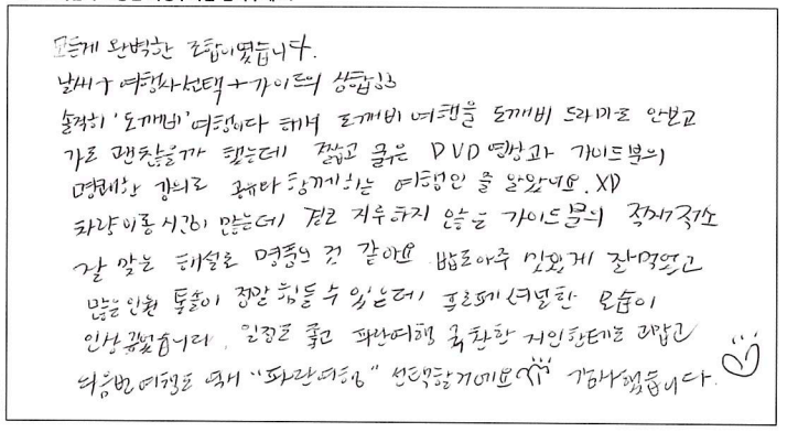 ![]() 자유여행으로 왔다면 조금 시간에 여유가 있었을지는 모르겠지만 이렇게 알차게 다니지는 못했을 것 같아요! 좋은 식사, 좋은 호텔, 좋은 기사님. 마지막으로 "가장" 좋았던 가이드님 덕분에 편안한 여행을 할 수 있었습니다. 여행 중 발생하는 크고 작은 문제들을 신속하게 해결해 주셔서 많은 도움이 되었어요~ 그리고 단풍이 다 지진 않았지만 그래도 이쁜 풍경 많이 담고 갑니다! 한가지 더 좋았던 점은 긴 이동시간동안 계속 설명해 주시고 관련 영상 자료도 함께 틀어주셔서 더욱 알찬 여행이었어요~ 파란여행, 그리고 가이드님 감사합니다. ![]() 1.가이드님 ★ ★ ★ ★ ★ 아무래도 장거리, 장시간 여행인 만큼 지루할 법한 시간도 많았는데 가이드님께서 주변 보이는 것들도 재미있게 이야기 해주셔서 잠들 틈도 없이 재밌게 다녔습니다. 마지막 자유여행 날, 체크인도 미리 해주셔서 시간 아낄 수 있어 좋았습니다. 2. 버스 기사님 ★ ★ ★ ★ ★ 마주칠 때 마다 친절히 인사해주시고, 무엇보다도 빠르고 안전하게 그리고 유쾌하게 운전해주셔서 덩달아 저도 같이 기분 좋아졌습니다. 3. 식당 & 날씨 ★ ★ ★ ★ ★ 운좋게도 날씨가 여행 내내 좋았고, 추천해주신 식당 모두 좋았습니다. 4.호텔 ★ ★ ★ ★ ★ 호텔 상태나 침구, 객실 크키, 조식 모두 빠짐없이 만족스러웠습니다. ![]() 벤쿠버에서 비행기 타고 왔습니다. 동부까지 운전할 엄두가 안났는데 좋은 패키지를 소개받아 여행에 참여하게 되었습니다. 2박3일 동안 너무 알차게 원하는 곳을 다 가게 되어 200% 만족하고 다음에 제 지인이 오게된다면 추천의사 200% 있습니다. 가이드님의 노련한 스킬로 더욱 편하게 여행한 것 같아 감사의 마음을 전하고 싶네요^^ 제 지인과 다시 여행할 그날까지 쭉 일해주세요.ㅋㅋㅋ + 밥도 너무 맛있어요. ![]() 모든게 완벽한 조합이었습니다. 날씨 + 여행사 선택 + 가이드의 삼합!! 솔찍히 '도깨비'여행이다 해서 도깨비 여행을 드라마도 안보고 가도 괜찮을까 했는데 짧고 굵은 DVD영상과 가이드분의 명쾌한 강의로 공유와 함께하는 여행인줄 알았네요.^^ 차량 이동시간이 많은데 결코 지루하지 않은 가이드분의 적재적소 잘 맞는 해설도 명품인 것 같아요. 밥도 아주 맛있게 잘 먹었고 많은 인원 통솔이 정말 힘들 수 있는데 프로페셔녈한 모습이 인상깊었습니다. 일정도 좋고 파란여행 극찬한 지인한테는 고맙고 다음번 여행도 역시 파란여행 선택할꺼에요. 감사했습니다. ![]() ![]() 추울까봐 걱정했던 것과는 반대로 너무 환상적인 날씨 덕분에 가을 단풍여행 마음껏 즐겼습니다. 가이드님의 풍부한 지식보따리 덕에 공부도 많이 했고 다정다정한 말투에 지루할 틈 없는 버스여행이었습니다. 진짜 하나라도 더 알려주고 들려주고 싶어하시는 가이드님 덕분에 여행의 퀄리티가 한껏 올라갔습니다! 짧은 기간에 여러 도시를 봐야해서 시간적인 아쉬움은 살짝 있지만 퀘벡의 낮과 밤을 즐길 수 있어서 참 좋았습니다. 다음엔 록키여행에 참여하고 싶습니다. ![]() 가이드님과 함께한 2박3일 매우 좋은 추억으로 가지고 갑니다. 별 기대없이 오게 된 패키지여행이었는데 좋은 가이드님을 만나 버스에서 해주신 유익한 이야기들로 관광할때도 도움이 되었습니다. 파곤해서 많이 졸기도 했지만 주변 사람들의 즐거운 반응에 깨서 또 좋은 이야기들 놓치지 않고 들을 수 있었습니다. 디테일한 맛집설명도 너무 감사했습니다. 다음번에 PEI여행에서도 함께 하길 바래봅니다. 오랫동안 즐거운 가이드님 목소리가 기억될 것 같습니다. ![]() 모처럼의 단체여행을 통해, 예전 고향의, 고국의 맛을 기억하는 기회가 되었습니다. 상품도 좋았고 이 여정을 이끄시는 여행 가이드님의 헌신적인 노력으로 소중한 추억 하나를 만들게 되었네요. 단체 여행은 불편할거라는 편견을 깨게 되었고 앞으로 자주 이런 기회를 갖고 싶네요. 특히 가이드님의 여행을 리드하는 전반적인 이끄심이 좋았고 이런 분과의 여행이라면 아깝지 않을 투자가 될거 같네요. 파란여행의 수고와 가이드님의 애씀에 감사드립니다. 잊지못할 추억이었습니다. ![]() 65년만의 여유, 버스여행 결과는 최고의 선택이었다. 설익은 단풍, 끝없이 펼쳐지는 대자연의 규모, 오랫만에 느끼는 여행의 여유로움을 갖게 해주었다. 특히 단순 여행지 소개만이 아닌 캐나다의 역사, 퀘벡의 탄색, 영국과 프랑스의 갈등.. 캐나다의 일상.. 이런 이야기들을 구성지게 설명해 주는 가이드의 깊은 박식함에 감동과 교육을 받는 즐거운 여행이었다. ![]() 2박3일 퀘벡여행, 날씨도 정말 좋았고 파란여행의 플렌에 의해서 알차고 추억이 될만한 시간이었습니다. 특히 가이드님은 출발 때 부터 친절한 미소와 함께 정갈한 목소리로 여행내내 즐거움을 주시네요. 단체여행에 대한 불편할 것이라는 생각을 깨어 준 참 편리하고 알찬 상품이라는걸 알았어요. 다음 기회에 또 파란여행 기대합니다. ![]() 캐나다에 사는 시누이의 소개로 파란여행을 통해 여행을 했는데 꽉 차고 알찬 2박3일의 여행이었어요. 첫날 토론토에서 단풍이 많이 없어 처음에 반신반의 했는데 우선 천섬 유람선을 타며 너무나 아름다운 집들