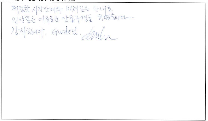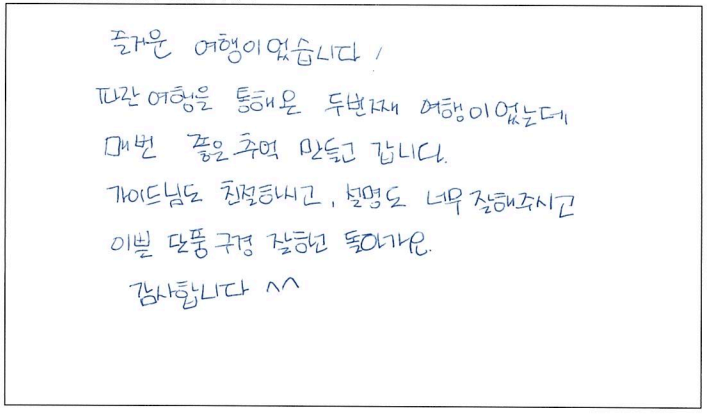 ![]() 파란여행 통해서 여행 할 때 마다 늘 100% 만족하고 갑니다. 좋은 날씨, 친절한 가이드님까지 너무 좋은 단풍 여행이었습니다. 잊지못할 추억 만들어 주셔서 감사합니다. ![]() 즐거운 여행이었습니다! 파란여행을 통해 온 두번째 여행이었는데 매번 좋은 추억 만들고 갑니다. 가이드님도 친절하시고 설명도 너무 잘해주시고 이쁜 단풍 구경 잘하고 돌아가요. 감사합니다. ^^ ![]() 적절한 시간안배와 배려깊은 안내로 인상깊은 여유로운 단풍구경을 하였습니다. 감사합니다. 가이드님. ![]() 너무 만족하고 아름다운 시간을 가졌습니다. 가이드님의 안내가 많이 유익했어요. 감사합니다! |