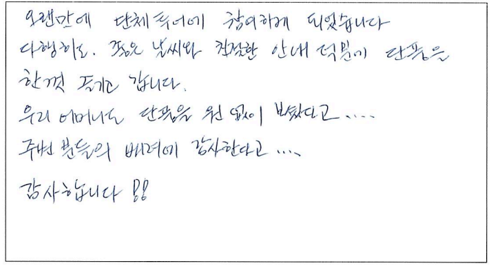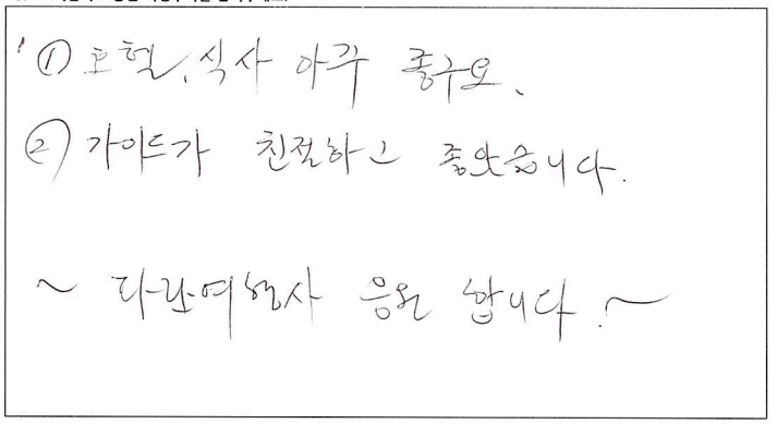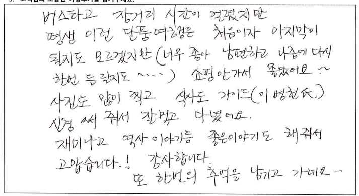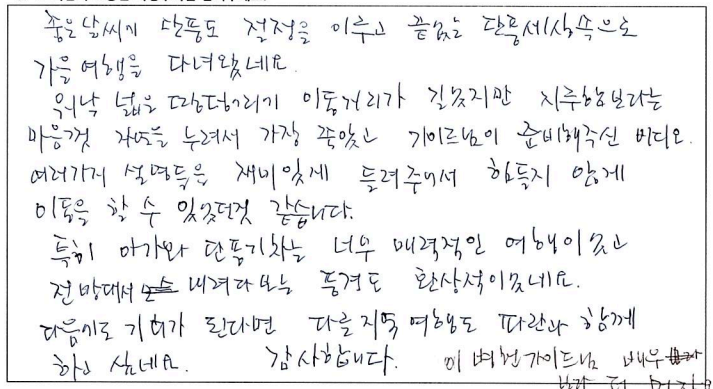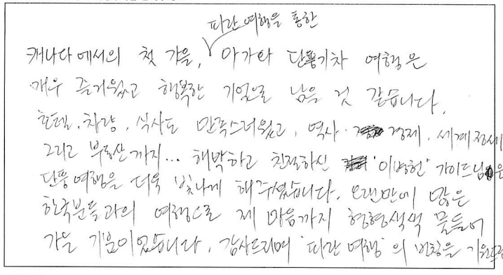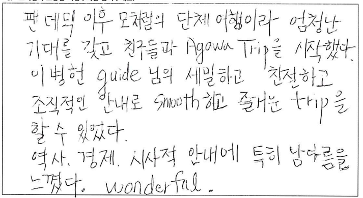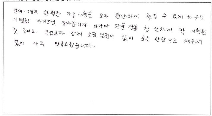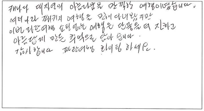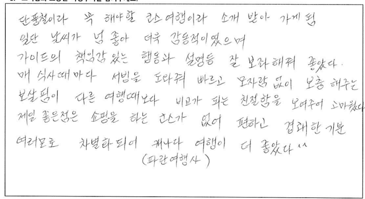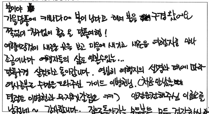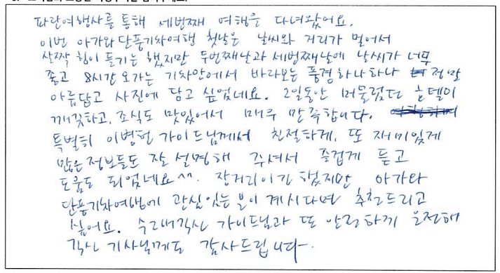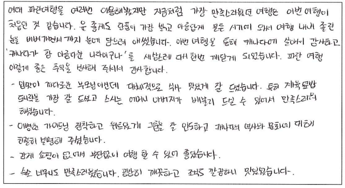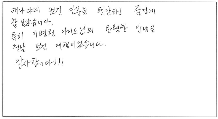 ![]() 캐나다에서의 첫 가을, 파란여행을 통한 아가와 단풍기차 여행은 매우 즐거웠고 행복한 기억으로 남을 것 같습니다. 호텔, 차량, 식사도 만족스러웠고 역사, 경제, 세계 정세 그리고 부동산까지... 해박하고 친절하신 가이드님은 단풍여행을 더욱 빛나게 해주셨습니다. 오랜만에 많은 한국분들과의 여행으로 제 마음까지 형형색색 물들어 가는 기분이었습니다. 감사드리며 파란여행의 번창을 기원드립니다. ![]() 여태 파란여행을 여러번 이용해 봤지만 지금처럼 가장 만족스러웠던 여행은 이번 여행이 처음인 것 같습니다. 운 좋게도 단풍이 가장 밝고 아름답게 물든 시기에 와서 여행 내내 졸린 눈을 비벼가면서 까지 눈에 담으려 애썼습니다. 이번 여행을 통해 캐나다에 살아서 감사하고 캐나다가 참 아름다운 나라구나를 새삼스레 다시한번 깨닫게 되었습니다. 파란여행 이렇게 좋은 추억을 선사해 주셔서 감사합니다. 입맛이 까다로운 부모님이신데 대체적으로 식사 맛있게 잘 드셨습니다. 특히 제육덮밥 도시락을 가장 잘 드셨고 스시는 어머니 아버지가 배불리 드실 수 있어서 만족스러워 하셨습니다. 가이드님의 침착하고 위트있게 그룹을 잘 인도하고 캐나다의 역사와 문화에 대해 친절히 설명해 주셨습니다. 강제 쇼핑이 없어서 부담없이 여행 할 수 있어 좋았습니다. 숙소 너무나도 만족스러웠습니다. 굉장히 깨끗하고 조식도 깔끔하니 맛있었습니다. ![]() 캐나다 대자연의 아름다움을 만끽한 여행이었습니다. 여러나라 패키지 여행을 많이 다녀봤지만 이번 파란여행 쇼핑없는 여행은 단풍을 더 진하고 아릅답게 만든 추억으로 담았습니다. 감사합니다. 파란여행 화이팅하세요! ![]() 오랜만에 단체투어에 참여하게 되었습니다. 다행이도 좋은 날씨와 친절한 안내 덕분에 단풍을 한껏 즐기고 갑니다. 우리 어머니도 단풍을 원없이 보셨다고... 주변분들의 배려에 감사한다고.... 감사합니다!! ![]() 캐나다의 멋진 단풍을 편안하고 즐겁게 잘 보았습니다. 특히 가이드님의 완벽한 안내로 정말 멋진 여행이었습니다. 감사합니다!!! ![]() 좋은 날씨에 단풍도 절정을 이루고 끝없는 단풍세상속으로 가을 여행을 다녀왔네요. 워낙 넓은 땅덩어리에 이동거리가 길었지만 지루함보다는 마음껏 자연을 누려서 가장 좋았고 가이드님이 준비해주신 비디오, 여러가지 설명들을 재미있게 들려주셔서 힘들지 않게 이동을 할 수 있었던 것 같습니다. 특히 아가와 단풍기차는 너무 매력적인 여행이었고 전망대에서 내려다 보는 풍경도 환상적이었네요. 다음에도 기회가 된다면 다른지역 여행도 파란여행과 함께 하고 싶네요. 감사합니다. ![]() '메이플로드' 트레킹을 마치고 파란여행의 아가와여행에 합승했다. 2박3일의 짧은 여정이라 할 수 있지만 나름 내가 느낀 만족과 감흥은 꽤나 크다. 주변에서 기차여행의 단조로움을 지적해서 다소 걱정했으나 오감으로 느끼는 체험은 놀랄만큼 좋았고, 그래서 트래킹으로 끝내서 한국으로 돌아간 일행들에게 미안함과 훗날 자랑하고 싶은 심정이 든다. 오랜시간 버스안에서 피로할수도 있을 것을 가이드님의 해박한 설명과 관련된 비디오 상영까지. 하나하나 신경 써 주신 배려심 덕분에 즐겁게 여행을 할 수 있어서 감사드린다. 또한 쇼핑보다 여행의 질을 높여준 파란여행 고맙습니다. ![]() 팬데믹 이후 모처럼의 단체 여행이라 엄청난 기대를 갖고 친구들과 Agawa Trip을 시작했다. 가이드님의 세밀하고 친절하고 조직적인 안내로 Smooth하고 즐거운 trip을 할 수 있었다. 역사, 경제, 시사적 안내에 특히 남다름을 느꼈다. Wonderful! ![]() 호텔, 식사 아주 좋구요. 가이드가 친절하고 좋았습니다. ~파란여행 응원합니다.~ ![]() 날씨, 경치 완벽한 가을 여행을 보다 편안하게 즐길 수 있게 해주신 가이드님 감사합니다. 아가와 단풍 상품 참 알차게 잘 기획된 것 좋아요. 무엇보다 강제 쇼핑 일정이 없이 순수 관광으로 채워저 있어 아주 만족스럽습니다. ![]() 9월의 어느날 아가와 단풍관광 얘기를 아내로 부터 들은 후 작은 일탈을 꿈꾸던 차에 인터넷에서 '파란여행'을 만났다. 기존의 단체투어를 예상했는데 가이드님을 만나는 행운으로 하루에 10시간 넘는 장거리 여행일정이 의외로 무난하게 지나갔고 맛깔난 점심식사는 여행의 즐거움을 더해 주었다. 피곤한 일정에도 불구하고 수고를 아끼지 않은 가이드와 더불어 "파란여행"에 고마움을 전한다. ![]() 파란여행을 통해 세번째 여행을 다녀왔어요. 이번 아가와단풍기차여행 첫날은 날씨와 거리가 멀어서 살짝 힘이 들기는 했지만 두번째날과 세번째 날에 날씨가 너무 좋고 8시간 오가는 기차안에서 바라보는 풍경 하나하나 정말 아름답고 사진에 담고 싶었네요. 2일 동안 머물렀던 호텔이 깨끗하고 조식도 맛있어서 매우 만족합니다. 특별히 가이드님께서 친절하게 또 재미있게 많은 정보들도 잘 설명해 주셔서 즐겁게 듣고 도움도 되었네요.^^ 장거리이긴 했지만 아가와 단풍 기차여행에 관심있는 분이 계시다면 추천드리고 싶어요. 수고해주신 가이드님과 또 안전하게 운전해 주신 기사님게도 감사드립니다. ![]() 단풍철이라 꼭 해야할 코스여행