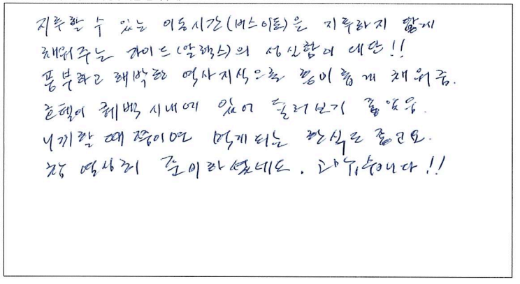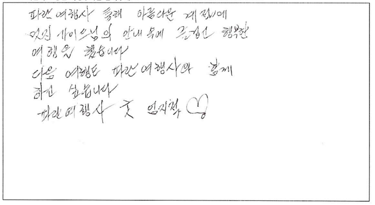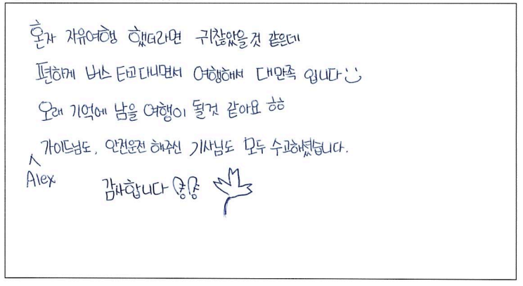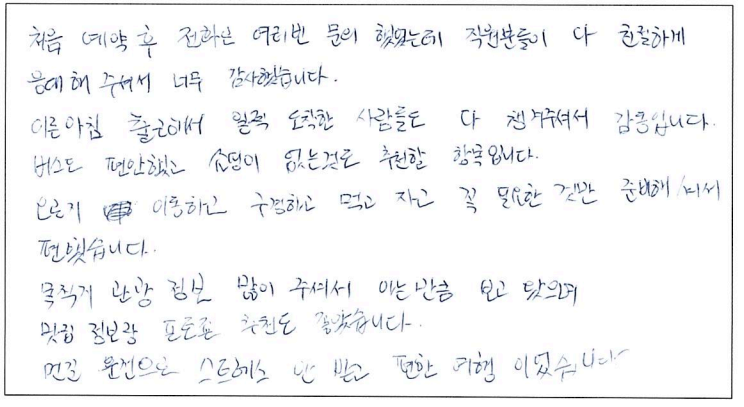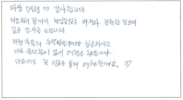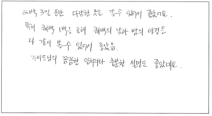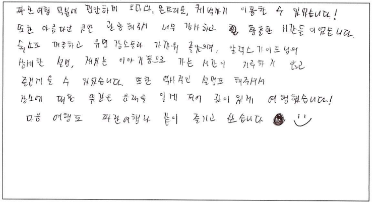 ![]() 파란여행을 알게되어 몬트리올, 오타와, 퀘벡을 편하게 갔다왔습니다. 가이드 여행은 처음이라 무척이나 걱정했지만 너무나무 편하게 즐겼습니다. 가이드님 진짜 열정적이고 한사람 한사람 다 잘 챙겨주셔서 좋았습니다. 정말 방대한 지식과 유머있는 말씀 덕분에 웃으며 여행을 한것 같습니다. 감사합니다. 여행지, 호텔, 식사 모두 빠짐없이 다 좋았습니다. 다른 분들에게 '파란여행'이 너무 좋다며 몇번씩 이용하고 있다는 말을 들었습니다. 맞는 거 같습니다. 앞으로의 여행도 파란여행과 또 하고 싶습니다. 좋은 추억을 만들게 해주셔서 감사합니다. ![]() 친구들과 처음으로 해외여행을 한 퀘벡 2박3일 여행은 오랫동안 기억에 남을 것 같다. 기대반 걱정반으로 시작한 여행 첫날, 알렉스 가이드님의 해박한 지식의 설명은 세계사를 공부하는 학생의 입장으로 눈은 똘망, 귀는 쫑긋 세워 들으며 많은 도움이 되었다. 퀘벡의 장소들을 폰에 담고 눈에 담으며 다음에는 형제들과 함께 다시한번 방문하고 싶은 장소였다. 실시간으로 한국에 있는 친구들에게 사진을 보내며 같이 동행하지 않은 친구들과 함께하는 마음으로 여행의 시작과 끝을 마무리 하였다. 다시한번 가이드님과 안전하고 편하게 운전해 주신 기사님께도 감사의 인사를 하며 파란여행의 또 다른 여행 상품에 기회가 되어 다시 만나기를 바란다. ![]() 여행사를 통한 여행을 이번이 처음이었습니다. 그래서 기대와 걱정이 동반되었는데 기대이상으로 만족했던 여행이었습니다. 특히 가이드님 수고 정말 많이 하셨어요. 역사 배경 등등 자칫 지루할 수 있는 긴 여정에 재미를 더 해주셔서 버스안에서 긴 시간도 즐거웠습니다. 천섬, 그리고 몽트랑블랑. 특히 올드 퀘벡에서의 하루는 잊을 수 없을 것 같아요. 하룻밤이 모자를 지경이었어요. 아름다운 경관과 웅장한 역사 유적지들을 보면서 시간가는 줄 몰랐습니다. 마지막 날 몽모렌시 폭포 또한 잊을 수 없는 장관이었습니다. 너무 시간이 빨리 지나가서 아쉬웠어요. 감사합니다. ![]() 첫 해외여행, 지인이 다녀오시고 너무 좋았다고 날짜 맞추어 미국 들어가기 전에 2박3일 퀘벡 여행을 추천해 주셔서 오게 되었다. 빨강고 노랗고 단풍이 아름답게 물든 것을 보고 다음에는 부모님과 함께 또 오고 싶은 곳이 되었다. 가이드님이 친절하게 안내 해주시고 아는 만큼 보인다는 것을 확실히 느끼게 해주셨다. 즐거운 여행이였고 감사합니다. ![]() 처음 예약 후 전화로 여러번 문의했었는데 직원분들이 다 친절하게 응대해 주셔서 너무 감사했습니다. 이른 아침 출근해서 일찍 도착한 사람들도 다 챙겨주셔서 감동입니다. 버스도 편안했고 쇼핑이 없는 것은 추천할 항목입니다. 오로지 이동하고 구경하고 먹고 자고 꼭 필요한 것만 준비하셔서 편했습니다. 목적지 관광 정보 많이 주셔서 아는 만큼 보고 왔으며 맛집 정보와 포토존 추천도 좋았습니다. 먼길 운전으로 인한 스트레스 안 받고 편한 여행이었습니다. ![]() 2박3일 동안 다양한 곳을 갈 수 있어서 좋았어요. 특히 퀘벡 1박을 통해 퀘벡의 낮과 밤의 야경을 다 같이 볼 수 있어서 좋았음. 가이드님의 꼼꼼한 일처리와 충분한 설명도 좋았네요. ![]() 파란여행 통해 아름다운 계절에 멋진 가이드님의 안내 속에 즐겁고 행복한 여행을 했습니다. 다음 여행도 파란여행과 함께 하고 싶습니다. 파란여행 굿! 엄치적! ![]() 파란여행을 통해서 아주 만족스런 여행을 했습니다. 가이드님을 통해서 오타와 몬트리올, 퀘벡의 역사와 문화에 대해서 많은 것을 느끼고 알게 되었습니다. 아는만큼 보이고 느낄 수 있는 것 같습니다. 오랜 세월이 흘러도 잊지 못할 좋은 추억이 될 것 같습니다. ![]() 퀘벡 2박3일 천섬에서 유람선 타고 멋진 풍광을 보았던 것이 인상적이었고 특히 올드 퀘벡에서 유럽에 마치 와있는 듯한 착각이 들 만큼 분위기 있는 상점들, 샤또 호텔의 웅장한 모습들. 모두 앞으로 오랫동안 기억될 만한 소중한 시간들이었습니다. 강요된 쇼핑 없이 가이드님이 고객들에게 관광포인트를 꼭꼭 집어주는 열정이 감사했던 3일이었습니다. ![]() 지루할 수 있는 이동시간(버스이동)을 지루하지 않게 채워주는 가이드의 성실함이 대단!! 풍부하고 해박한 역사지식으로 흥미롭게 채워줌. 호텔이 퀘벡 시내에 있어 둘러보기 좋았음. 느끼할 때 쯤이면 먹게되는 한식도 좋고요. 참 열심히 준비하셨네요. 고맙습니다!! ![]() 파란여행 ![]() 처음부터 끝까지 책임감 있는 배려와 정확한 정보에 깊은 감사를 드립니다. 여행자들의 추억 만들기에만 집중하시고 다른 불편함이 없이 여행을 했습니다. 다음에도 꼭 이곳을 통해 여행 할께요 ![]() ![]() 어린 아들하고 여행사를 통한 여행은 처음이라서 걱정도 되었지만 2박3일 동안 즐거운 추억을 만들었습니다. 긴 시간동안 가이드님의 친절하고 즐겁게 이야기를 해주셔서 지루하지 않고 감사하고 소중한 시간이었습니다. 다음에도 여행사를 통한 여행을 한다면 무조건 '파란여행'입니다. 감사합니다. ![]() 파란여행 덕분에 편안하게 오타와, 몬트리올, 퀘벡까지 이동할 수 있었습니다! 또한 아름다운 곳만 관광해서 너무 감사하고 황홀