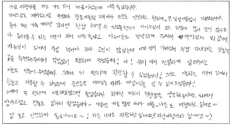 ![]() 쇼핑없는 여행 Good, 다운타운 호텔위치 Good, Bus very Good, (WiFi가능) Bus 기사분 very Good. Icewine, 쿠키, 스벅텀블러 선물 감사요^^ 가이드님 Thank you^^.캐나다 여행은 다시 와도 파란과 함께 할듯요!!! ![]() 2박3일 퀘벡 여행을 했습니다. 처음, 혼자 여행을 하는거라서 가기 전에 걱정을 많이 했는데 저와 같이 혼자오신 분들과 식사 자리를 같이 배치해 주셔서 친해질 수 있었고 소중한 인연을 만들 수 있었습니다. 또 버스안에서 가이드님 설명을 듣는 시간이 정말 즐거웠습니다. 호텔 위치, 시설, 음식등 여러가지로 만족할 수 있는 시간이여서 좋았습니다. 파란여행 감사합니다! ![]() 캐나다 온지 일주일 됐을 때 처음으로 혼자온 여행이었는데 재밌고 친절하신 가이드님과 기사님 덕분에 잘 적응할 수 있었던 것 같습니다 :) 이동시간이 길었는데도 지루하지 않았고 이곳저곳 알차게 모두 볼수 있어서 아쉬움 없는 여행이었습니다! ![]() 덕분에 즐겁게 행복한 추억 만들었습니다. 코스 기획도 호텔 위치도 가이드분의 설명도 드라이버분의 운전도 너무 좋았습니다. 감사합니다! ![]() 2박3일 동안 너무 즐겁게 여행했습니다. 친절하신 가이드분과 기사님 덕분에 편하게 다녔어요. 먼 곳까지 여행 막막했는데 파란여행과 함께 다니니 너무 좋았어요. 명소와 맛집도 다 알려주셔서 많은 것을 배우고 맛있는 것도 많이 먹었어요. 호텔도 너무 좋아서 잠도 잘 잤어요. 저녁에 자유시간도 있어서 좋았어요. 퀘벡 갈 일 있으면 또 파란여행을 이용할 것 같아요 Good ![]() 코로나로 못갔었던 여행을 퀘벡 몬트리올로 결정했습니다. 퀘벡.몬트리올은 10년전에도 왔었지만 다시 와보고 싶을만큼 기억에 남는 곳이라 다시 찾았습니다. 단풍이 유명한 캐나다라 10년전의 감흥이 있을까 큰 기대는 하지 않았는데 겨울임에도 역시 퀘벡은 멋진곳이네요. 도깨비 때문에 유명해진 퀘벡을 다시 올 수 있어 행복했고 아이스호텔은 정말 신기하고 아이들에게 좋은 경험이 되었어요. 아는 만큼 보인다고 여행지 도착전 가이드님의 재미난 역사와 장소이야기는 아주 유익한 시간이었어요. 미리 준비해준신 맛집 지도와 자유시간 가이드 지도도 아주 유용하게 잘 사용했습니다. 먼거리 운전해서 자유로 여행 올 필요없이 노쇼핑의 신개념 파란 패키지 여행을 선택한 건 정말 최고였네요. 눈길 안전하게 운전해주신 기사님과 마지막까지 세심하고 편안하게 챙져주신 가이드님 너무 감사드립니다. 올 한해도 번창하시고 행복하세요! ![]() 지인 소개로 오게 되었는데, 너무 만족스러웠습니다. 호텔 위치가 메인타운에 있어서 자유시간 때 돌아다니기 편했고 쇼핑 강요하지 않아서 그것도 너무 좋았어요. 토론토-몬트리올-퀘벡 가는길이 아주 멀었는데 중간중간에 가이드님의 재미있는 이야기들 덕분에 지루하지 않고 먼 길 여행이 가능 했던 거 같아요. 알찬 여행 기획 해주신 파란여행 감사합니다^^ ![]() 혼자하는 첫 패키지 여행이었는데 정말 재미있게 잘 놀다 갑니다~~! 첫날 7시간 가까이 차를 탔는데 가는 시간이 지루하게 느껴지지 않을 만큼 가이드님께서 설명을 썰풀듯이 너무 재밌게 해주셨어요! 재밌고 유익한 얘기들 들으면서 시간 가는줄 몰랐습니당. 그리고 혼자 여행 오신 분들끼리 같이 밥 먹을 수 있게 신경써 주셔서 캐나다에서 뜻밖에 좋은 사람들을 만나고 친해질 수 있었어요! 마지막날 밤에는 가이드님께서 선물로 주신 아이스 와인 다같이 마시면서 떠들고 재밌게 놀았는데 정말 잊을 수 없는 밤이었습니다! 파란여행은 단순히 여행 패키지가 아니라 추억을 선물해준 고마운 여행사 입니다! 자유시간도 알차게 보낼 수 있게 안내와 코스도 다 지정해주셔서 2박3일 빈틈없이 알찬 여행 할 수 있었던 것 같아요~! 가이드님 짱! 파란여행 짱이에용♡ ![]() 2023년 되어 첫 여행을 파란여행과 함께 퀘벡으로 다녀왔습니다. 장소 선정 및 호텔위치도 매우 마음에 들었고, 가이드분께서 재미있는 설명들도 매우 유익하고 즐거웠습니다. 퀘벡 날씨가 많이 추울 것 같아 걱정도 많았는데, 걱정이 무색하게 날씨도 매우 좋아서 더욱 더 즐거운 여행이 되었습니다. 감사합니다^^. 다음 여행도 파란여행과 함께 할께요♡♡♡ ![]() 첫 여행인데 정말 재미있고 소중한 추억을 많이 남길 수 있어서 너무 좋았습니다. 가이드님의 친절하고 재미있는 안내와 차량, 숙소, 호텔위치 등 모든 것이 너무 좋았습니다. 캐나다 여행하실때 파란여행 꼭 이용하시길 추천드립니다. 또 현지 맛집과 적절한 선물가게 등 알려주셔서 좋았어요~ 장제쇼핑 없이 자유롭게 쇼핑할 수 있어서 편안한 여행이었습니다. 감사합니다 ^^ ![]() 사실 여행사를 끼고 가는 것이 처음이었는데 너무 좋았습니다. 가이드님도 재미있으시고 무엇보다 장소 이동할 때마다 운전도 안전하고 편하게 큰 덜컹거림없이 가주셨습니다. 혼자 혹은 가족 끼리만 갔다면 한참 헤멜 수 있었을텐데 가이드님의 코스 덕분에 많이 걷지 않아도 다 둘러 볼 수있는 시간이 되어 너무 좋았고 자유시간도 넉넉하게 주셔서 재미있게 보고갑니다. 자유식이 있어서 무얼 먹어야 하나 고민이 많았는데 이것 역시 가이드님이 직