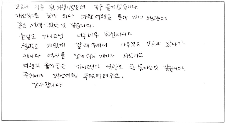 ![]() 패키지 여행은 처음이라 사전조사를 정말 많이 했습니다. 파란여행은 그 명성에 맞게 알찬구성(스케줄), 충분한 자유시간, 한식과 현지식의 조화, 꼼꼼한 상담안내, 친절하신 가이드님 덕분에 정말 즐겁고 행복한 캐나다 동부 여행이었습니다. 정말 다른 여행객 여러분께 강력 추천드리고, 후회하실 일 없다고 생각합니다. ![]() 파란여행 덕분에 행복하고 즐거운 저의 첫 캐나다 여행이었습니다! 가이드님의 꼼꼼한 설명과 유쾌하신 성격 덕분에 지루하지 않고, 더욱 가치있고 재미있게 보냈어요. 여행 일정 중에 저는 도깨비 촬영지였던 올드 퀘벡이 가장 아름답고 기억에 남는것 같아요. 많은 패키지 여행을 알아보고 비교하고 조사해서 파란여행으로 결정하였는데, 최고였어요! 다른 곳으로 여행할 때 패키지를 이용할땐 저는 또 파란여행을 이용할 거예요^^ ![]() 가이드님의 캐나다 역사 이야기가 정말 흥미롭고 재밌었습니다. 아이들도 캐나다 역사를 잘 모르는 어른들에게도 편안하고 재밌게 전달되었어요. 여행을 하면서 방문하는 곳과 관련된 역사를 접하니 더 잘 와닿았고 기억에 오래 남을 것 같네요. 운전 기사님도 고된 장거리 운전이지만 늘 미소를 잃지 않고 고객들에게 인사를 해주셨고 안전 운전해주셨네요. 두 분 덕분에 편안하고 즐겁게 여행할 수 있었습니다. 가이드님의 주옥같은 유행어들도 오랫동안 환청으로 맴돌듯 합니다. 감사합니다~:) ![]() 코로나 이후 첫 여행이었는데 매우 즐거웠습니다. 개인적으로 갈까 하다 파란여행을 통해 가게 되었는데 좋은 선택이었던 것 같습니다. 가이드님 너무너무 친절하시고 설명도 재밌게 잘해주셔서 아무것도 모르고 갔다가 캐나다 역사를 알게되는 계기가되었어요. 여행의 즐거움은 가이드님의 역량도 한 몫하는것 같습니다. 주위에도 파란여행 추천하려구요. 감사합니다. ![]() 캐나다에서 처음 이용했던 여행사인데, 가이드님이 말도 재치있게 해주시고, 관광하는 동안 설명도 너무 잘해주셔서 버스로 이동하는 시간 동안 지루하지 않았습니다. 또한 어느정도의 백그라운드를 알고 관광하니 더 잘 보이는 느낌이었습니다. 호텔 시설도 깨끗하고 소음도 없었습니다. 2박 3일동안 수고해주신 가이드님, 운전기사님 감사합니다! ![]() 운전해서 가려다가 투어로 가게되었는데 탁월한 선택이었습니다. 버스도 편안하게 운전해주셨고 가이드 선생님도 캐나다 동부의 역사적인 배경에 대해 너무 재미있게 설명해주셔서 유익하고 즐거운 시간이었습니다. 애매한 시즌에 왔지만 날씨도 좋았고 다음엔 단풍도 즐기러 방문해보겠습니다. 정말 수고 많으셨습니다! ![]() 기대 이상의 좋은 추억을 만든 여행 선물 해주신 파란여행에 감사드립니다. 가이드님의 자상함, 편안한 안내, 재밌고 부드러운 설명덕에 지루할 수 있는 이동시간이 너무 빨리 지나간 여행이었습니다. 전 제가 원했던 이상의 것을 얻은 여행이였습니다. 감사합니다. ![]() 알차게 짜여진 2박3일의 일정과 코스 마음에 들었고 열정 넘치는 가이드님 덕분에 역사까지 이해해 가면서 유서깊은 곳을 관광하게 되어 더욱 좋았습니다. 다른 계절에 또 오고싶은 좋은 여행이었습니다. ![]() 오고 가는 이동시간의 설명덕에 더욱 알찬 여행이 되었습니다! 처음가는 퀘벡여행이었는데 퀘벡뿐 아니라 캐나다까지 더 깊이 이해하고 알 수 있었던 유익한 시간 만들어 주신 파란여행팀과 또 함께 여행해보고 싶습니다^^ ![]() 투어여행에서 가이드선생님의 역할이 크다라는 것을 잘 느낀 여행이었습니다. 버스이동시간이 상당했기에 다소 정적인 여행을 예상했습니다. 하지만 가이드님께서 그 시간들을 역사, 유머, 지리, 상식등 방대한 영역에 걸처 재미있게 채워주셨습니다. 덕분에 캐나다란 나라에 일자무식이었음에도 불구하고 인생에 남을 큰 추억 채워갑니다. 그림같은 캐나다 풍경만큼이나 가이드의 에너지와 열정을 보며 많은 것을 담고, 얻어갑니다. 행복한 여행 만들어주셔서 감사합니다!!! ![]() 5년전 파란여행을 통해 여름에 다녀왔던 퀘벡을 애아빠와 함께 다시 오게 되었다. 저번에 가지 못했던 아이스호텔은 너무 아름답고 신기했다. 가이드님이 상세히 설명해주신 캐나다 세계역사 등의 이야기가 지루한 버스여행의 시간을 유익하게 만들어 주었다. 퀘벡은 겨울 또한 아름다웠다. 다음에 가을에 다시 이용해 보고싶다. |