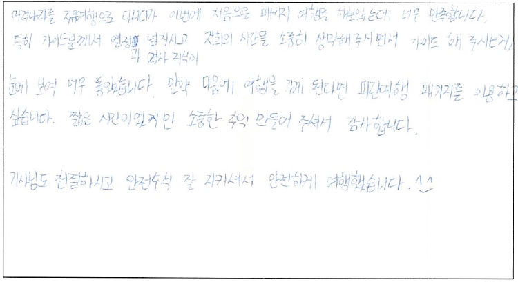 ![]() 여러나라를 자유여행으로 다니다가 이번에 처음으로 패키지 여행을 해보았는데 너무 만족합니다. 특히 가이드분께서 열정과 역사지식이 넘치시고 저희의 시간을 소중히 생각해주시면서 가이드 해 주시는게 눈에 보여 너무 좋았습니다. 만약 다음에 여행을 하게 된다면 파란여행 패키지를 이용하고 싶습니다. 짧은 시간이었지만 소중한 추억 만들어 주셔서 감사합니다. 기사님도 친절하시고 안전수칙 잘 지키셔서 안전하게 여행했습니다.^^ ![]() 모르는 사람과 처음하는 여행 나름대로 재밌고 즐거웠다. 파란여행의 세심한 배려와 가이드님의 열정, 긴버스안에서도 지루한뻔 했는데 가이드님의 재치와 재미난 말솜씨로 지루한 줄 모르고 왔다. 몬트리올, 퀘벡 정말 잊지못할 추억을 가슴과 눈과 사진에 담고 돌아간다 이제 일상으로 돌아가는 아쉬움이 있지만 지친 삶에 재충전해서 열심히 살것 같다. 가슴 떨릴때 여행을 하라는 말이 있듯이 앞으로 여행을 많이 해야겠다. 파란여행을 통해서~^^ ![]() Everything was good, good!! your company must be the best travel agency not only Canada but also united states. Be a fascinated tour company! Be a faithful attractive company!! -15. April. 2023- ![]() 맑고 청량한 날씨와 깨끗한 공기에서 꽤 편한 여행이었습니다. 쇼핑하느라 쫓기듯 다니는것도 없고 그져 이국적인 자연과 우리와 먼 나라 사람들의 사는 모습도 보고 함께 여행하는 이들도 조용하고 훈훈한 이웃이었습니다. 편안하게 우릴 이끄는 가이드님과 듬직한 기사님도 참 감사드리고 싶습니다. 가이드님의 파란여행에 대한 신뢰와 긍지가 늘 이어지길 바랍니다. ![]() 파란여행을 캐나다 토론토에 와서 알게되었는데 편안한 여행을 할 수 있도록 여러가지 잘 챙겨 주셔서 즐거운 추억여행 할 수 있었습니다. 감사합니다. ![]() 2박3일 짧은 시간에 많은 이동을 하며 다녀온 몬트리올과 퀘벡, 기분 좋게 다녀왔습니다. 가이드님과 기사님의 편안한 차량으로 소중한 추억 남기고 잘 다녀왔습니다. 감사드리고 더 좋고 알찬 상품으로 파란여행과 또 만나길 희망합니다. ![]() 퀘벡방문을 재밌게 하였습니다. 특히 가이드님의 안내로 더욱 많은 뒷 이야기들을 들을 수 있어서 캐나다라는 나라를 좀 더 알 수 있었던 기회가 되었습니다. 긴 Bus 여행이었지만 지루하지 않게 올 수 있었고 오가면서 받는 안내서(음식점, 지도, wifi 안내등) 역시 매우 유익했습니다. 행복한 시간들 의미있는 여행이었습니다. 감사합니다! ![]() 40년만의 친구들과 여행.. 가이드님의 재미있는 입담과 설명 재미있었습니다. 아름다운 풍경만큼 아름다운 추억 모두 가져갑니다. ![]() 가이드님의 풍부한 지식과 성심성의껏 말씀하시는 것이 정말 훌륭합니다. 앞으로도 여행을 간다면 주변분들과 같이 파란여행을 이용하겠습니다. 고맙습니다. |