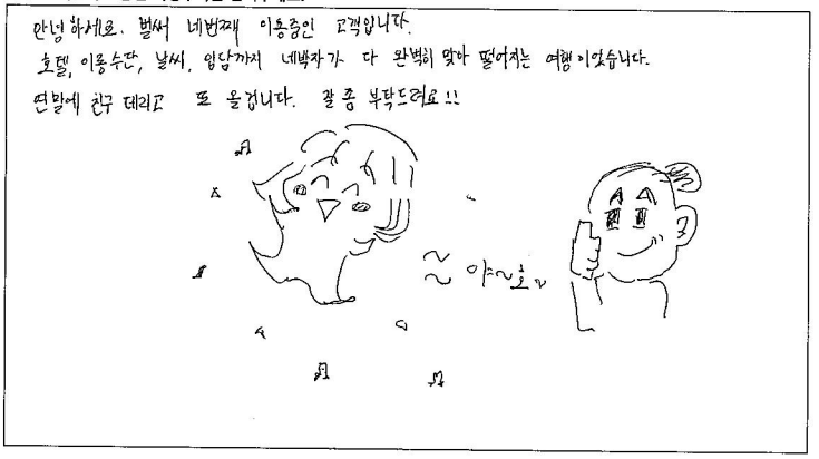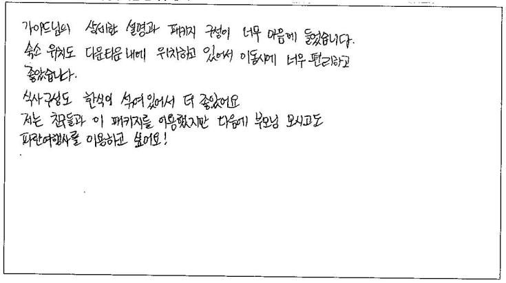 ![]() 9년만에 파란여행을 통해 4박5일 동부 여행 너무 행복하고 소중한 시간이었습니다. 여전히 알찬 구성과 배려심 깊고 연제든 도와주시는 가이드님 덕분에 불편함 하나 없는 여행이었습니다. 잠자리에 예민한 편인데 파란여행에서 선택한 호텔들은 모두 완벽한 컨디션과 시설, 위치여서 긴 이동시간이 필요한 여행의 부담을 덜어 주었던 것 같습니다. 모든 일정들 또한 값졌으며 여행중의 가이드님 설명들은 이 여행을 더욱 더 풍요롭게 해 주었습니다. 정말 감사드리며 다른 분들도 꼭 파란여행을 통해 멋진 경험 하셨으면 좋겠습니다. ![]() 가이드님의 섬세한 설명과 구성이 너무 마음에 들었습니다. 숙소 위치도 다운타운내에 위치하고 있어서 이동시에 너무 편리하고 좋았습니다. 식사 구성도 한식이 섞여 있어서 더 좋았어요. 저는 친구들과 이 패키지를 이용했지만 다음에 부모님 모시고도 파란여행을 이용하고 싶어요! ![]() 기억이 많이 남을 것 같아요. 지루하지 않게 가이드님의 다양한 이야기에 버스타고 오면서 지루하지 않고 기사님의 베스트 드라이브 만족하였고 파란여행 한국가면 많이 소개해 드리고 싶습니다. ![]() 캐나다 여행을 자유여행으로 할려고 했는데 이번 4박5일 여행만 패키지로 하면서 살짝 걱정했는데 세상에! 안했으면 얼마나 후회했을까 싶습니다. 여행사의 준비도 좋았고 차량은 정말 편안했으며 특히 가이드님의 안내말씀이 귀가 쏙쏙 들어오고 정성들여 준비하신 자료도 많은 도움이 되었습니다. 좋은 추억 만들어 주셔서 정말 감사합니다. 퀘벡, 꼭 다시오고 싶습니다. 건강히 잘 계시길 빕니다. ![]() 첫 퀘벡여행인데 장거리 여행임에도 불구하고 가이드님의 친절하고 위트있는 설명과 함께 즐거웠습니다. 2박의 호텔도 위치고 좋고 만족스러웠습니다. 꼭 여행을 앞둔 분들께 추천하고 싶고 파란여행을 통해 다른 지역 여행도 계획합니다. 고생하셨습니다. ![]() 캐나다 패키지여행을 검색하다가 가격이 제일 합리적이고 스케쥴도 마음에 들어서 선택했는데 상상이상으로 마음에 들었고 만족스러운 여행이었습니다. 숙소와 차량 모두 깔끔하고 편안했으며 특히 숙소의 위치가 관광지 주변에 위치해 있어서 자유롭게 구경하고 돌아다닐 수 있어서 좋았습니다. 여행 내내 가이드님이 친절하게 설명해주셔서 이동하는 동안 지루할 틈 없었습니다. 친구들이랑 여행하러 왔는데 다음에는 부모님 모시고 오고 싶은 여행이었습니다. 4박5일동안 캐나다 동부여행 알차게 하고 싶은 분들께 꼭 추천 드리고싶은 패키지!! ![]() 모든걸 알차게 즐길 수 있었던 여행이었습니다! 가이드님 고생하셨어요. 유퀴즈에 꼭 나와주세요 ㅋㅋㅋ 엄마랑 둘이서 즐겁게 여행했습니다. ㅎㅎ 이모랑 외할머니가 먼저 하셨는데 추천받아서 파란여행으로 결정했는데 후회없이 즐거운 추억 많이 만들고 갑니다~ ![]() 친정엄마와 5살 남자아이와 함께 여행했습니다. 결론부터 말씀드리지만 5살 아이마자도 정말 행복한 시간이었다고 말해주었습니다. 처음 캐나다 동부 여행 계획했을 때 벤쿠버에 있는 여행사를 통해 오려고 했는데 주변 지인분의 추천으로 급 여행사를 변경하였고 이 결정은 매우 현명한 선택이었다 자부합니다. 전문가이신 가이드님의 설명과 진행이 정말 매끄러우셨고 2박3일간 안전한 운행으로 장시간의 이동을 편안하게 해 주신 기사님께 이자리를 발어 다시한번 감사 인사 드립니다. 앞으로의 여행은 파란여행과 함께 하겠습니다. ![]() 날씨, 온도, 습도 파란여행과 함께한 모든 날이 좋았습니다. 다른 투어보다 세심함, 정성, 즐거움까지 더해 쉽지 않을 여정을 쉽고 뜻깊게 만들어 주었습니다. 소중한 캐나다, 인생의 스케치북에 잘 그려두겠습니다. 감사합니다. 아! 가이드 공유님 최고 ^^ ![]() 일주일 캐나다여행 중 2박3일을 패키지여행으로 퀘벡을 왔다. 짧고 굵게 볼수 있는 최고의 패키지여행이었다. 한식 메뉴 한번씩 먹은거 최고! 숙소도 최고! 아이스와인도 최고! 버스에 충전이 되는거 너무 좋고 와이파이 되는거 너무 좋아요. 호텔 마다 와이파이 사용할 수 있게 배려해 주신거 최고였어요~ 가이드님 여행자 한명 한명 가족처럼 생각해 기억해 주신것도 감동이었어요. 섬세한 여행설명 재미있었어요. ![]() 안녕하세요. 벌써 네번째 이용중인 고객입니다. 호텔, 이동 수단, 날씨, 입담까지! 네박자가 다 완벽히 맞아 떨어지는 여행이었습니다. 연말에 친구 데리고 또 올겁니다. 잘 좀 부탁드려요!! ![]() 2박3일이 순식간에 지나가버렸어요! 알찬 기획과 좋은 설명 전부 최고였습니다. 특히 가이드님의 완벽한 가이드까지! 제일 기억에 남을 것 같아요. 예상치도 못했던 아이스와인 선물까지~! 센스 굿! 캐나다 여행을 계획하고 있는 주변 사람들에게 파란여행 널리널리 소문낼께요~!! 행복한 추억을 만들어 주셔서 감사합니다. 나중에 기회가 되면 다시 꼭 이용할께요~~! |