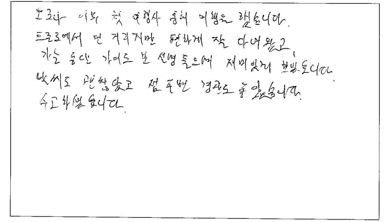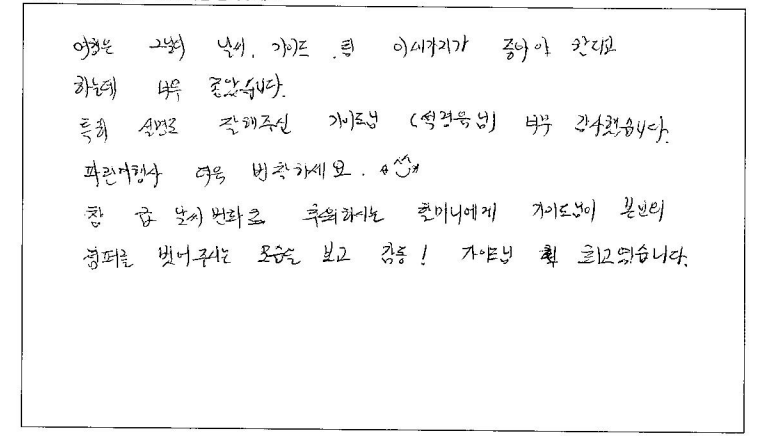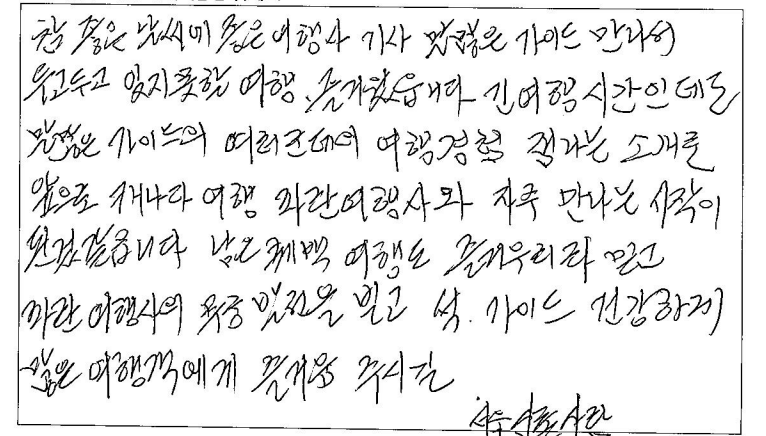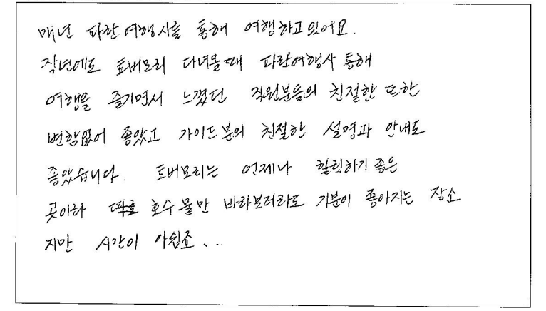 ![]() 맑고 투명한 물이있는 토버모리에 오고 싶은 뚜벅이에게 적합한 여행상품이 아니었나 싶습니다. 친절하고 유머러스한 가이드님과 함께라 더 즐거운 여행이 된거 같네요. 추천해주셨던 피시앤칩스는 한국가서도 생각날것 같아요. 가는 길에 보인 풍경, 에메랄드 빛 물과 국립공원의 싱그러움, 맛있는 피시앤칩스를 느끼고 맛보러 다음에도 또 이용하지 않을까 생각해 봅니다. ![]() 매년 파란여행을 통해 여행하고 있어요. 작년에도 토버모리 다녀올 때 파란여행 통해 여행을 즐기면서 느꼈던 직원분들의 친절함 또한 변함없이 좋았고 가이드분의 친절한 설명과 안내도 좋았습니다. 토버모리는 언제나 힐링하기 좋은 곳이라 호수 물만 바라보더라도 기분이 좋아지는 장소지만 시간이 아쉽죠.. ![]() 여행은 그날의 날씨, 가이드, 팀. 이 세가지가 좋아야 한다고 하는데 너무 좋았습니다. 특히 설명도 잘해주신 가이드님 너무 감사했습니다. 파란여행 더욱 번창하세요^^ 참, 급 날씨 변화로 추워하시는 할머니에게 가이드님이 본인의 점퍼를 벗어주시는 모습을 보고 감동! 가이드님 최고였습니다.! ![]() 코로나 이후 첫 여행사 통해 여행을 했습니다. 토론토에서 먼 거리지만 편하게 잘 다녀왔고 가는 동안 가이드분 설명 들으며 재미있게 즐겼습니다. 날씨도 괜찮았고 섬 주변 경관도 좋았습니다. 수고하셨습니다. ![]() 아침에 약간은 추웠는데 건강이 조금 안좋은 사람이라서 걱정중에 가이드님 자켓을 벗어주셔서 정말로 고맙게 좋은 여행을 할 수 있었습니다. 많은 여행경험을 재미나게 알려주셔서 앞으로 남은 여행에 많은 보탬이 될것 같네요. 파란여행 발전하시고 가이드님 건강히 오래오래 여행객들의 길잡이가 되어주세요. 감사합니다. ![]() 참 좋은 날씨에 좋은 여행사, 기사, 가이드 만나서 두고두고 잊지못할 여행, 즐거웠습니다. 긴여행 시간인데도 가이드님의 다양한 여행 경험에 대한 재미있는 소개로 앞으로 캐나다 여행시 파란여행과 자주 만나는 시작이 될것 같습니다. 남은 퀘벡 여행도 즐거우리라 믿고 파란여행의 무궁한 발전을 빌고 가이드님 건강하게 많은 여행객에세 즐거움 주시길. |