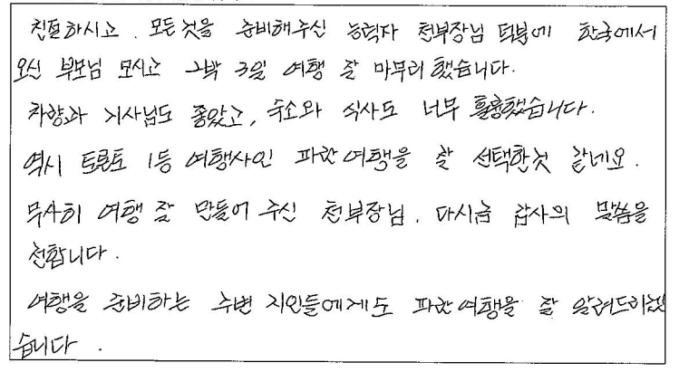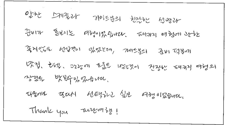 ![]() 6월 6일 ~ 6월 8일 2박 3일 동안 퀘벡/몬트리올/오타와 여행 다녀왔습니다 지인분의 추천으로 다녀오게 되었는데 너무너무 만족스러웠어요! 정말 홈페이지에 나와 있는 그대로 날씨 빼고 다 준비되어 있었어요. 정말 좋은 호텔들과 알짜배기 여행코스 그리고 식사가 한식이었던 점이 너무 좋았습니다. 자유식으로 현지 음식 먹을 수 있도록 맛집 리스트 준비해 주신 것도 감사했어요. 그리고 제일 좋았던 건 강제 쇼핑이 없었던 점과 가이드분이 말씀을 정말 잘하셔서 여행을 더 완전히 즐길 수 있었습니다. 가을에 퀘벡을 또 가게 된다면 파란 여행을 이용하고 싶네요. ![]() 여행상품 - 실제 캐나다 현지 여행사이다 보니 인터넷에서 찾지 못했던 좋은 장소들을 소개받을 수 있어 좋았습니다 가이드 안내 - 이번 여행의 핵심이라고 해도 과언이 아니다. 여행지에 대한 정보와 지식을 재밌고 쉽게 알려주셔서 단순히 여행지를 가서 보는 것이 아니라 여행지에 관한 역사와 지식을 듣고 보니 더 감명 깊게 다가왔습니다. 덕분에 여행 내내 심심하지 않고 알차게 다녀왔습니다. 식사 - 한식과 양식이 적절히 조합되어 좋았습니다. (맛은 다 맛있었어요, 선택지도 있어 기호에 맞게 고를 수 있어 Good) 호텔 - 수성과 5성급 호텔도 이루어져 있어 완전 대만족, 그리고 호텔이 다운타운 근처라 개인 시간을 할애하여 다운타운 구경을 쉽게 할 수 있었습니다. 가이드님이 직접 추천해 주신 맛집들을 소개받을 수 있어 편리했습니다~ ![]() 준비의 달인이라는 우리 가이드님 너무 감동이었습니다 가는 곳마다 자세한 설명도 너무 잘해주시고 재미나는 유머까지 여행도 여행이었지만 작은 거 하나하나 세심하게 배려해주셔서 여행이 더욱 즐거웠습니다. 고객들이 장거리 여행으로 힘들까 봐 영화, 음악도 준비해 주시고, 여행 많이 다녀봤지만, 최고의 가이드이셨습니다. 강제 쇼핑 없는 점도 좋았고 5성급 호텔에 최고의 차량과 음식 또한 너무 맛있어서 딸과의 여행이 더욱더 추억이 되고 감사한 여행이었습니다. 파란여행 번창하시고 가이드님 건강하시고 감사했습니다. ![]() 오랜만에 패키지 여행을 하게 되었는데 파란여행 문구 그대로 날씨 빼고 다 준비 되어있는 여행이었습니다. 가이드님이 정말 많은 준비를 해 주신 덕분에 오랜시간 차 안에서 보내야함에도 불구하고 지루할 틈 없는 준비성이 매번 감탄했습니다. 여행할 때 음식과 잠자리가 제일 중요한 점인데 식사도 너무 맛있는 곳이었고 호텔도 파란여행아니면 쉽게 경험해보지 못한 호텔이었습니다. 굉장히 만족스러웠고 캐나다에 있는동안 파란여행 상품 자주 이용할 것 같아요! ![]() 친절한 가이드님의 소개로 여행 내내 불편함 없이 즐거운 여행을 했습니다. 차량과 호텔 너무 좋았고 쇼핑이 없어서 너무 좋았습니다 파란 여행을 통해 캐나다 퀘벡, 오타와, 몬트리올의 역사 및 맛집 문화 등 다양한 것을 알게 되어 너무 좋았습니다. 다음에도 파란여행을 통해 다른 곳도 여행해 보고 싶습니다. ![]() 이동 거리가 긴 여행인데도 불구하고 가이드님 덕분에 지루할 틈이 없었습니다. 다양한 설명을 해주셔서 캐나다의 역사와 문화에 대해 잘 이해할 수 있었습니다. 호텔 위치도 시내에 있어 자유롭게 시내를 오갈 수 있어 좋았습니다. ![]() 다양한 설명과 자료 준비해 주신 가이드님 덕분에 즐겁고 행복한 여행 잘하고 갑니다 깨끗한 차량과 접근성이 좋은 호텔로 체크인 이후 조금 더 여행지 주변을 둘러볼 수 있어 더욱 좋았습니다. ![]() 처음 방문한 캐나다, 파란여행과 함께해서 정말 만족스러운 여행이었습니다. 가이드님의 재치 있는 입담과 알찬 정보로 2박 3일간 지루할 틈이 없었어요. 다음에 캐나다에 방문한다면 또 파란여행으로 여행하려고요! 덕분에 캐나다 잘 보고 갑니다! 파란여행 최고! 시내 숙소와 노 쇼핑, 크고 쾌적한 버스와 친절하시고 푸근한 기사님, 재치 만점 준비성 철저한 가이드님 모두 만족스러웠습니다. ![]() 안녕하세요. 퀘벡 2박 3일 정말 알차고 뜻깊게 보내고 갑니다. 가이드님 정말 친절하시고, 최고예요! 역시 전문 가이드님이라 다른 것 같아요. 여행 내용도 함께한 한국분들 모두 좋으셔서 평생 기억에 남을 것 같아요. 감사합니다. 현지 지인, 친구분들이 추천하는 이유를 알 것 같아요. 다음 여행도 꼭 파란여행을 통해 가야겠어요. 정말 2박 3일 즐겁고 행복한 경험만 가지고 갈게요. 너무 행복했습니다. 파란여행 정말 추천합니다. ![]() 알찬 스케줄과 가이드분의 친절한 설명과 준비가 돋보이는 여행이었습니다. 패키지여행에 관해 좋지 않은 선입견이 있었는데, 가이드분의 준비 덕분에 맛집, 호텔, 관광에 도움을 받는 것이 진정한 패키지여행의 장점을 맛볼 수 있었습니다. 다음에도 또다시 선택하고 싶은 여행이었습니다. Thank you 파란여행! ![]() MBTI 극 P 성향 30대 여자입니다. 여행 일정 잡고, 항공권 준비하느라 지쳐서 아무것도 준비를 못 했는데, 날씨 빼고 다 준비했다는 파란여행의 슬로건에 매료되었죠. 결과적으로 대만족이었습니다. 가이드님께서 하나부터 열까지 다 신경 써주셔서 너무 편하고 즐거운 투어였습니다. 호텔은 제가 예