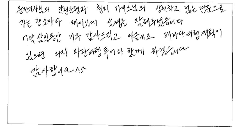 ![]() 국내에서 몰랐던 현지 여행사라 처음엔 불안했지만, 여행 전 안내와 최종 점검까지 해주셨습니다. (연락이 안 되어 고생하신 상담원님께 감사합니다^^) 장거리 여행에도 불구하고 편안하게 운전해 주신 기사분과 가이드분께 감사해요. 패키지여행에서 사실 가장 신경 쓰이는 부분이 숙박과 식사인데 다운타운 내 큰 호텔 숙박해서 놀랐고 한식으로 구성된 식사도 매우 만족했어요. 규모가 작은 식당임에도 맛과 서비스가 좋아서 큰 인상을 남겼습니다. 혼자 여행하며 나머지 퀘벡 여행을 패키지여행으로 할 지 고민했는데 파란여행을 선택한 것은 신의 한 수였어요. 즐거운 여행을 할 수 있도록 도와주신 관계자분들께 모두 감사해요. ![]() 호텔도 엄청 좋았고 밥도 다 맛있었어요! 일정도 잘 짜여 있었고 자유시간도 많아서 좋았어요 가이드님도 친절하시고 설명도 잘 해주셨어요 다음에 또 파란여행 이용할 것 같아요! 드라이버분도 친절하시고 운전도 안전하게 잘 해주셔서 좋았습니다. ![]() 두 번 다시 못해볼 감동과 즐거움을 준 여행이었습니다. 가이드님의 해박한 지식과 스피치로 캐나다 역사에 대한 이야기를 들을수록 재미있었습니다 차편도 편안하고 좋았고 머무른 호텔마다 식사도 좋았습니다 2박 3일 여행 평생 잊지 못할 추억을 가슴의 눈에 가득 담아 갑니다 가이드님 고생 많으셨고 너무 감사드립니다. ![]() 여행 일정, 자유시간 충분해요. 특히 퀘벡 저택 숙박 너무 좋았습니다. 올드 퀘벡을 가깝게 접해서 환상적입니다. 가이드님 설명 안내, 식사도 다 맛있고 버스도 깨끗하고 안전 운행까지 훌륭합니다. 저는 세 번째이지만 다음에도 가고 싶네요. 지인들 추천을 적극적으로 할게요. 감사합니다. 좋은 추억 많이 만들었어요! ![]() 퀘벡, 몬트리올의 아름다운 풍경들을 너무 좋았고 가이드님의 깨알 같은 설명 덕분에 지루하지 않게 즐겁게 여행했습니다. 차량도 깨끗하고 다운타운에 위치한 호텔로 무척 만족스러웠습니다. 적절한 개인 시간도 좋았고 식사도 맛있었습니다 덕분에 좋은 추억 만들었습니다. 감사해요! ![]() 깨끗하고 안전한 버스와 친절하고 좋은 정보와 가고 싶은 곳을 잘 안내해 주셔서 너무 좋은 여행이 되었습니다. 끝까지 친절하게 고생해 주시는 가이드님과 운전기사님께 다시 한번 감사드립니다. '파란 여행' 최고입니다! ^^ ![]() 10년 만의 부부 여행을 토론토로 연결하여 주신 파란여행에게 감사드리고 모든 여행 상품 기획을 잘하셔서 5성급 호텔 숙박과 차량, 균형적인 식단(한식/양식)으로 건강하고, 행복한 여행을 37년 결혼기념일과 함께해서 즐거웠습니다. 더불어 훌륭한 가이드님의 설명과 친절함에 감사드립니다. ![]() 네이버에 파란여행 검색해 봤을 때 너무 좋은 후기가 많아서 굉장히 의심스러웠는데 정말 해 본 패키지여행 중 제일 좋았습니다. 그리고 네이버에 가이드님 이야기가 많이 나와서 가이드님이 누군가 했는데 정말 프로 프로 같은 가이드님이셨습니다. 여행이 정말 자유시간도 많고, 직접 패키지여행 많이 다녀보고 한국인에 맞게 나쁜 건 다 잘라내고 만드신 거 같아서 정말 잘할 수밖에 없겠다고 생각했습니다 캐나다 살면서 버스 타면 매일 악취 가나도 더러웠는데 버스도 너무 쾌적하고 정말 더할 나위 없이 좋았습니다! 좋은 가족여행을 기억에 남겨 주셔서 감사합니다! ![]() 운전기사님의 안전 운행과 현지 가이드님의 상세하고 넓은 견문으로 가는 장소마다 재미있게 설명을 잘해주셨습니다 2박 3일 동안 너무 감사드리고 다음에도 캐나다 여행 계획이 있으면 다시 파란여행과 함께하겠습니다. 감사합니다^^ ![]() 기대를 안고 출발한 퀘벡여행. 가이드님의 친절한 설명과 노하우를 기대 이상의 즐거운 여행이었습니다. 특히, 몬트리올에서의 소피텔 호텔은 너무 만족스러웠습니다. 그리고 올드 퀘벡에서의 호텔 위치도 최고였습니다. 가이드님 정말 감사드려요^^ ![]() 개인으로 다니기 힘든 토론토, 퀘벡 등 여행 잘 다녀왔습니다. 호텔도 다 가까워서 좋았어요. 가이드님도 친절하셨습니다. 아이스와인도 선물로 주시고 감사합니다. |