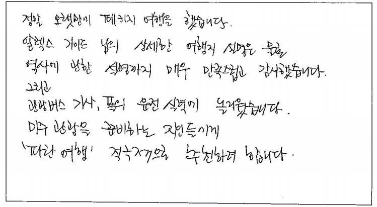 ![]() 날씨 빼고 다 준비했다는 광고처럼 정말 편안하고 즐거운 여행이었습니다. 시시각각 변하는 도로 상황마저 미리 준비하신 것처럼 바로 대응하셔서 모든 일정을 제시간에 맞춰 완료해 주셨습니다. 호텔, 차량 모두 편안하고 쾌적했고, 가이드님의 설명을 항상 유익하고 즐거웠습니다. "여행은 안 하고 후회하느니, 해보고 후회해라" 좋은 말씀 잘 새겨둘게요" 기회가 된다면 또 만나요! 파란여행! ![]() 토론토 출장을 마치고 2박3일 퀘벡 자유 여행하려고 하다가 혼자 여행은 심심할 것 같아서 신청하게 됐는데 유쾌하신 가이드님과 투어에서 만난 친구들 덕에 알차고 재미난 퀘벡 여행이 되었습니다. 호텔도 좋은 곳으로 해주셔서 편하게 잘 쉬었고 설명도 잘해 주시고 맛집 리스트와 가볼 만한 곳들을 잘 정리해 주셔서 짧은 시간 열심히 보낼 수 있었습니다 한식들도 맛있었고 운전도 나이스하고 안전운전 하게 해주셔서 감사합니다. 다음에 또 신청해 볼게요~ ![]() 왕복시간은 길었지만, 가이드님의 자세한 설명과 덤으로 역사 이야기까지 지루하지 않은 시간이었습니다. 무엇보다 쇼핑 시간이 있어 좋았고 숙소, 차량, 식사 다 괜찮았습니다. 다음 여행도 파란여행과 계획을 짤 것 같습니다. 기사님, 가이드님 수고 많으셨어요. ![]() 출장으로 캐나다 왔다가, 처음으로 여행사 통해서 여행해 봤는데 앞으로 자주 이용할 것 같아요. 여행사 상품에 대한 선입견을 깨준 파란여행! 감사합니다. 덕분에 재미있고 안전하게 여행했습니다. 다음에 가족여행으로 캐나다 다시 올 생각인데, 그때도 잘 부탁드려요! ![]() 여행을 즐기려고 파란여행을 택했는데 후회 없는 선택이었습니다. 가이드분도 재미있으셔서 시간 가는 줄 몰랐어요 일단 퀘벡에서 자유시간이 많아 좋았답니다. 다음에 또 파란여행 선택할게요~ 버스 기사님께서도 운전을 잘하셔서 멀미 없이 여행했어요. Thank you! ![]() 이 가격에 이 호텔을 이용할 수 있다는 게 놀라울 정도로 좋았습니다. 편안하고, 즐거운 여행이었습니다. 안 왔으면 후회했을 뻔…! ![]() 정말 오랜만에 패키지여행을 했습니다. 가이드님의 상세한 여행지 설명은 물론 역사에 관한 설명까지 매우 만족스럽고 감사했습니다. 그리고 관광버스 기사님의 운전 실력에 놀라웠습니다. 미주 관광을 준비하는 지인들에게 '파란여행' 적극적으로 추천하려 합니다. ![]() 코로나가 끝나고 13년 만에 다시 캐나다를 찾아 연로하신 부모님을 모시고 남편 없이 혼자 떠나는 여행이라 밴쿠버에서 출발해서 토론토에 도착한 뒤 가이드를 만나기 전까지 1박2일 동안 심적 부담감이 정말 컸습니다. 출발 전날 발목 통증을 호소하는 엄마와 여든을 바라보는 아버지까지 일정을 잘 소화하실 수 있을까 많이 염려했는데 모든 것이 기우였음을 알기까지 그리 오래 걸리지 않았습니다. 8년 저는 파란여행을 동부여행을 하고 온 동서의 추천을 받았고 밴쿠버에 사는 사람들의 커뮤니티에서도 동부여행을 파란여행이란 소릴 종종 듣는데 저도 돌아가서 똑같이 얘기할 수 있을 것 같습니다. 가이드님의 해박한 역사 지식에 감탄을 금치 못하겠어요. 정말 감사합니다. 덕분에 부모님과 즐겁고 안전한 여행 잘해서 올여름 미션 하나를 클리어했어요! ![]() 안녕하세요, 이제 막 여행을 마치고 돌아온 학생 여행객입니다! 처음에 혼자 가는 것에 대한 걱정이 많았는데 와서 좋은 인연도 많이 만들고 가이드님께서 주신 자세하고 소중한 정보 덕분에 2박 3일의 짧은 일정에도 알차게 잘 다닐 수 있었습니다. 정보 덕분에 2박 3일의 짧은 일정에도 알차게 잘 다닐 수 있었습니다. 특히, 저는 역사 설명과 맛집 리스트가 정말 마음에 들었습니다. 처음은 여행임에도 불구하고 여러 번 와볼 것과 같은 느낌으로 즐겁고 편안하게 돌아다닐 수 있게 요점만 딱딱 뽑아서 이번 여행에서는 아쉬움이 없네요 다음에 벤프를 시간 날 때 가보려고 하는데 그때도 파란여행을 또 이용해 보려고 합니다! 그만큼 정말 좋아요. ![]() 3개월의 어학연수 끝에 한국으로 돌아가는 중 파란여행을 발견했고 퀘벡을 다녀오게 되었습니다. 처음에는 여러 여행사가 있어서 어느 여행사를 선택해야 하나 망설였는데 다음에도 무조건 파란여행입니다. 첫째로 가이드님이 열정적이고 친절한 성격으로 저희를 2박3일 동안 이끌어주셨고 이동하는 내내 캐나다의 역사 궁금한 점들 주변 나라와의 관계 등등 정말 모든 것을 알고 있는 척척박사입니다. 그래서 제가 캐나다에서 생활하며 느낀 궁금한 점이나 여러 상식들을 많이 알려주셨습니다. 둘째로 일정 역시 아쉬움 없이 퀘벡의 거의 모든 것을 보고 주변 도시까지 보고 올 수 있는 일정이었습니다. 셋째로 버스 역시 크고 편안하며 이동하는 데 불편함이 없었습니다. 가이드님 감사합니다! 덕분에 좋은 여행 할 수 있었습니다! ![]() 퀘벡 2박 3일 동안 소중하고 멋진 추억 만들어 주신 가이드님께 진심으로 감사드립니다. 여행을, 어디를 가느냐보다, 누구랑 함께하느냐가 더 중요한지 다시 한번 깨닫게 되는 시간이었습니다. 버스에서도 이동 중에도 하나라도 더 알려주시려고 애쓰시는 모습에 그리고 정말 짧은 시간 동