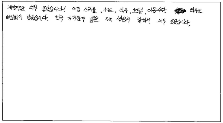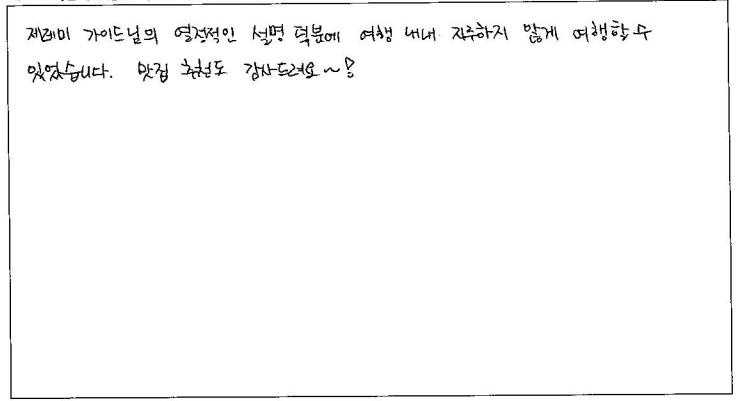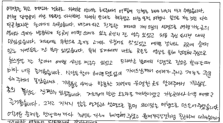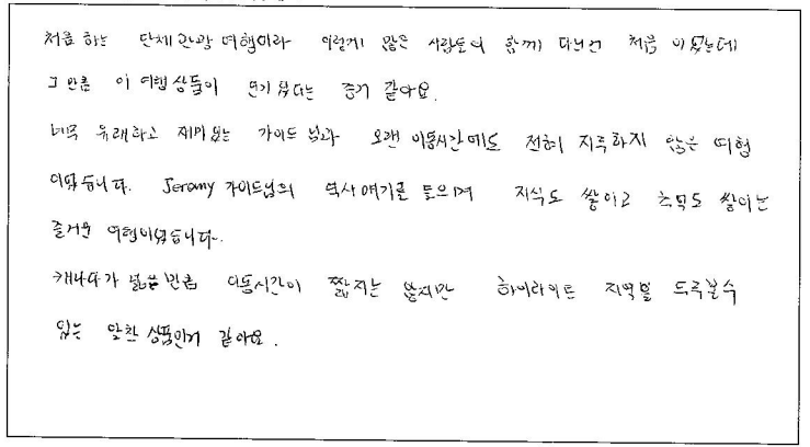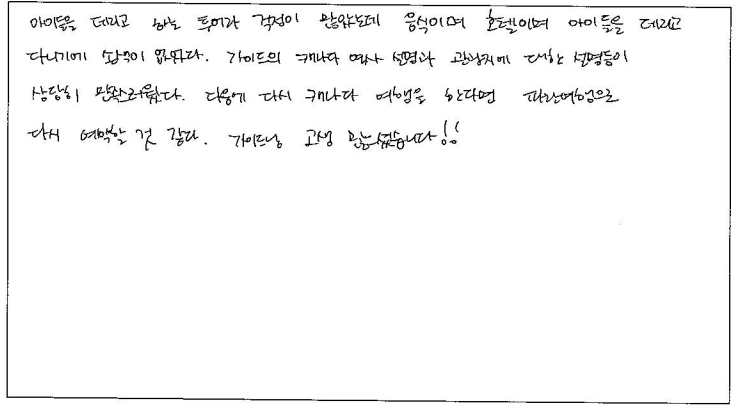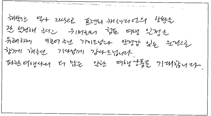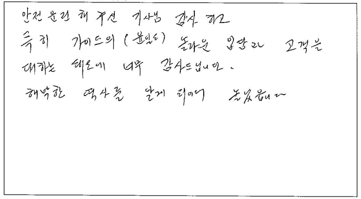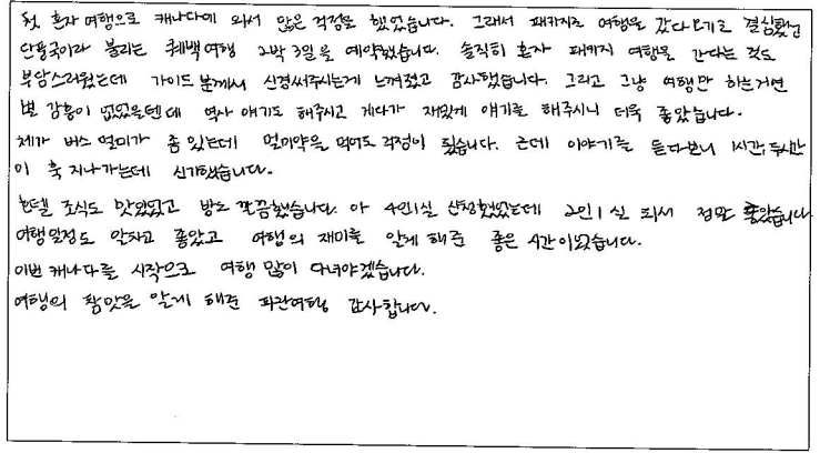 ![]() 밴쿠버에 아이들이 있어 한국에 돌아가기 전 토론토 여행을 하고 가기로 했습니다. 파란여행을 통해서 한 이 여행 너무 만족하고 갑니다. 여행상품 상담, 식사, 호텔, 특히 가이드님, 설명 너무 재미있고, 유익했습니다. 나중에 기회가 되면 파란여행 통해서 여행하고 싶습니다. ![]() 안전운전해주신 기사님 감사하고 특히 가이드님의 놀라운 입담과 고객을 대하는 태도에 너무 감사드립니다. 해박한 역사를 알게 되어서 좋았습니다. ![]() 개인적으로 너무 좋았습니다! 여행 스케쥴, 가이드, 식사, 호텔, 이동수단 하나도 빠짐없이 좋았습니다. 한국 가기전에 좋은 추억 쌓은 거 같아서 너무 좋았습니다. ![]() 해박한 역사 지식으로 프렌치 캐네디언의 상황을 잘 설명해주시고 유머로 힘든 여행 일정을 유쾌하게 이끌어주신 가이드님과 안정감 있는 운전으로 함께 해주신 기사님께 감사드립니다. 파란여행의 더 많은 알찬 여행상품을 기대합니다. ![]() 아이들을 데리고 하는 투어가 걱정이 많았는데 음식이며 호텔이며 아이들을 데리고 다니기에 손색이 없었다. 가이드의 캐나다 역사 설명과 관광지에 대한 설명들이 상당히 만족스러웠다. 다음에 다시 캐나다 여행을 한다면 파란여행으로 다시 여행할 것 같다. 가이드님 고생 많으셨습니다! ![]() 처음하는 단체관광 여행이라 이렇게 많은 사람들이 함께 다닌 건 처음이었는데 그 만큼 이 여행상품이 인기있다는 증거 같아요. 너무 유쾌하고 재미있는 가이드님과 오랜 이동시간에도 전혀지루하지 않은 여행이었습니다. 가이드님의 역사얘기를 들으며 지식도 쌓이고 추억도 쌓이는 즐거운 여행이었습니다. 캐나다가 넓은 만큼 이동시간이 짧지는 않지만 하이라이트 지역을 두루볼 수 있는 알찬 상품인거 같아요. ![]() 처음 혼자 여행으로 캐나다에 와서 많은 걱정을 했었습니다. 그래서 패키지로 여행을 갔다오기로 결심했었습니다. 단풍국이라 불리는 퀘벡여행, 2박3일을 예약했습니다. 솔직히 혼자 패키지 여행을 간다는 것도 부담스러웠는데 가이드분께서 신경써시는게 느껴졌고 감사했습니다. 그리고 그냥 여행만 하는거면 별 감흥이 없었을텐데 역사 이야기도 해주시고 게다가 재미있게 얘기를 해주시니 더욱 좋앗습니다. 제가 버스 멀미가 조금있는데 멀미약을 먹어도 걱정이 됐습니다. 근데 이야기를 듣다보니 1시간 2시간이 훅 지나가는게 신기했습니다. 호텔 조식도 맛있었고 방도 깔끔했습니다. 4인 1실 신청했었는데 2인 1실되서 정말 좋았습니다. 여행일정도 알차고 좋았고 여행의 재미를 알게해 준 좋은 시간이었습니다. 이번 캐나다를 시작으로 여행 많이 다녀야겠습니다. 여행의 참맛을 알게 해준 파란여행 감사합니다. ![]() 예약을 하고 메일과 전화로 자세한 안내를 해주셔서 어떻게 진행을 해야 하는지 알기 쉬웠습니다. 여행 당일날이 아닌 몇일전 다시 한 번 자세히 안내를 해주셨고 아침 일찍 여행사 앞으로 가는 것은 다소 피곤했지만 찾아가기 쉬웠습니다. 버스에 타고 친절한 가이드님의 설명으로 여행가는 곳의 역사와 우리가 방문하게 될 곳이 얻너 의미가 있는 곳인지 잘 알 수 있었고 처음 주신 도시락 대박 맛있었습니다. 저녁에는 무한으로 즐기는 고기와 오징어도 맛있었고 예쁜 경치와 곳곳에 숨겨져있는 자연들을 잘 볼 수 있었습니다. 특히 도깨비에 나오는 곳들은 영상을 통해 설명해주심으로 핫스팟을 잘 찾아서 예쁜 사진을 찍을 수 있었고 드라마를 볼때의 설렘으로 장소를 찾아갈 때 마다 너무 즐거웠습니다. 식당을 찾아 헤멜 필요없이 가이드님께서 데려가 주시고 메뉴도 주문해 주셔서 좋았습니다. 기념품을 사거나 방문한 지역에 유명한 곳도 알려주어서 가고싶은 곳의 동선도 잘 짤수 있었습니다. 저녁에 만난 오로라도 대박이었고 가는 곳마다 너무 예쁘고 즐거웠습니다. 그리고 지치지 않는 열정과 설명으로 조금 더 의미있는 여행으로 만들어 주셨습니다. 어려운 문제를 만날때 마다 최선을 다해 해결해주셨고 원래 지인인것처럼 친근하게 대해주셔서 편안한 여행이 되었습니다. 감사합니다. ![]() 날씨 빼고 모든게 완벽했던 퀘벡여행이었어요 아름다운 캐나다의 자연과 역사를 눈과 마음에 담아갑니다. 가이드님의 세심한 케어와, 너무나 재밌고 귀에 쏙쏙들어오는 이야기에 버스에서의 시간도 알차게 잘 보냈습니다. ![]() 가이드님의 열정적인 설명 덕분에 여행내내 지루하지 않게 여행할 수 있었습니다, 맛집 추천도 감사드려요~! |