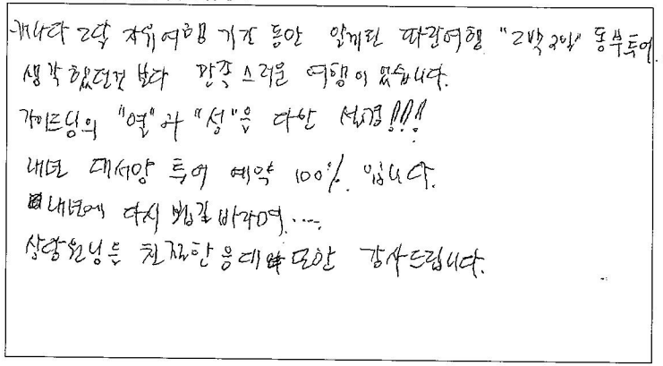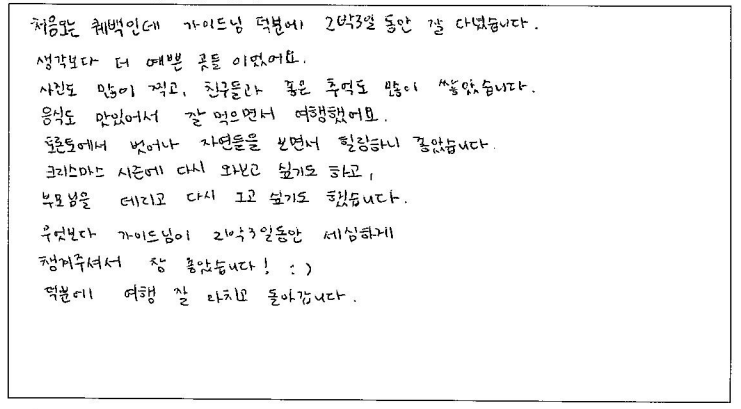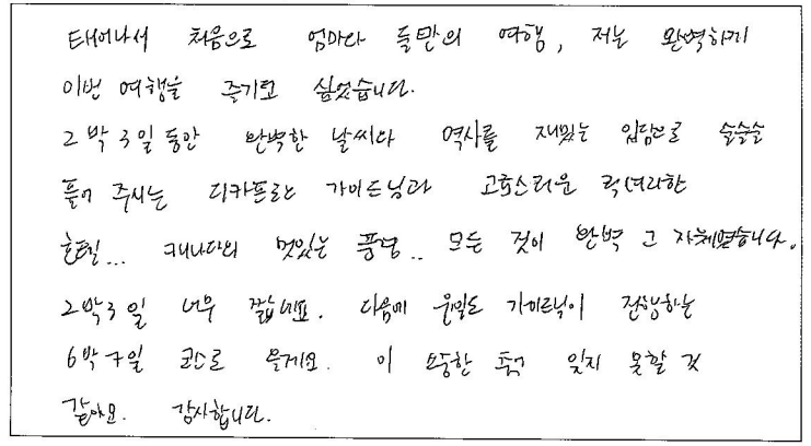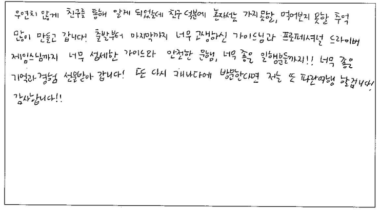 ![]() 먼저, 가이드님 최고!!! 몇년 전에 다녀온 퀘벡여행보다 일정도 알차고 호텔도 중심가에 위치한 조인하지 않은 호텔로 업그레이드 되어 감사합니다. 식사도 타여행사에 비해 맛있고, 풍족했어요 또한 자유식도 가이드님의 자세한 설명으로, 캐나다의 현지식으로 미식여행이 되었네요 한국에 가면 파란여행을 지인들에게 많이 추천해야겠어요 ㅎㅎ ![]() 캐나다에서의 마지막 생활을 마무리하기 위해 퀘벡 여행을 신청했는데 혼자서 계획했으면 놓쳤을 법한 장소들도 방문하게 되어서 좋았습니다. 투어는 처음이라 걱정했지만 밥, 숙소가 누구나 만족할 듯한 좋은 것들로 준비해 주셔서 감사합니다. ![]() 태어나서 처음으로 엄마와 둘만의 여행, 저는 완벽하게 이번 여행을 즐기고 싶었습니다. 2박 3일동안 완벽한 날씨와 역사를 재밌는 입담으로 술술술 풀어 주시는 가이드님과 고급스러운 럭셔리한 호텔, 캐나다의 멋있는 풍경. 모든 것이 완벽 그 자체였습니다. 2박 3일 너무 짧네요. 다음에 가이드님이 진행하는 6박 7일 코스로 올게요. 이 소중한 추억 잊지 못할 것 같아요, 감사합니다. ![]() 오래 전부터 설렘을 가졌던 캐나다 단풍 여행이라 기대가 컸었는데 히어로 같은 가이드님을 만나 기대 이상의 여행이 됐다. 중, 고등학교때 들었던 세계사 시간으로 다시 돌아간 기분이라 정말 행복했다. 호텔은 호텔대로 좋았으며 음식은 비주얼에 비해 맛이 좋아 대 반전으로 행복했다. 항상 자유여행만해서 패키지 여행에 대한 호감이 없었는데 자유여행 중 이런 프로그램에 참여한다면 여행의 질이 향상될 것 같다는 생각의 전환을 갖는 기회가 됐다. ![]() 우연치 않게 친구를 통해 알게 되었는데 친구 덕분에 혼자서는 가지 못할, 먹어보지 못할 추억 많이 만들고갑니다! 출발부터 마지막까지 너무 고생하신 가이드님과 프로페셔널 드라이버 제이스님까지 너무 섬세한 가이드와 안전한 운행, 너무 좋은 일행분들까지! 너무 좋은 기억과 경험 선물받아 갑니다! 또 다시 캐나다에 방문한다면 저는 또 파란여행 할겁니다! 감사합니다! ![]() 2018년 4월 말 날씨빼고 완벽했던 기억을 뒤로 한 채, 5년만에 다시 캐나다를 방문하면서 파란여행 퀘벡투어를 다시 신청하였습니다. 그 때보다 더 좋은 프로그램과 완벽한 날씨, 그리고 패키지 투어의 "꽃" 우리의 가이드님이 있어서 더 좋았습니다! 18년도는 혼자였지만 23년도는 결혼해서 와이프와 같이 파란여행을 통해 함께 추억을 만들어 주셔서 고맙습니다! ![]() 캐나다 2달 자유여행 기간 동안 알게 된 파란여행. "2박 3일" 동부투어 생각했던 것보다 만족스러운 여행이었습니다. 가이드님의 "열"과 "성"을 다한 설명!!! 내년 대서양 투어 예약 100%입니다. 내년에 다시 뵙길 바라며... 상담원님들 친절한 응대 또한 감사드립니다. ![]() 처음오는 퀘벡인데 가이드님 덕분에 2박3일 동안 잘 다녔습니다. 생각보다 더 예쁜 곳들이었어요 사진도 많이 찍고, 친구들과 좋은 추억도 많이 쌓았습니다. 음식도 맛있어서 잘 먹으면서 여행했어요 토론토에서 벗어나 자연들을 보면서 힐링하니 좋았습니다. 크리스마스 시즌에 다시 와보고 싶기도 하고 부모님을 데리고 다시 오고 싶기도 했습니다. 무엇보다 가이드님이 2박 3일동안 세심하게 챙겨주셔서 참 좋았습니다! 덕분에 여행 잘 마치고 돌아갑니다. |