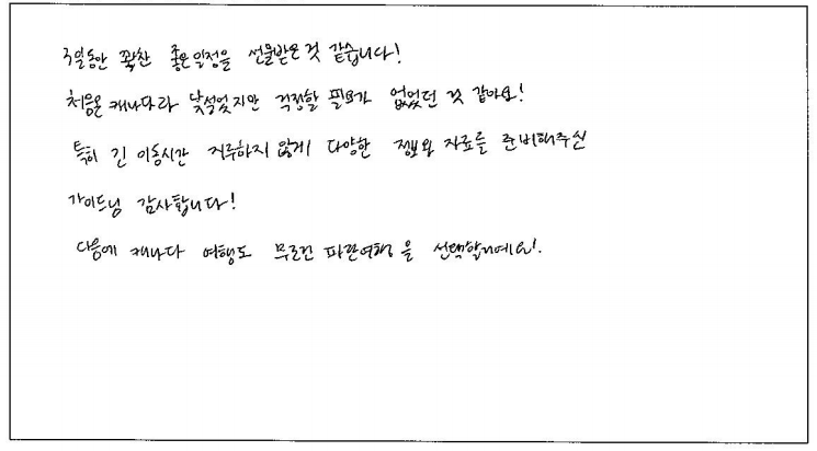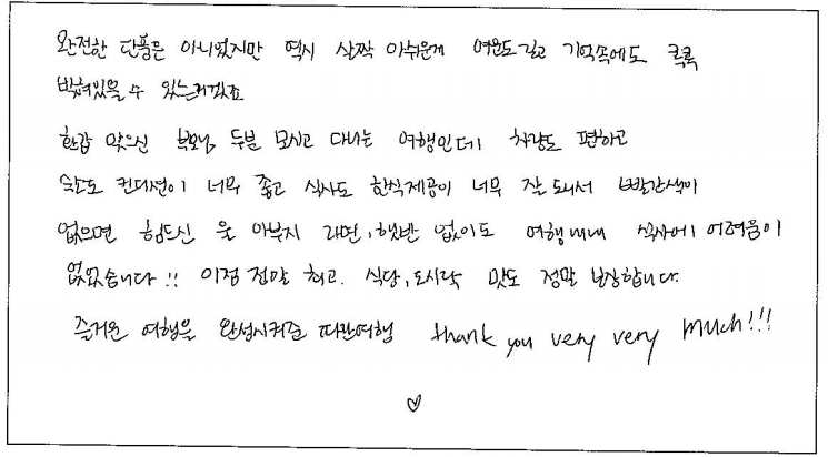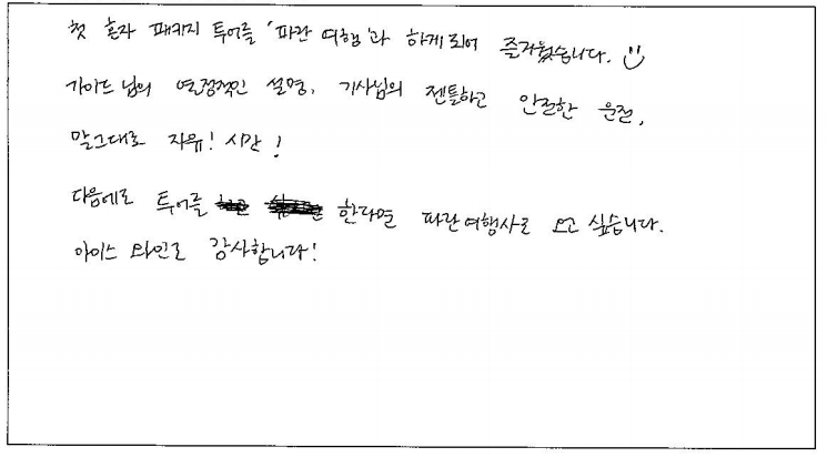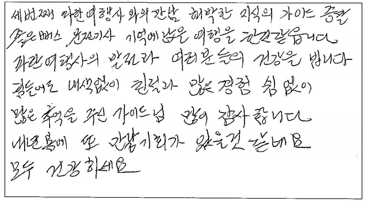 ![]() 다른 여행사에서 준비하는 한식보다 파란여행에서 방문했던 한식당 음식이 훨씬 맛있었어요 호텔도 너무 좋았고, 가이드님의 빠른 일처리로 시간을 아낄 수 있었어요. 말씀도 재밌게 잘하시고 덕분에 즐거운 여행할 수 있었습니다. 파란여행 대박나세요! ![]() 날씨가 너무 좋았다. 멋지고 웅장한 나이아가라 폭포는 다시 오고 싶다. 퀘벡의 엔틱스러운 건물 그리고 골목과 성들은 여행의 절정이다. 위트있고 능숙하게 많은 인원들을 지루함없이 끌어주고 안내해 주신 가이드님은 멋지셨다. 멋진 캐나다 여행 자랑하고 광고할게요. ![]() 3일동안 꽉찬 좋은 일정을 선물 받은 것 같습니다! 처음 온 캐나다라 낯설었지만 걱정할 필요가 없었던 것 같아요! 특히, 긴 이동시간 지루하지 않게 다양한 정보와 자료를 준비해주신 가이드님 감사합니다! 다음에 캐나다 여행도 무조건 파란여행을 선택할거에요! ![]() 처음 혼자 패키지 투어를 '파란여행'과 하게 되어 즐거웠습니다 :) 가이드님의 열정적인 설명, 기사님의 젠틀하고 안전한 운전. 말 그대로 자유! 시간! 다음에도 투어를 한다면 파란여행으로 오고싶습니다. 아이스와인도 감사합니다! ![]() 완전한 단풍은 아니었지만 역시 살짝 아쉬운게 여운도 길고 기억속에도 콕콕 박혀있을 수 있는거겠죠 환갑 맞으신 부모님 두분 모시고 다니는 여행인데 차량도 편하고 숙소도 컨디션이 너무 좋고 식사도 한식제공이 너무 잘되서 빨간색이 없으면 힘드신 울 아부지. 라면, 햇반 없이도 여행내내 식사에 어려움이 없었습니다! 이점 정말 최고! 식당, 도시락 맛도 정말 보장합니다. 즐거운 여행을 완성시켜준 파란여행. Thank you very much!!! ![]() 세번째 파란여행과의 만남, 해박한 지식의 가이드. 정말 좋은 버스와 운전 기사님. 기억에 남은 여행을 한 것 같습니다. 파란여행의 발전과 여러분의 건강을 빕니다. 힘들어도 내색없이 친절과 많은 경험을 쉼없이 추억을 남겨주신 가이드님, 감사합니다. 내년 봄에 또 만날기회가 있을 것 같네요. 모두 건강하세요. |