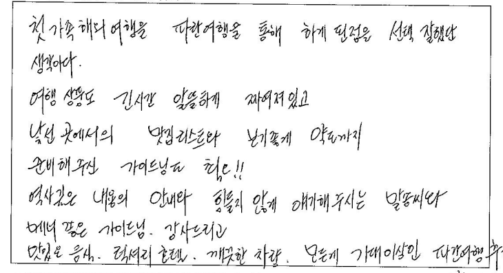 ![]() 캐나다 동부여행을 계획하던 중 파란여행에 대해 알게되었습니다. 솔직히 투어 시작 전에는 단체여행에 대해 큰 기대를 하지 않았습니다. 그러나 파란여행과 함께한 캐나다 동부여행은 모두 만족스러웠어요! 제가 여행에서 주로 중요하게 생각하는 것이 숙소, 자유시간(좋은일정), 가이드인데 숙소는 5성급, 힐튼 등 생각했던 것 그이상으로 너무 좋았구요. 일정도 정말 알차면서도 충분한 자유시간이 제공되어서 좋았습니다. 퀘벡에서 보고싶은 것이 많았는데, 덕분에 계획했던 모든 것들을 볼 수 있었습니다. 이번 여행에서 가장 만족스러웠던 것은 가이드님이셨어요. 재미있으면서도 유익한 다양한 이야기들을 해주셨고, 많이 웃게해주셨습니다. 또한 솔직하시면서도 저의 여행이 좋은 추억들로만 가득할 수 있게 노력해주셨어요 특히, 불편을 말씀드렸을 때 바로 해결해주시고 와이파이 연결과 같이 사소한 부분들도 다 신경써주셨어요. 정말 감사드립니다. ![]() 캐나다 동부 투어 4박5일 일정을 파란투어와 함께 하였는데 기대했던 것보다 많은 지역에서 다양한 관광을 하고 가는 것 같아 만족합니다! 투어여서 숙소도 많은 기대를 하지 않았는데 호텔 컨디션들이 매우 좋아서 묵는동안 큰 불편함없었고, 지역별 자유시간마다 안내, 맛집 정보, 지도를 제공해주셔서 많은 정보가 없던 지역에서도 알차게 즐기고 올 수 있었습니다. 투어 특성상 이동 시간이 길었는데, 그 시간마다 가이드님께서 적절하게 역사 이야기 등을 유쾌하고 흥미롭게 말씀해주셔서 긴 이동시간도 지루하지 않게 즐길 수 있었습니다! 가이드님 감사드려요 :) ![]() 첫 가족해외여행을 파란여행을 통해 하게 된 점을 선택 잘했다는 생각이다. 여행 상품도 긴시간 알뜰하게 짜여져있고 낯선 곳에서의 맛집리스트와 보기 좋게 약도까지 준비해주신 가이드님도 최고!! 역사 깊은 내용의 안내와 힘들지 않게 얘기해주시는 말솜씨와 매너 좋은 가이드님, 감사드리고 맛있는 음식. 럭셔리 호텔, 깨끗한 차량, 모든게 기대이상인 파란여행 추천합니다. ![]() 2박3일의 짧은 일정이었지만 중요한 여행명소를 빠뜨리지 않고 방문하였고 특히, 이번 여행의 하이라이트인 퀘벡에서 여유있는 시간을 보낼 수 있게 짜여진 일정이 좋았습니다. 호텔과 식사도 기대이상으로 훌륭했으며, 열정적이고 박식한 가이드님 덕분에 새로운 역사 지식도 많이 배운 뜻깊은 여행이 되었습니다. ![]() 코로나 이후의 장기여행이라 기대 많이 했는데 역시나 파란여행의 캐나다 동부투어를 신청하길 잘했다는 생각이 드네요. 동부의 중요한 곳 모두를 둘러보고 무엇보다 너무 예쁜 퀘벡에서의 여유있는 자유시간이 좋았어요. 또 헤메지 않도록 지도와 맛집리스트까지 준비해주시는 가이드님의 센스! 호텔들도 너무 좋았고 덕분에 잘 여행하고 갑니다. 파란여행의 다른 투어들도 다음에 이용해볼거에요. 감사합니다. ![]() 넓은 캐나다 동부여행을 파란여행을 통해 알차게 보내고 갑니다. 친절하신 본드 가이드님 덕분에 즐겁게 다양하게 여행했어요. 자유시간도 길게 주시고, 여행지 마다 설명도 재미있게 잘 해주셨어요. 그냥 자유여행으로 왔다면 놓치고 돌아갈 수 있던 것들도 다 얻어가네요. 감사했습니다. 그리고 장시간 안전하고 친절하게 해주신 기사님께도 감사합니다. ![]() 빡빡한 일정에도 불구하고, 캐나다 여행에서 놓쳐선 안될만한 아름다운 경관들을 많이 볼 수 있어서 좋았습니다. 적절한 시간 안내와 가이드님의 훌륭한 통솔력으로 시간 낭비 없이 짜임새 있는 여행을 즐길 수 있었습니다. 숙박과 식삳 매우 훌륭했습니다. ![]() 국내 여행사를 통해 파란여행사를 추천받았고 여행 상품을 주변 블로거들의 여행후기르 보고 선택했는데 기대이상 좋은 여행이었다. 가이드님의 위트있는 말솜씨와 노쇼핑 또한 파란여행에서 가장 많이 뽑는 내용인데 그 또한 만족했다. 깨끗한 차량과 안전하게 운전해주시는 기사님도 감사드리고 5성급 럭셔리 호텔에서의 편안한 잠자리 또한 퍼펙트!! 다음번 해외여행때에도 파란여행을 선택하리라~ 땡큐^^ ![]() 토론토 - 오타와 - 몬트리올 - 퀘벡 - 나이아가라 캐나다로 여행오는 4 여왕님들을 위해 어디가 좋을지 한참 고민하다가 동부여행을 선택하게 되었어요. 언제 다시 함께 할지 모르는 여행이기에 모든게 신중했는데 파란여행을 선택한 건 행운이었던 것 같아요. 쇼핑이 없는 건 물론 각 명소지의 설명과 맛집까지 알려주시고 여행 내내 마주하지 않게 분위기를 만들어주셔서 가족들과 좋은 시간을 보낼 수 있었어요. 김영규가이드님 너무 고생하셨어요. 고마워요 파란여행! ![]() 토론토나 몬트리올에서의 관광과 단풍구경도 좋았고 특히 올드퀘벡에서의 자유시간과 야경관광이 아주 좋았습니다. 그리고, 가이드님의 열정 넘치는 역사, 지역 설명은 기억에 오래 남을 것 같습니다. 감사하고 수고 하셨습니다. ![]() 오래간만에 패키지 여행을 이용해 여행을 했다. 덥지도않고 춥지도 않아서 여행 다니기에 좋았다. 캐나다의 가는 곳이 엄청 넓어서 이동거리가 길어 힘들 것 같았다. 하지만, 가이드님의 친절한 설명, 위트까지 이동하