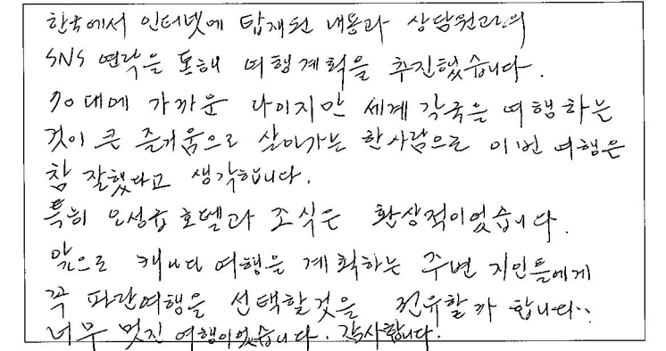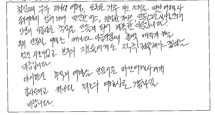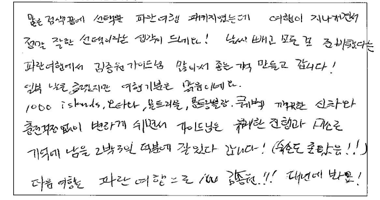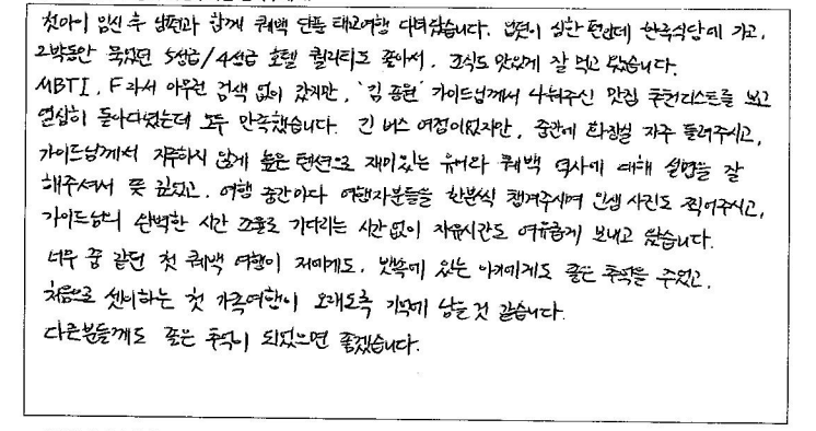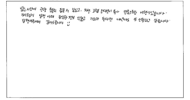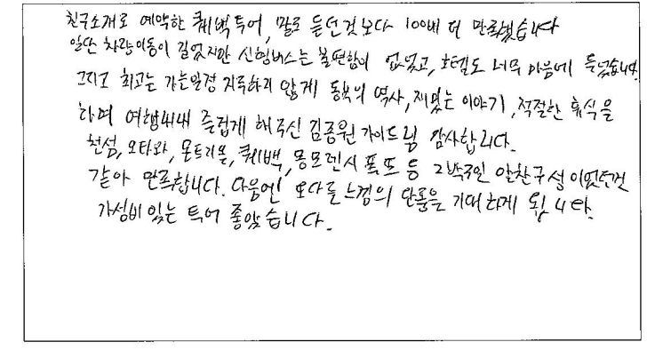 ![]() 날씨가 안좋았음에도 가이드님 에너지와 친절함 덕분에 같이 투어 다녔던 분들도 축 처지지 않고 즐겁게 여행 다녔던것 같아요! 호텔, 식사, 기획 만족스러웠고 다른 여행지도 파란여행과 갈 의향 있습니다! 차량도 편하게 이동하기에 너무 좋았습니다. 가이드 동반, 자유시간 알맞게 가이드님이 시간 분배 효율적으로 해주신 덕분에 알찬 패키지 여행이었던것 같습니다. 이동중에도 가이드님의 유쾌하고 도움되는 설명, 재치있는 진행덕에 심심할 틈 없이 도움 많이 되었습니다. 날씨는 안좋았지만 예쁘게 물든 단풍구경 너무 운치있고 가을 시즌 퀘벡. 추천합니다. ![]() 10/7 ~ 10/9 가이드님과 함께한 2박3일 캐나다 동부여행! 정말 기억에 남을 아름다운 여행이었어요! 비가온다는 소식에 걱정했었는데 비오는 날을 비오는 풍경과 단풍이 한데 어우러져 아름다웠고 맑은 날은 또 화창환 단풍을 볼 수 있어서 더 좋았어요! 아름다운 마인드와 세세함 배려로 여행을 한층 더! 즐겁고 알차게 해주신 가이드님, 운전으로 수고해 주신 기사님, 감사합니다.! ![]() 아름다운 가이드님과 함께 편안하고 즐거운 여행 보냈어요. 2박3일 스케쥴과 여행객 한사람 한사람 꼼꼼하게 체크하시고 신경써주신 덕분에 멋진 여행 했습니다. 곳곳마다 친절한 설명과 사진촬영 등 그리고 너무 좋은 호텔들과 멋진 조식들도 기억에 남을거에요. 수고해주신 믿음직한 가이드님 감사드리고 함께 여행하는 분들과 보낸 2박3일 소중한 추억으로 마음에 깊이 간직할께요. 감사합니다! ![]() 첫 아이 임신 후 남편과 함께 퀘벡 단풍 태교 여행 다녀왔습니다. 입덧이 심한편인데 한국식당에 가고 2박동안 묵었던 5성급 / 4성급 호텔 퀄리티도 좋아서 조식도 맛있게 잘 먹고 왔습니다. MBTI F 라서 아무런 검색 없이 왔지만 가이드님께서 나눠주신 맛집 추천리스트를 보고 열심히 돌아다녔는데 모두 만족했습니다. 긴 버스 여정이었지만 중간에 화장실 자주 들려주시고 가이드님께서 지루하지 않게 높은 텐션으로 재미있는 유머와 퀘벡 역사에 여행 설명을 잘 해주셔서 뜻 깊었고 여행 중간마다 여행자분들 한분씩 챙겨주시며 인생 사진도 찍어주시고 가이드님의 완벽한 시간 조율로 기다리는 시간 없이 자유시간도 여유롭게 보내고 왔습니다. 너무 꿈 같던 첫 퀘벡 여행이 저에게도 뱃속에 있는 아이에게도 좋은 추억을 주었고 처음으로 셋이하는 첫 가족여행이 오래도록 기억에 남을 것 같습니다. 다른분들께도 좋은 추억이 되었으면 좋겠습니다. ![]() 짧은 시간에 관광 충분히 즐길 수 있었고 차량, 호텔 컨디션이 좋아 만족스러운 여행이었습니다. 가이드님의 열정 아래 유익한 정보 익혔고 기회가 된다면 내년에도 또 신청하고 싶습니다. 잘 챙겨주셔서 감사드립니다. ![]() 친구 소개로 예약한 퀘벡 투어, 말로 듣던것 보다 100배 더 만족했습니다. 차량 이동이 길었지만 신형버스로 불편함이 없었고 호텔도 너무 마음에 들었습니다. 그리고 최고는 가는 일정 지루하지 않게 동부의 역사, 재미있는 이야기, 적절한 휴식을 하며 여행 내내 즐겁게 해주신 가이드님 감사합니다. 천섬, 오타와, 몬트리올, 퀘벡, 몽모렌시 폭포 등 2박3일 알찬구성이었던것 같아 만족합니다. 다음에 또 다른 느낌의 단풍을 기대하게 됩니다. 가성비 있는 투어 좋았습니다. ![]() 한국에서 인터넷에 탑재된 내용과 상담원과의 SNS연락을 통해 여행 계획을 추진했습니다. 70에 가까운 나이지만 세계 각국을 여행하는 것을 큰 즐거움으로 살아가는 한 사람으로 이번 여행은 참 잘했다고 생각합니다. 특히 5성급 호텔과 조식은 환상적이었습니다. 앞으로 캐나다 여행을 계획하는 주변 지인들에게 꼭 파란여행을 선택할 것을 권유할까 합니다. 너무 멋진 여행이었습니다. 감사합니다. ![]() 10년을 준비해온 여행이 우여곡절 끝에 드디어 시작이 되었습니다. 준비과정에서 동부를 9일 예정으로 어떻게 프로그램을 짤까 한국에서 오는 친구들, 45년 넘은 친구들과 최대로 멋진 추억이 남아야 겠다고 연구하고 찾아보고 찾아보고... 선택한 파란여행의 최선을 다하는 가이드님의 상쾌한 인도와 날씨만 준비 안됬다고 하는 문구처럼 미래 상활까지 대비하는 착착 진행되는 프로그램에 감사하고 즐거웠습니다. 비에 젖은 예쁜 단풍의 색깔처럼 우리의 오랜 우정도 파란여행으로 더욱 짙고 아름다워졌습니다. ![]() 파란여행과 함께한 퀘벡 단풍여행은 최고의 가이드님 덕분에 너무 편안하고 즐거운 시간이었습니다. 50명이 넘은 인원임에도 불구하고 한명한명 다 세심하게 신경써서 잘 여행할 수 있도록 도와주시고 각 관광지마다 그 지역의 역사나 특색, 맛집 등 필요한 정보만 쏙쏙 알려주셔서 더 많은 정보들을 알 수 있었습니다. 호텔 컨디션도 다 좋았고 이동시간이 긴대도 편안한 운전으로 잘 쉬면서 이동할 수 있게 해줬습니다. 가이드님이 더 많은 걸 관광할 수 있도록 배려해주신 덕분에 짧은 기간에 많은 것들을 보고 돌아가게 되어 행복한 여행이었습니다. ![]() 많은 검색끝에 선택한 파란여행 패키지였는데 여행이 지나가면서 정말 잘한 선택이라는 생각이 드네요! 날씨 빼고 모든 걸 준비했다