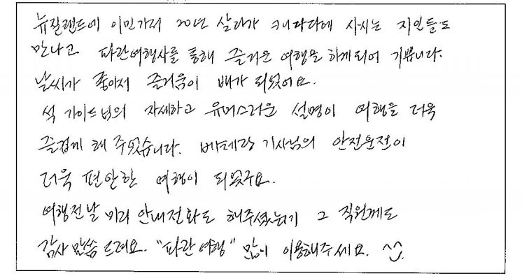 ![]() 파란여행이 유명하고 후기도 좋아서 큰 고민없이 선택했는데 예상했던 것보다 더 좋았어요 2박3일동안 킹스턴, 퀘벡, 몬트리올, 오타와 다 돌아볼 수 있어서 너무 좋았어요 머물렀던 호텔도 만족스러웠습니다. 친절하신 가이드님 덕분에 긴 이동시간이 지루하지 않았고 버스기사님이 안전운전해주셔서 편안한 여행이 되었어요 짧은 시간동안 잊지못할 기억 만들어주셔서 감사합니다!!! ![]() 처음 경험한 패키지 여행인데 꼼꼼하게 꽉 채워진 일정에 시간이 아깝지 않은 여행이었습니다. 여행하는 내내 가이드님의 친절하고 재미있는 설명에 더욱 알차고 흥미로운 여행이 될 수 있었던 것 같습니다. 기사님의 운전실력은 감튼을 자아낼 만큼 최고였고 석 가이드님의 열정과 노고에 다시 한번 감사드립니다. ![]() 아들한테 다녀온 김에, 생전 처음 캐나다 여행에서 파란여행을 만났습니다. 평생 잊지 못할 여행을 하면서 가이드님과 기사님을 만나 자세한 설명과 친절한 안내도 구경 잘하고 고마운 마음 가득 담아 귀국하겠습니다. ![]() 좋은 계절 가을에 캐나다를 여행하게 되어서 좋았습니다. 아름다운 여행지, 천섬, 퀘벡 가이드님의 친절한 설명으로 캐나다에 대하여 많이 알게되었습니다. 기사님과 가이드님의 친절함이 좋았고 정확한 시간 약속이 좋았습니다. 덕분에 좋은 여행이 되었습니다. 감사합니다. ![]() 10월 13일 퀘벡 2박 3일 일정을 가이드님과 함께했습니다. 몰랐던 몬트리올과 퀘벡의 역사를 들으면서 이동하며 굉장히 재밌었습니다. 혼자 여행왔지만 다른 분들과 조인해서 식사도 하고 사진도 찍어주며 지루할 틈이 없었습니다. 두번째 오는 동부 여행이었지만 아주 즐겁게 보냈습니다. 혼자 오실 분들한테 아주 추천드리는 상품입니다~~!! ![]() 뉴질랜드에 이민가서 20년 살다가 캐나다에 사시는 지인들도 만나고 파란여행을 통해 즐거운 여행을 하게 되어 기쁩니다. 날씨가 좋아서 즐거움이 배가 되었어요 가이드님의 자세하고 유머스러운 설명이 여행을 더욱 즐겁게 해주었습니다. 베테랑 기사님의 안전운전이 더욱 편안한 여행이 되었고요 여행 전 날 미리 안내전화도 해주셨는데 그 직원께도 감사 말씀드려요. '파란여행' 많이 이용해주세요 ![]() 사실 별 다른 정보 없이 퀘벡 2박3일 여행을 오게 되었는데 가이드님이 설명을 너무 잘해주셔서 몰랐던 사실도 알게 되어 여행에 많은 도움이 되었습니다. 여행 내내 '우리 가이드님 너무 좋다'는 생각을 많이 했습니다. 여행하는 동안 날씨도 좋고, TV로만 보던 곳에 내가 와있다는게 믿기지 않을 정도로 좋았습니다. 앞으로 기회가 된다면 다시 오고 싶네요. ![]() 호텔과 식사가 너무 좋았고, 특히 호텔 조식이 정말 마음에 들었습니다. 가이드님이 너무 저희들을 편하게 해주셨고 기사님이 운전을 아주 조심스럽게 안전하게 하셨어요 버스도 깨끗하고 의자도 너무 편했습니다. 행복한 여행이 되었습니다. 감사합니다. ![]() 친절하게 설명해주시는 가이드님 덕분에 새로운 캐나다에 대해서 더알고 오랜만에 딸들과 즐거운 여행을 할 수 있어 감사드려요. 또 안전운행을 해주신 기사님과 가이드님에게도 감사드립니다. ![]() 2박3일간 가이드님의 잔잔한 캐나다의 역사 이야기로 오타와가 수도인 것도 몰랐던 것을 많이 알아가는 소중한 시간이었습니다. 가족들과 함께한 시간이 편안하고 행복한 시간이었고 좋은 추억을 안고 갑니다. 단풍국을 만끽할 수 있었고 짜여진 여행 기획도 알차지만 200명이 넘는 인원을 분산시켜 혼잡하지 않게 편안하고 안전하게 도와주신 가이드님과 기사님께 감사드립니다. ![]() 펜데믹 이후의 첫 패키지 버스여행으로 파란여행의 2박3일 퀘벡을 선택해서 쯜거운 여행을 할 수 있었습니다. 2박3일 동안 날씨도 좋았고 퀘벡과 몬트리올, 오타와를 다 둘러볼 수 있는 알찬 여행이었어요 800km를 이동하는 동안 지루할 틈 없이 캐나다의 역사와 관광지를 재미있게 설명해주신 가이드님께 감사드려요. 눈도 호강하고, 더불어 겉만 흝는 개인적인 여행이 아닌 스토리텔링이 있는 여행으로 오랫동안 기억에 남을 것 같습니다. 이번 여행을 계기로 캐나다와 미국 동부를 다시 여행하고 싶어 다음 일정을 꿈꾸는 것도 즐겁네요. ![]() 퀘벡까지 너무 멀어서 막막했는데 덕분에 편하게 다녀왔어요 가이드님이 친절하시고 설명도 잘 해주셔서 감사했습니다. 4-4호차 |