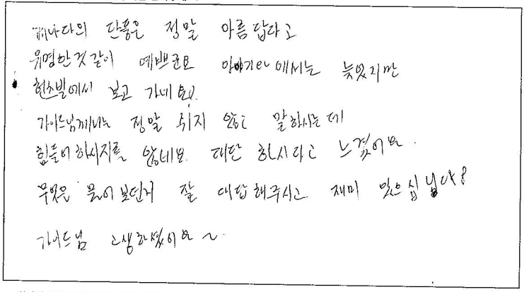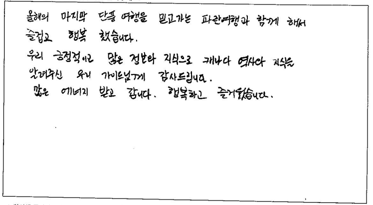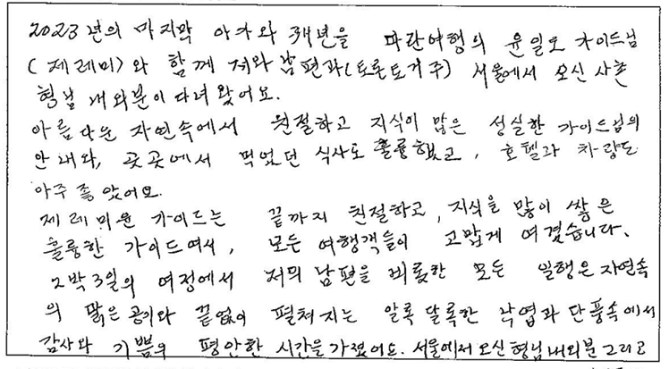 ![]() 2023년의 마지막 아가와 캐년을 파란여행의 가이드님과 함께 저와 남편과 서울에서 오신 사촌형님 내외분이 다녀왔어요 아름다운 자연속에서 친절하고 지식이 많은 성실한 가이드님의 안내와 곳곳에서 먹었던 식사도 훌륭했고 호텔과 차량도 아주 좋았어요 가이드는 끝까지 친절하고 지식을 많이 쌓은 훌륭한 가이드여서 모든 여행객들이 고맙게 여겼습니다. 2박 3일의 여정에서 저의 남편을 비롯한 모든 일행은 자연속의 맑은 공기와 끝없이 펼쳐지는 알록달록한 낙엽과 단풍속에서 감사와 기쁨의 평안한 시간을 가졌어요 ![]() 재미있고 알찬 여행이었습니다. 특히, 가이드님의 많은 배려가 있었습니다. 주위에 이 여행에 관심있는 분에게 적극 추천하고 싶습니다. 감사합니다. ![]() 매우 매우 좋았어요 가이드님 수고많았어요 음식도 훌륭했어요 호텔도 훌륭했어요 모두 훌륭했어요. ![]() 모든 일정을 최선을 다해 주셔서 감사합니다. 아름다운 단풍에 힐링되어 만족하고 행복하게 돌아갑니다. 감사합니다. ![]() 3일동안 아주 만족스러운 여행을 했습니다. 가이드님도 아주 친절하셨고 여행지도 너무 좋았습니다 식사도 현지 호텔, 일식, 양식 등 다양해서 좋았습니다. ![]() 캐나다의 단풍은 정말 아름답다고 유명한 것 같이 예쁘군요. 아가와에서는 늦었지만 헌츠빌에서 보고 가네요! 가이드님께서 정말 쉬지 않고 말하시는데 힘들어 하시지를 않네요 대단하시다고 느꼈어요 무엇을 물어 보던지 잘 대답해주시고 재미있으십니다! 가이드님 고생하셨어요~ ![]() 올해의 마지막 단풍여행을 믿고가는 파란여행과 함께해서 즐겁고 행복 했습니다. 우리 긍정적이고 많은 정보와 지식으로 캐나다 역사와 지식을 알려주신 우리 가이드님께 감사드립니다. 많은 에너지 받고 갑니다. 행복하고 즐거웠습니다. |