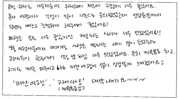 ![]() 혼자하는 여행 '파란여행'과 함께 해서 외롭지 않고 즐겁게 관광할수 있었습니다 차량, 숙소, 식사, 일정, 가이드님의 안내까지 처음에 패키지라서 걱정했던 게 무색하게 너무나 만족스러웠고, 새로운 인연들과 좋은 추억 쌓을 수 있게 도와주셔서 정말 감사합니다!! 사실 저도 주변의 추천으로 파란여행을 알게 되어 이용할 수 있던 건데 저도 앞으로는 주변에 강력히 추천할것 같아요 ᄒᄒ 파란여행과 함께 하는 퀘벡 여행 정말 즐거웠습니다. 강력추천!!~ ![]() 호텔 위치도 다운타운에 위치해서 저녁에 구경하기 너무 좋았어요. 혼자 여행이라 걱정이 많아 카톡으로 문의했었는데 상담원분께서 답변도 빠르고 친절하게 해주셔서 좋았어요! 여행은 물론 너무 좋았지만 제공되는 식사가 너무 맛있었어요!! 보통 여행사들에서 데려가는 식당은 별로라는 얘기 많이 들었는데 한식들이 한국에서 먹는 밥처럼 너무 맛있었어요. 특히 제육볶음 최고. 고기도 계속 더주시고bbb. 파란여행이 많이 신경쓴게 느껴졌어요ᄒ '파란여행', '고래사냥'(제육볶음집) 대박나세요~~~ ![]() 1. 편안하고 즐거운 여행입니다. 2. 가이드님 너무 친절하시고 재미있으십니다. 3. 올드퀘벡 내년에 파란여행과 또 오고 싶습니다. 4. 이동시간은 길지만 지루하지 않습니다. 5. 숙소 쾌적하고 이쁜 호텔입니다. 6. 자유시간도 충분히 주시고 맛집 리스트 및 관광순서까지 친절하게 안내해주십니다. 파란여행 강추합니다. ![]() 캐나다 처음 오신 엄마 모시고 처음 이용했습니다. 2박3일 동안 알차고, 즐거운 여행이였습니다. 짧은 기간 동안 정성스럽게 준비해주신 지도와 자세한 설명덕에 핸드폰으로 어디에 무엇이 있나 찾아볼 일이 별로 없어 정말 좋았습니다. 작은 디테일도 잘 챙겨주시고 퀘벡-몬트리올 여행이라고 캐나다에서 꼭 구매해가야 할 아이스 와인'을 선물로 주셨습니다. 즐겁고 잘 짜여진 일정 덕에 좋고 행복한 시간 보냈습니다. 선물 감사합니다~ 친절하고 디테일하게 2박3일 잘 챙겨주신 가이드님, 감사하고 수고하셨습니다~ from. 도깨비 신부 ![]() 패키지 여행 중에 가장 자유시간이 많았던 것 같아요. 떡분에 사진도 많이 찍고 현지에서 먹고싶은 것도 골라먹을 수 있었습니다. 강제 쇼핑대신 사고싶은 기념품만 딱 살 수 있었고, 몰랐던 정보도 많이 알아갑니다. 두 번째 캐나다 여행인데 아주 만족스럽고 알찬 여행이었어요 여행객들의 편의가 최우선이라는 느낌을 받아서 기분도 좋고 편안한 여행 할 수 있었네요 파란여행(나만 알고싶지만) 유명해졌으면 좋겠습니다 ![]() 많은 여행사 통해 여행을 다녀봤는데 처음 들어본 여행사였지만 너무 편안하고 즐거운 여행이었습니다. 좋은 숙소와 아름다운 절경 그리고 유머러스한 가이드님의 역사이야기까지 눈과 귀도 즐거웠지만 캐나다에 대한 많은 정보를 배우고 알게되어 유익한 시간이었습니다. 감사합니다. 지인이 캐나다 여행을 한다면 꼭 추천해드릴게요~ ![]() 3일 동안 세심하고 친절하게 훌륭한 가이드 선생님 노고에 감사합니다. 시간도 정확하게 지켜주시고 특히 음식점도 한국인의 입맛에 잘 맞아서 맛있게 먹었습니다. 전화기를 잘 다루지 못해 SNS 후기는 집에 가서 아들께 올려달라고 하겠습니다. 만족합니다 -초록색 모자 부부 올림- ![]() 2023년 10월 말 캐나다 동부 4박5일 상품을 좋은 기억으로 잘 마쳤습니다. 1도 지루하지 않고 천 부장님의 재미난 설명과 함께 편안한 호텔과 안전한 운전으로 끝까지 잘 마무리할 수 있어서 행복했습니다. 다음에 또 파란여행과 또 다른 상품으로 만날 수 있길바랍니다. ![]() 캐나다 동부여행을 계획하면서 인터넷 여러후기들을 검색하면서 알게된 '파란여행' 모두들 칭찬과 감사일색인 '파란여행'... 저 또한 칭찬과 감사를 드릴 수 있어서 좋았습니다. 세세한 안내와 설명, 재치있는 말씀으로 이동 중 전혀 지루하지 않아서 좋았습니다. 나중에 또 여행을 가게되면 꼭 '파란여행'을 다시 이용하고 싶어요! 4박5일 수고해주신 기사님 그리고 말투가 재미있으신 가이드님 감사드립니다 ![]() 자유여행과 패키지 중에 고민을 많이 했는데 결론적으로는 이번 2박3일 퀘벡 투어에 만족합니다. 정보수집 시간도 아끼고, 오히려 맛집 리스트까지 일일이 프린트로 다 뽑아주셔서 자유식 맛집도 가고, 관광도 수월하게 핵심포인트까지 다 본거 같아요! 나중에 기회가 된다면 다른 여행도 좋은 분들과 좋은 시간 보내고 싶어요. 덕분에 잘 쉬고 잘 놀다 갑니다. 파란여행 짱 아이스와인까지 최고! |
