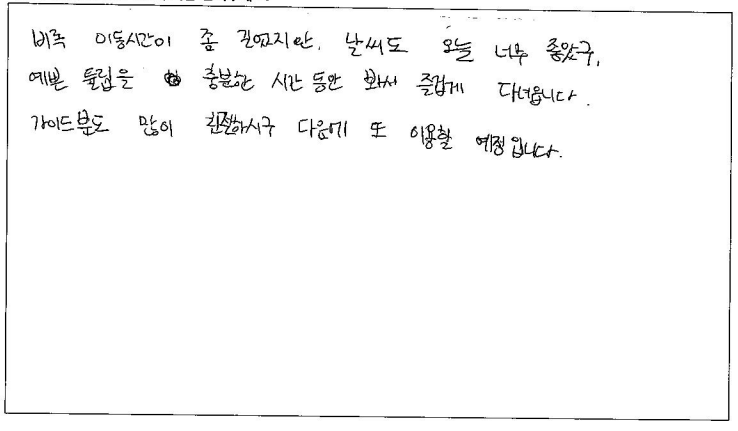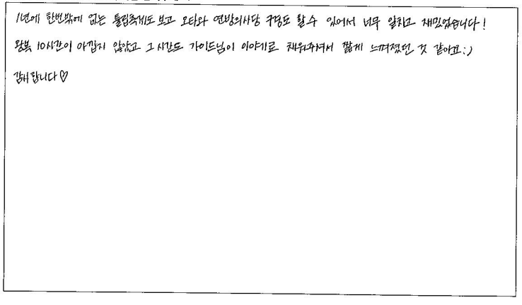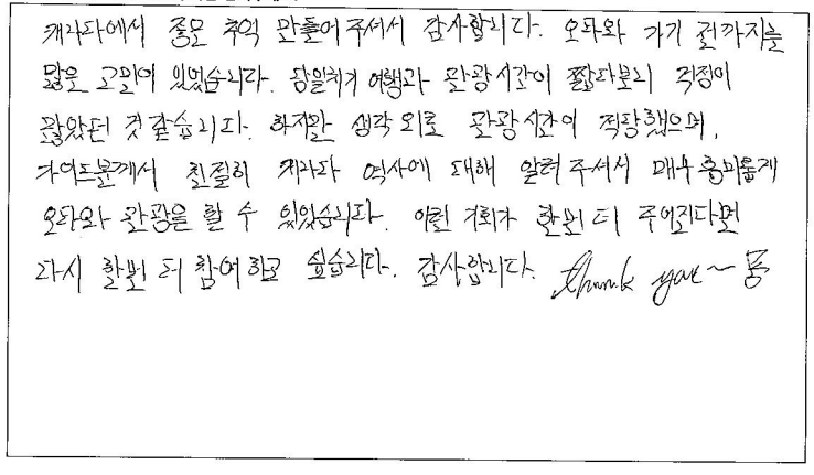 ![]() 이동시간이 길었지만 가이드님이 설명을 너무 재미있게 해주셔서 시간 가는 줄 모르게 다녀왔어요! 주변에서 추천 많이 해준 이유가 있는 투어였습니다! 꽃도 너무 예쁘고 즐거운 시간 보내고 왔어요! 혼자와도 가이드님이 사진 너무 잘 찍어 주셔서 괜찮았어요! 다음에 또 다른 투어 있으면 신청할게요! 쾌적하고 즐거운 여행 덕분에 잘했습니다! ![]() 당일치기 여행이라 가벼운 마음으로 시작할 수 있어서 좋아요 전체적으로 시간 분배가 적절했어요 빡빡하지도 않고요. 튤립반 사람반이지만 다양한 색깔의 튤립을 많이 볼 수 있었고요 잔디밭에 앉아서 흘러가는 물을 바라보며 집밥같은 맛난 도시락을 먹을 수 있는것도 좋네요. 김치도 계란말이도 모두 맛있었어요 화장실 걱정에 조심했던 커피는 연방의사당 근처에서 사들고 구경할 수 있어서 그것도 좋았어요 좁은 시내에서도 운전 잘하시고 가이드님도 설명 잘해주셔서 상식이 조금 생겼어요 모두 감사드립니다. 다음에 또 만나요. ![]() 오랫만에 운전하지 않고 편안한 마음으로 차안에서의 긴 시간이었지만 쾌적한 버스와 기사아저씨의 운전솜씨와 가이드님의 밝은 목소리로 오타와에서의 짧은시간이었지만 행복한 하루 나들이었습니다. 감사합니다!! ![]() 오랜만에 가족과 나들이 즐거웠습니다 가이드님도 친절하시고 비도 안오고 시간도 생각보다 여유로워서 사진도 많이 남겼어요 감사합니다! ![]() 캐나다에서 좋은 추억 만들어주셔서 감사합니다. 오타와 가기 전까지는 많은 고민이 있었습니다. 당일치기 여행과 관광시간이 짧다보니 걱정이 많았던 것 같습니다. 하지만 생각외로 관광시간이 적당했으며 가이드분께서 친절히 캐나다 역사에 대해 알려주셔서 매우 흥미롭게 오타와 관광을 할 수 있었습니다. 이런 기회가 한 번 더 주어진다면 다시 한 번 더 참여하고 싶습니다. 감사합니다. ![]() 튤립축제에 가고는 싶지만 일정을 하루 밖에 뺄 수 없거나 혼자 여행 계획하시는분들께 추천드립니다. 저는 혼자왔는데도 가이드님이 챙겨주시고 사진도 찍어주셔서 너무 좋았습니다. ![]() 비록 이동시간이 좀 길었지만, 날씨도 오늘 너무 좋았고 예쁜 튤립을 충분한 시간동안 봐서 즐겁게 다녀옵니다. 가이드분도 많이 친절하시고 다음에 또 이용할 예정입니다. ![]() 1년에 한번밖에 없는 튤립축제도 보고 오타와 연방의사당 구경도 할 수 있어서 너무 알차고 재미있었습니다! 왕복 10시간이 아깝지 않았고 그 시간도 가이드님이 이야기로 채워주셔서 짧게 느껴졌던 것 같아요 :) 감사합니다 |