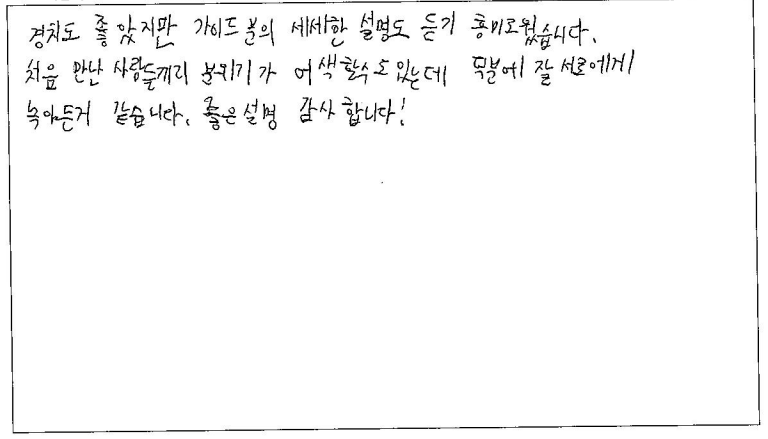 ![]() 참 좋은 날씨. 주변경관 가슴이 확트이고 맑은 공기 여유로운 날 맑은 호수의 풍경은 새로운 신천지였다. 토버모리의 산책로는 복잡한 생각과 찌든 마음의 힐링 장소로 손색이 없었다. 좀 쌀쌀한 날씨였지만 좋은 하루였었다. 기회가 되면 아들, 며느리 손자랑 언젠가 다시 한 번 오고 싶다. 가이드님의 친절함은 즐거운 여행에 청량제라 생각한다. ![]() 가이드님 너무 친절하시고 경치, 가이드, 체험 다 만족스러운 여행이었습니다. 가이드님이 너무 친절하셔서 여행이 조금 더 만족스러웠습니다 즐겁게 잘 갔다왔습니다. ![]() 가족끼리 알찬 여행하고 가는 거 같습니다. 가이드분께서 친절하셨습니다. 경치가 너무 아름다웠습니다. 도시락 최고 강추! ![]() 경치도 좋았지만 가이드분의 세세한 설명도 듣기 흥미로웠습니다. 처음 만난 사람들끼리 분위기가 어색할 수 도 있는데 덕분에 잘 서로에게 녹아든거 같습니다. 좋은 설명 감사합니다! ![]() 한국 거주자로서 한국서 볼 수 없는 아름다운 날씨 (맑고 푸른 하늘, 공기 아침날씨는 추웠지만 종일 여행자로서는 최상의 날씨) 이른 새벽 뻥 뚤린 도로를 달리는 기분 또한 최상의 날씨와 같다. 출발휴식 시간 가이드님의 상세한 일정 설명으로(유인물 함께) 잘 숙지 되어 토버모리 도착 작은 항구를 둘러보고 수상국립공원으로 향하는 배를타고 2층 배로 많은 사람들이 타고 내림. 에메랄드 같이 푸르고 맑은 바다같이 넓은 호수의 숲길을 가로질러 달리는 기분은 환상적. 수상공원에 도착 하니 추워서 따뜻한 해볕아래서 주문한 도시락을 먹고(기대치 이상의 점심) 맘마미아 영화속 같은 바다로 착각하는 호수에서 발도 담그고 갈매기를 가까이서 사진도 찍고 멋진 추억을 남기고 시간이 부족해 못다보고가는 것의 아쉬움을 남기고 많은 사진으로 담고 뒤돌아 보며 떠나옴. |