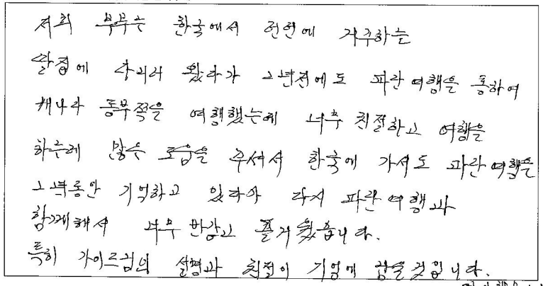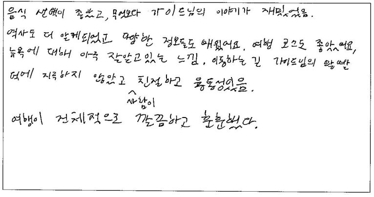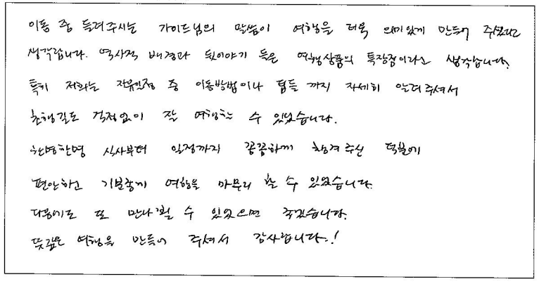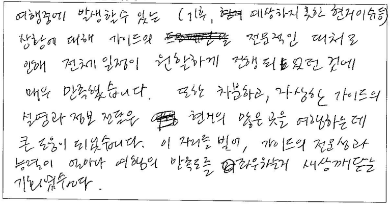 ![]() 알차게 짜여진 3박4일 뉴욕여행 상품에 매우 만족합니다. 전문 가이드님의 해박하고 전문적인 설명이 도움이 되고 즐거운 여행시간이 되었습니다. 최고급 버스와 기사님 또한 베테랑 기사님으로 여행이 더욱 좋았습니다. 가이드님의 전문적인 여행설명과 노련함으로 모두 즐거운 여행이었습니다. ![]() 여행중에 발생할 수 있는(기후, 예상하지 못한 현지 이슈 등) 상황에 대해 가이드의 전문적인 대처로 인해 전체일정이 원활하게 진행되었던 것에 매우 만족했습니다. 또한 차분하고, 자상한 가이드의 설명과 정보 전달을 현지 많은곳을 여행하는데 큰 도움이 되었습니다. 이 자리를 빌어, 가이드의 전문성과 능력이 얼마나 여행의 만족도를 좌우하는지 새삼 깨닫는 기회였습니다. ![]() 저희 부부는 한국에서 런던에 거주하는 딸집에 다니러 왔다가 2년 전에도 파란여행을 통하여 캐나다 동부쪽을 여행했는데 너무 친절하고 여행을 하는데 많은 도움을 주셔서 한국에 가서도 파란여행을 2년동안 기억하고 있다가 다시 파란여행과 함께해서 너무 반갑고 즐거웠습니다. 특히, 가이드님의 설명과 친절이 기억에 남을 것입니다. ![]() 부모님, 저희 부부, 그리고 아이들이 함께하는 뜻 깊은 여행이었습니다. 뉴욕에 차를 가져가서 고생했다는 얘기를 듣고 파란여행으로 예약했는데요. 관광지 스팟마다 데려다주시고 또 구경후에 그자리로 픽업와주시고 해서 짧은 시간에 몇군데의 장소를 둘러볼 수 있었어요 가이드분께서 자세한 설명도 해주셔서, 관광지마다 재미있게 구경할 수 있었구요 가이드분이 매우 자상하시고 편안하게 대해주셔서 패키지 여행이 처음인 저에게 패키지 여행의 선입견을 바꿔주셨습니다. 가이드님! 덕분에 오랜만의 가족여행 즐거운 추억 가득안고 집으로 돌아갑니다! 앞으로 또 만나뵙기를 바랄게요. 감사드려요~ ![]() 파란여행을 통해 퀘벡 2박3일 여행을 정말 즐겁게 다녀온 뒤 또 다시 여행을 갈 시간이 생겨 저의 버킷리스트 여행도시인 '뉴욕(3박4일)'을 신청하여 오게 되었습니다! 3박 4일 동안 정말 알차고 1분 1초를 낭비하지 않은 여행이었고 맨하튼에 입성하여 멀리서 바라본 뉴욕의 모습. 그 높은 빌딩 숲은 제 평생 잊을 수 없을 것 같습니다! 먼 거리와 긴 이동시간 묵묵히 안전운전 해준 기사님에게 감사드리고 뉴욕 3박4일 일정을 지루하지 않고 역사, 문화, 예술 다 방면에 대해 알려주시고 가이드 해주신 우리 가이드님께도 다시 한 번 감사의 인사를 드리고 싶습니다! 나중에 또 기회가 된다면 파란여행 3번째 후기를 쓸 수 있는 날이 오기를! 함께 여행했던 우리 팀들도 건강하고 행복하세요! 나중에 또 만나요 :) ![]() 이동 중 들려주시는 가이드님의 말씀이 여행을 더욱 의미있게 만들어 주셨다고 생각합니다. 역사적 배경과 뒷이야기들은 여행상품의 특장점이라고 생각합니다. 특히 저희는 자유일정 중 이동방법이나 팀들까지 자세히 알려주셔서 초행길도 걱정없이 잘 여행할 수 있었습니다. 한명 한명 식사부터 일정까지 꼼꼼하게 챙겨주신 덕분에 편안하고 기분좋게 여행을 마무리 할 수 있었습니다. 다음에도 또 만나뵐 수 있었으면 좋겠습니다. 뜻 깊은 여행을 만들어 주셔서 감사합니다! ![]() 친절한 가이드님과 함께하며 뉴욕을 알차게 다녀갑니다. 가이드님이 정말 친절하게 설명도 해주시고 선택관광(뮤지컬)도 도와주십니다. 제공되는 식사, 호텔, 차량 모두 만족스러우며 특히 식사가 한식으로 제공되어 미국 음식이 질릴 때쯔음 한식 보충이 됩니다. ![]() 뉴욕은 호자 다니기도 쉽지 않고 교통도 복잡하고 엄청 혼잡함과 동시에 가봐야할 관광명소들이 정말 많은데 파란여행과 함께 다니니까 스케쥴도 알차고 시행착오 없이 여행할 수 있어서 좋았어요 가이드님도 친절하시고 이동시간에 해주시는 설명 하나하나 재미있고 관광하는데에 도움이 많이 되었어요 또 관광지를 다니면서 포토스팟도 잘 챙겨주시고 사진도 계속 직접 찍어주셔서 좋았습니다. 버스도 매우 쾌적하고 기사님께서 운전도 잘하시고 친절하셔서 덕분에 어려움 없이 이곳저곳 편하게 다닐 수 있었어요 알찬만큼 힘들었지만 다시 방문해도 파란여행과 함께 다니고 싶습니다! 가족, 친구들과 함께와도 좋지만 혼자서도 충분히 따라갈 수 있는 일정이라 혼자서도 와보고 싶어요 ![]() 음식 선택이 좋았고, 무엇보다 가이드님의 이야기가 재밌었음. 역사도 더 알게되었고 다양한 정보들도 배웠어요 여행 코스도 좋았어요. 뉴욕에 대해 아주 잘알고 있는 느낌. 이동하는 길 가이드님의 언변 덕에 지루하지 않았고 사람이 친절하고 융통성이 있었음. 여행이 전체적으로 깔끔하고 훈훈했다. ![]() 패키지 여행은 처음이라 걱정을 했었지만 자유여행보다 시간을 절약할 수 있어서 좋았고 여러사람과 함께하는 여행의 즐거움도 알게 되었어요. 무엇보다 가이드님이 친절하시고 여행지에 대한 사전지식들을 가르쳐 주셔서 더 알찬 여행이 되었던 것 같아요. 감사합니다. |