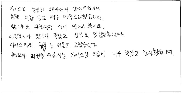 ![]() 딸과 소중한 추억으로 신청한 파란여행. 설렘과 기대반으로 시작. 스케쥴부터 탄탄하게 짜여 있어 가는 곳마다 너무 만족스러웠고 가이드님의 설명이 보태져 미리알고 가니 그곳의 다른면도 알 수 있어서 좋았습니다. 여행하게 되면 항상 식사, 호텔이 만족스럽지 못할 때가 있는데 '파란여행'에서의 식사와 호텔은 지금것 갔던 패키지와 다르게 정말 좋았습니다. 퀘벡에서의 딸과의 아름다운 추억 만들어 주셔서 감사합니다. 다음에 캐나다에 다시 오게 된다면 또 다른 코스 신청하고 싶어요 가이드님 기사님 여행내내 수고 많으셨고 감사합니다. ![]() 패키지 여행이라 처음에는 좋은 것도 잊고 싫은 것도 있겠다라고 생각하고 여행길에 올랐습니다. 하지만 여행이 시작되고 가이드님을 만나는 순간 신뢰감이 확 생겼습니다. 캐나다 현지에 오래 사셔서 캐나다 전역에 대한 풍부한 이해와 정보가 여행을 더욱 풍요롭게 만들어 주셨습니다. 호텔 너무 좋고요. 지정식은 한식 맛집으로 너무 좋고요. 자유식도 잘 고를 수 있도록 리스트 주셔서 너무 좋았습니다. 다른 여행도 파란여행으로 또 가고싶습니다. 또 만나요 가이드님 진심으로 감사합니다 ![]() 2박 3일 동안 퀘벡, 몬트리올 여행을 알차게 다녀올 수 있었습니다. 짧은 시간 안에 최고의 효율을 보여주었던 파란여행에게 감사합니다. 정말 오래전부터 가보고 싶었던 퀘벡이었는데, 덕분에 너무 소중한 기억을 가지게 된 것 같습니다. 좋은 추억을 남길 수 있어서 좋았습니다. 감사합니다. ![]() 매우 만족스럽고 즐거운 일정이었습니다. 그 동안 이용했던 여행사 중에 최고였습니다. '파란여행' 번창하셔서 자주 이용할 수 있도록 되었으면 좋겠습니다. 감사합니다^^ 아침식사가 있어서 더욱 좋습니다. 가이드님이 친절하시고 너무나 열심히 해 주셔서 감사드립니다. 좋은 기억만 남게해주셔서 다시 감사드려요. 파란여행 화이팅! ![]() 가이드님 열심히 해주셔서 감사드립니다. 호텔, 차량 등도 매우 만족스러웠습니다. 앞으로도 파란여행 다시 만나고 싶네요. 아침식사가 있어서 좋았고 한식도 맛있었습니다. 아이스와인 쿠키등 선물도 고맙습니다. 무엇보다 최선을 다하시는 가이드님 모습이 너무 좋았고 감사했습니다. ![]() 날씨마저 낭만적이었던 2박3일 퀘벡 몬트리올 여행 '파란여행' 적극 추천합니다!! 홈페이지 로고 처럼 날씨 빼고 모든 걸 꽉꽉 채워 준비 해 주셨더라구요~ 남편과 아이 둘과 함께한 여행이었는데 저희끼리 준비했다면 이렇게 알차게 보고 맛있게 먹고 편하게 쉴수 있었을까 싶습니다. 천섬 페리도 몬트리올 시내 여행에서도 포인트 딱딱 찍어서 설명도 잘해주셔서 여유롭게 즐길 수 있었어요. 오랜만에 먹을 수 있었던 한식도 깔끔하고 맛있어서 대만족 했고요. 특히 아이들이 좋아했어요 그리고 무엇보다 퀘벡 올드시티에 관해 열심히 조사해서 일일이 설명해주셔서 비오는 날씨 마저도 낭만적으로 즐길 수 있었어요. 가이드님 정말 감사드려요~ 정말 복 받으실거에요~ 저희는 잊을 수 없는 추억을 얻어갑니다 감사합니다! ![]() 처음 가보는 곳이라서 기대가 많았는데 픽업부터 차량, 가이드님, 식사 등등 여러 분야들이 만족스러웠고, 쇼핑 시간이 없어서 부담없이 여행을 할 수 있었습니다. 중간중간 선물(아이스 와인 등)도 주셔서 더 기분 좋게 여행했습니다. 왜 파란여행을 이제야 알았나 싶어요~ ![]() 여행기간 내내 친절한 가이드님과 안전하게 운전해 주신 기사님과 함께 해서 감사했다. 다운타운 근처에 있는 숙소여서 다니기도 편했고, 무엇보다 조식이 포함되어 있어서 좋았다. 다음 캐나다 여행도 '파란여행'과 함께 하고 싶다. ![]() 덕분에 즐겁게 여행을 잘 했습니다. 알차고 재치있게 가는 곳곳마다 잘 소개해주심에 감사드리고 호텔 또한 좋았고 가이드님이 2박3일 동안 지루하지 않게 저의 눈과 귀를 즐겁게 해주심에 진심으로 감사드립니다. ![]() 저희부부는 미국 캘리포니아에서 캐나다로 '파란여행'을 통해 동부로 여행을 왔다. 4박5일의 여행은 즐거웠다. 무엇보다도 가이드의 재치있는 말로 지루하지 않은 여행을 즐길 수 있었다. 음식과 호텔 모든 것이 마음에 들었다. 너무나 감사하고 함께 여행한 모든 분들에게도 고맙다고 전하고 싶다. ![]() 여행코스도 좋았고 열정적인 가이드님 설명도 좋았습니다. 호텔 위치, 식사 모두 좋았습니다. 현지 여행사에 대한 신뢰가 높아졌습니다. ![]() 호텔 위치가 너무 좋고 퀘벡에서 자유시간이 많은 것이 좋았습니다. 정말 날시 빼고는 다 준비하셨다는 것처럼 날씨빼고 다 좋았어요! 주변 맛집이나 지도를 준비해주셔서 더 편하게 여행할 수 있었습니다. 좋은 추억 만들 수 있었어요 감사합니다 :) |