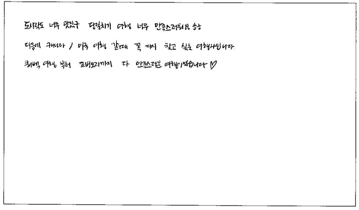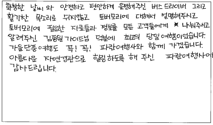 ![]() 오늘 토버모리 1일 투어는 정말 즐거웠습니다. 화창한 날씨로 여행하기에 참 좋았습니다. 그리고 버스안에서 가이드님의 캐나다 역사와 배경을 들으면서 먼거리가 전혀 지루한지 몰랐습니다. 토버모리의 아름다운 풍경을 바라보면서 마음이 편안해지고 도시의 생활에서 벗어나 오래간만에 눈 호강을 했습니다. 안정적인 운전, 친절하시고 유쾌하신 가이드님, 좋은날씨... 최고였습니다. 가을단풍 여행에도 파란여행과 함께 Go~Go~ 그리고 짱! 이신 가이드님과 함께 가고 싶어요. '파란여행'에 감사드립니다~~ ![]() 토버모리 가는 동안 차량안에서 가이드님이 이것저것 잘 설명해 주셔서 심심치 않게 재미있었습니다. 개인시간도 잘 보장되어서 친구들과 좋은 시간 보낼 수 있었습니다! ![]() 혼자 가기 힘든 곳을 안전하게, 가이드님이 친절한 설명과 함께 편하게 다녀와서 좋아요~ 앞으로 자주 이용할게요 ![]() 도시락도 너무 맛있구 당일치기 여행 너무 만족스러워요 ㅎㅎ 다음에 캐나다/미국 여행 갈 때 꼭 다시 찾고 싶은 여행사입니다. 퀘벡 여행부터 토버모리까지 다 만족스러운 여행이었습니다! ![]() 친구들의 추천으로 파란여행을 통해 토버모리 관광을 하게 되었는데 가이드님의 너무 친절하시고 운전을 잘해주셔서 좋았어요 친구들과 좋은 추억 많이 남기게 해주셔서 감사합니다. ![]() 4박 5일 동부여행에 이어서 토버모리에 오게 되었는데 도시락도 너무 좋았고 자연도 너무 이뻐서 제대로 힐링했어요! 친구들과 같이 여행온게 처음인데 잊지못할 기억 많이 만들었어요 감사합니다! ![]() 화창한 날씨와 안전하고 편안하게 운전해주신 버스 드라이버 그리고 활기찬 목소리로 쉬지않고 토버모리에 대해서 설명해주시고 토버모리에 필요한 자료들과 정보를 모든 고객들에게 나눠주시고 알려주신 가이드님 덕분에 최고의 당일여행이었습니다. 단풍여행도 꼭 꼭! 파란여행과 함께 가겠습니다. 아름다운 자연경관으로 힐링하도록 해주신 파란여행에 감사드립니다. ![]() 첫 새벽에 파란여행에 도착! 친절한 가이드님 소개. 편안한 차량 운전 잠깐의 캐나다 역사 속 한국과의 이야기를 들으며 울컥 감동했고요 너무도 많은 토버모리 호수를 보고 깜놀했어요 맛있는 도시락을 호수에 발담고 시원하게 먹을 수 있어서 행복했습니다. ![]() 잠깐의 쉼과 힐링을 위하 1일여행으로 너무 좋은 상품입니다. 멀리 중국에서 오랜만에 가족들 모두 소중한 시간을 보내고 갑니다 한국에서는 볼 수 없는 캐나다의 자연 ^^ 파란하늘과 옥빌 호수가 어우러진 인상깊은 자연 토버모리를 보고갑니다. 도시락은 꼭 드셔보세요. 간편하게 먹을 수 있고 무엇보다도 맛이 끝내줬습니다. 파란여행 무한 발전을 응원합니다 ![]() 1일 투어로 즐거운 시간을 보냈습니다. 여름에 물놀이하고 예쁜 풍경 보기 좋은 곳이에요~ 친구 가족들과 특별한 추억 쌓고 싶을 때 추천합니다~ |